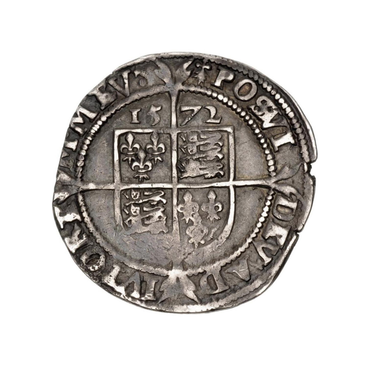 House of Tudor. Queen Elizabeth I, 1558-1603 AD. Silver Sixpence. Tower (London) mint, dated 1572, Ermine mintmark. Crowned bust of Elizabeth left, wearing ruff; rose to right, ELIZABETH DG ANG FR ET HIB REGINA / Coat-of-arms over long cross fourchée, POSVI DEVM ADIVTOREM MEV 1572.