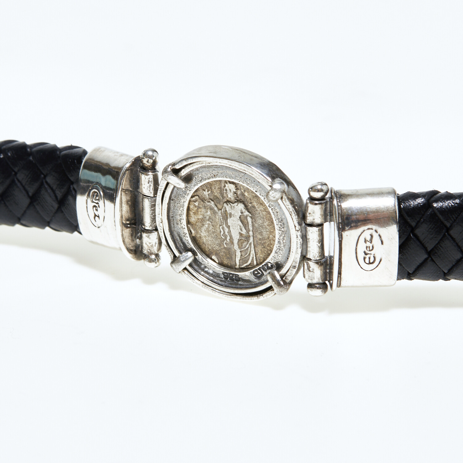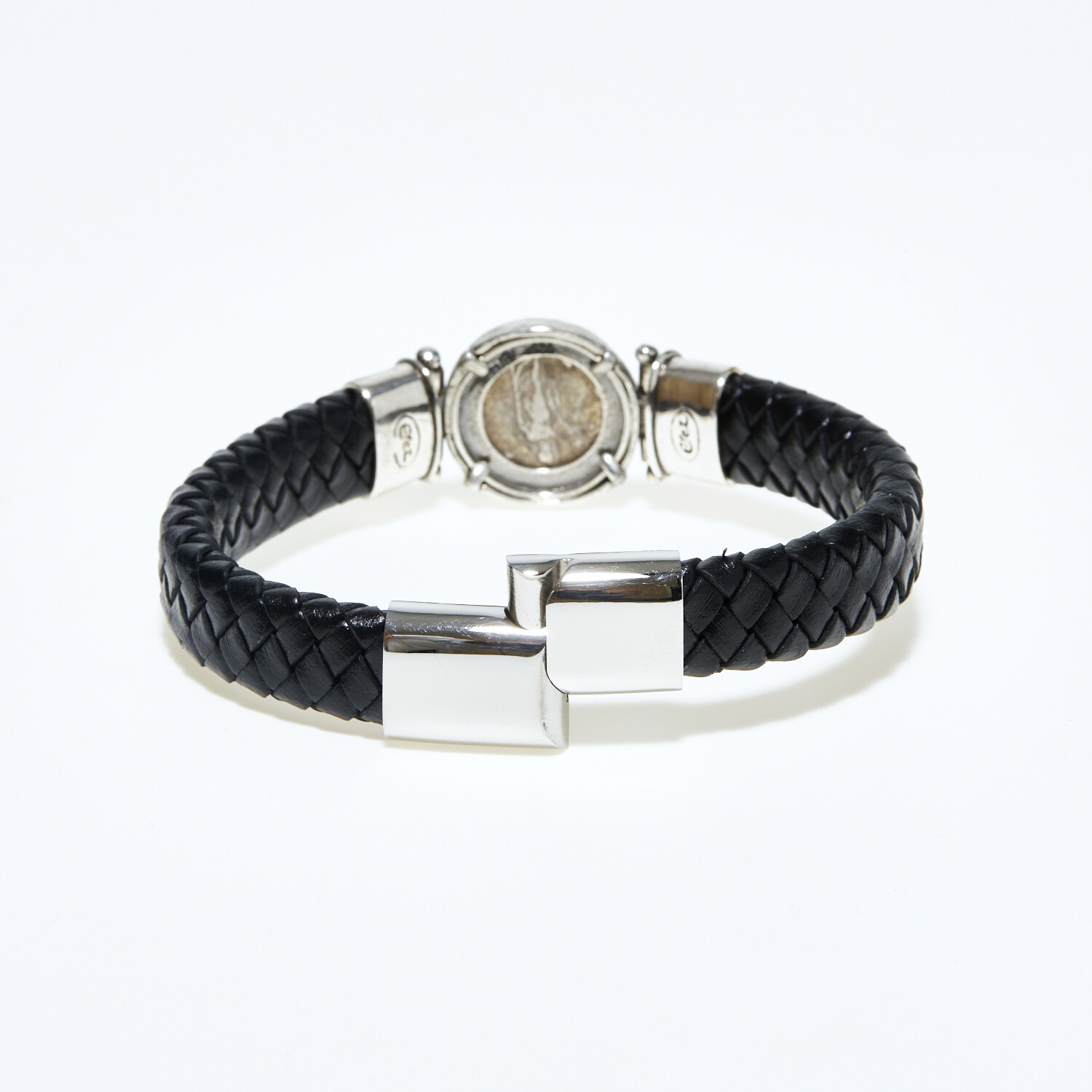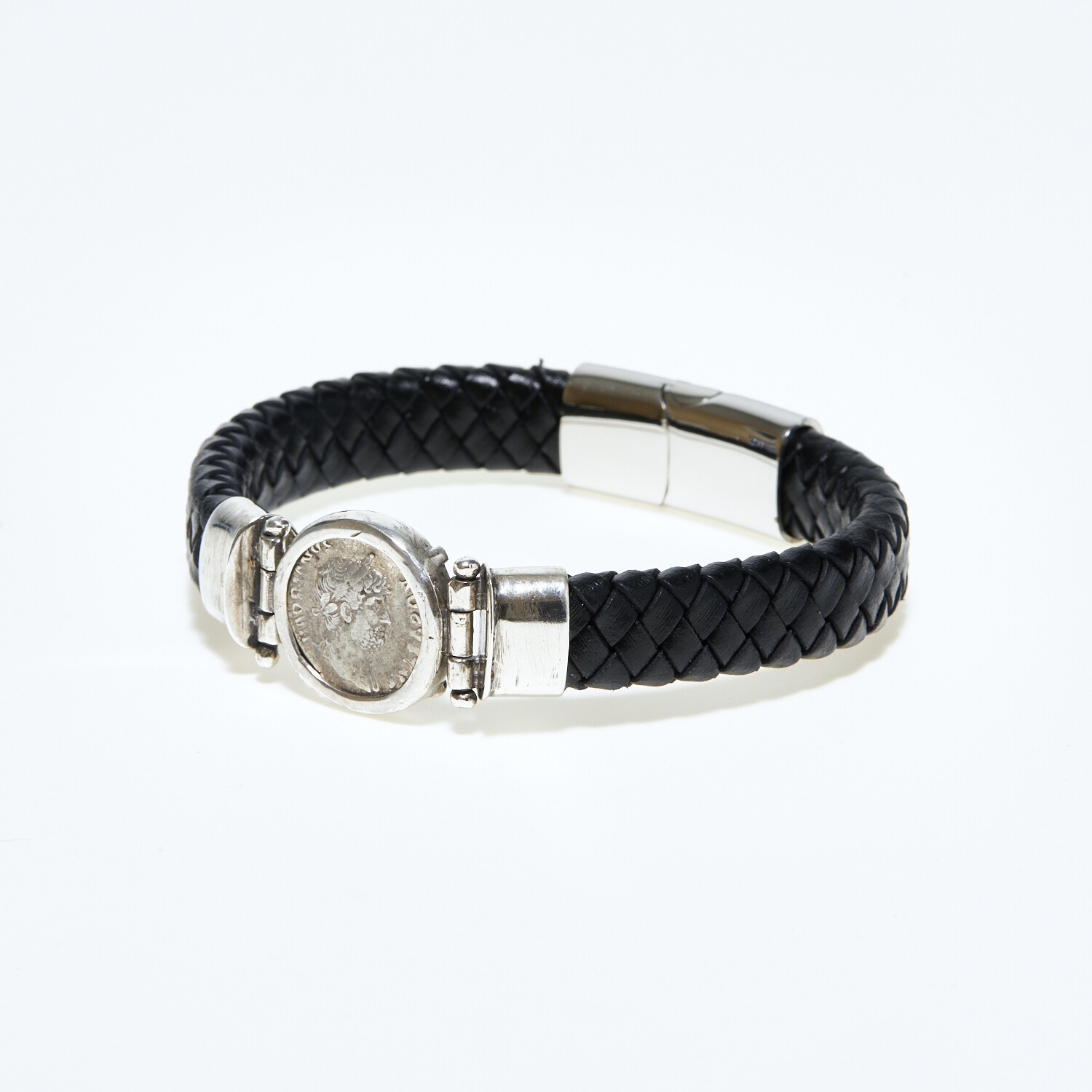 Ancient Rome. Hadrian (117-138 AD). Excellent silver denarius, set into a .925 silver and leather men’s bracelet. Coin struck at Rome mint, and depicts his laureate head right, HADRIANVS AVGVSTVS around. The back depicts Spes (the Roman goddess of Hope) walking left, holding flower and raising the hem of her skirt, COS III around. An incredible portrait of the Roman emperor Hadrian! A fantastic and wearable jewelry piece, the clasp slides laterally to be securely opened and closed.