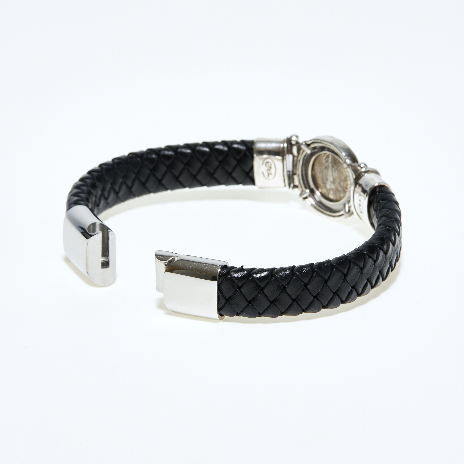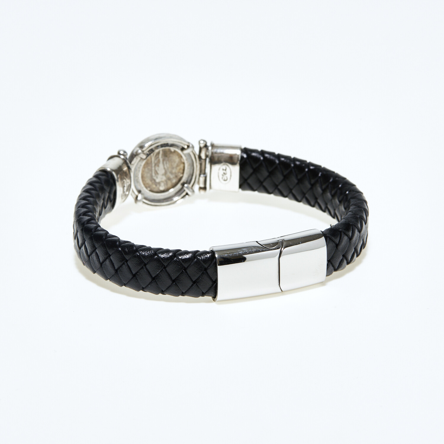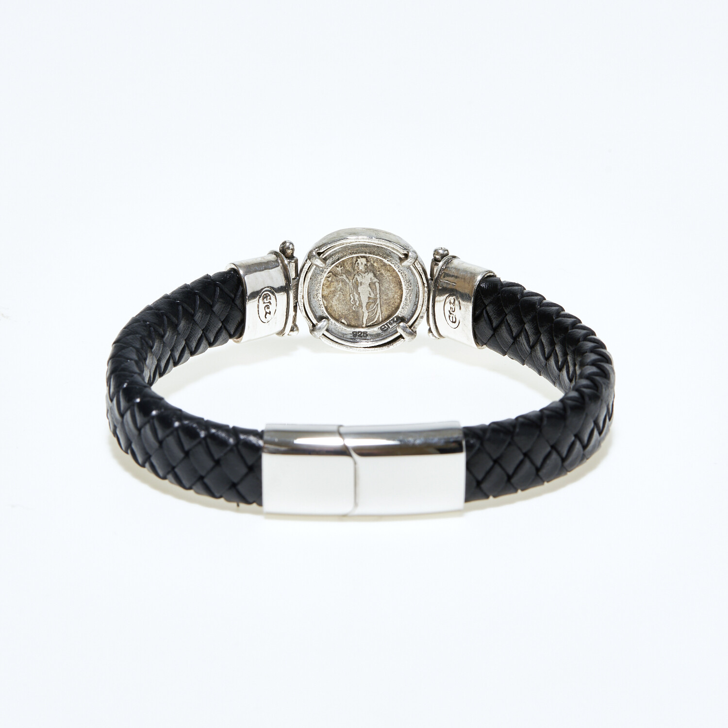 Ancient Rome. Hadrian (117-138 AD). Excellent silver denarius, set into a .925 silver and leather men’s bracelet. Coin struck at Rome mint, and depicts his laureate head right, HADRIANVS AVGVSTVS around. The back depicts Spes (the Roman goddess of Hope) walking left, holding flower and raising the hem of her skirt, COS III around. An incredible portrait of the Roman emperor Hadrian! A fantastic and wearable jewelry piece, the clasp slides laterally to be securely opened and closed.