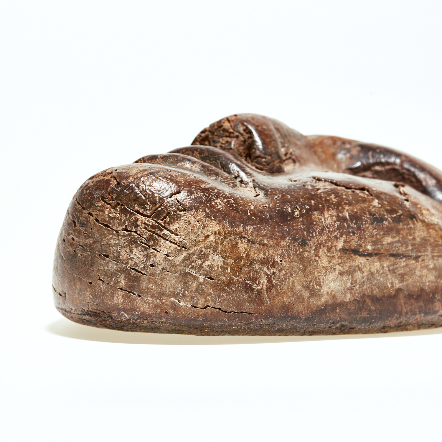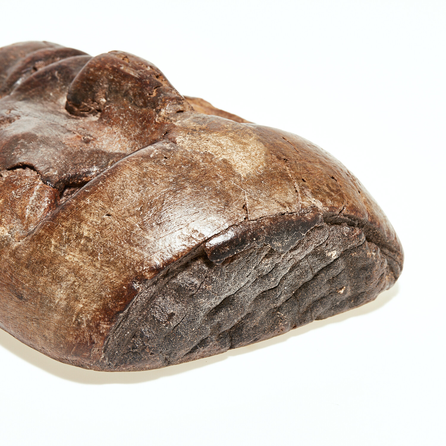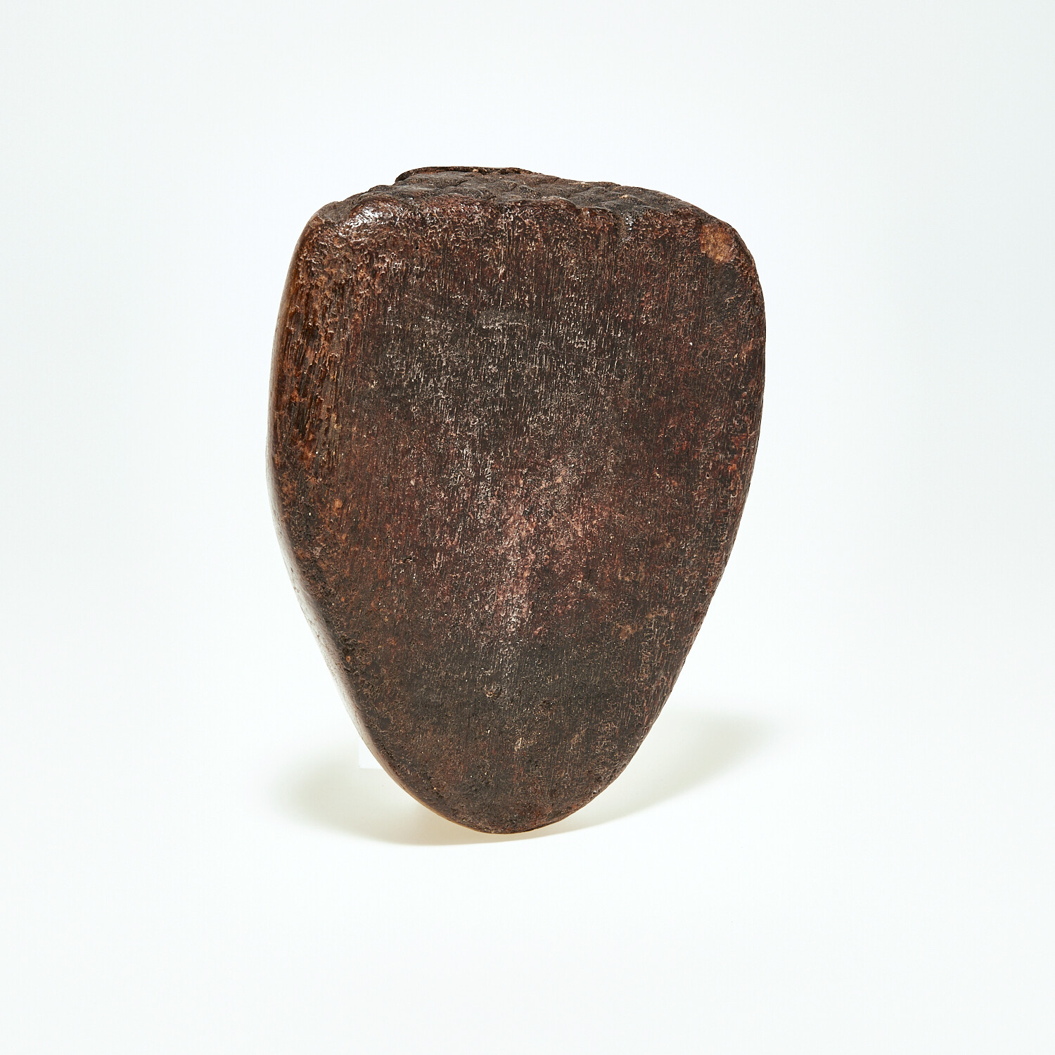 A very spooky and interesting old 1920s-1930s wooden mask found in an abandoned 1930s factory. Imagine looking down upon this through the dust and debris! This was an old wooden form for fitting papier-mâché for making masks for the garment industry. It has a deep brown patina, and a serious ambiance about it that is hard to place words upon. This exact mask has been looked at by the Hollywood circuit, with consideration of placement in a variety of spooky TV features (none yet have come to pass). It is basically life-size, measuring 7” x 5.75”.