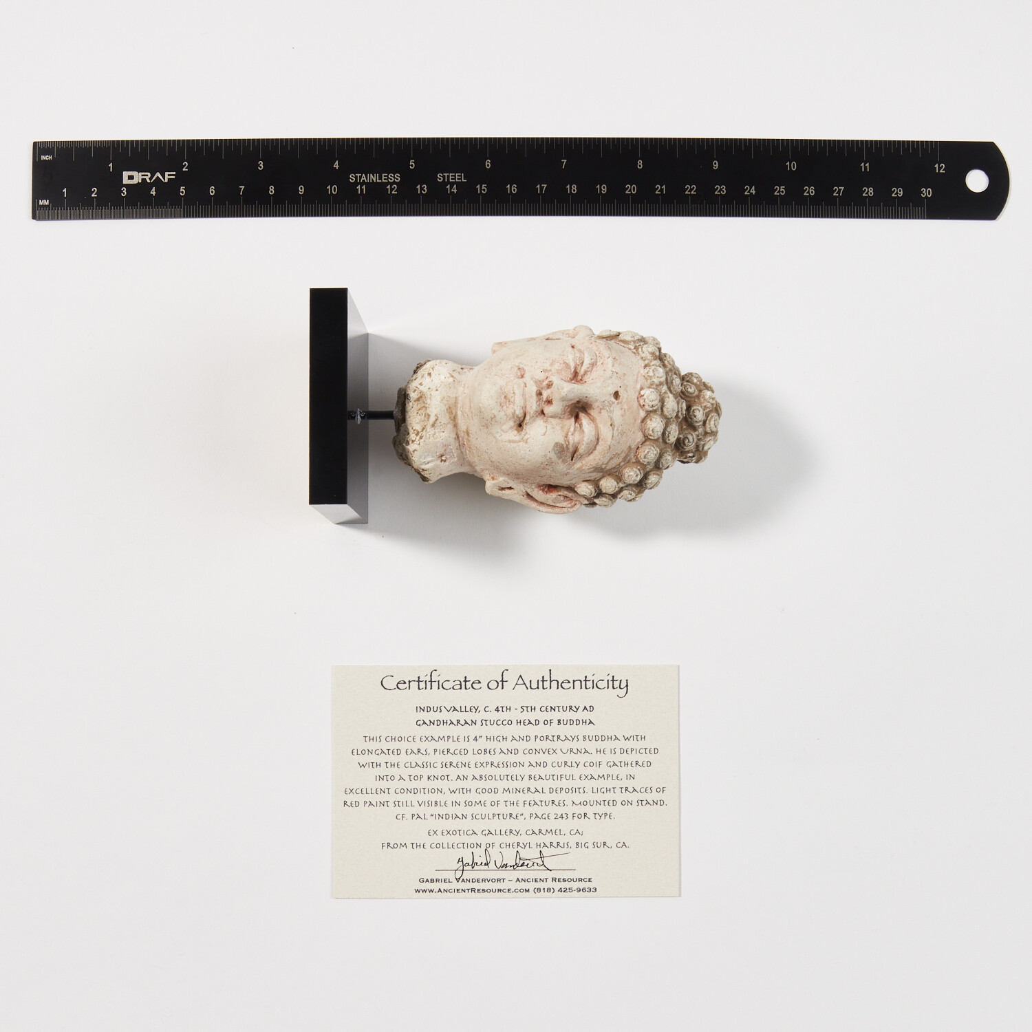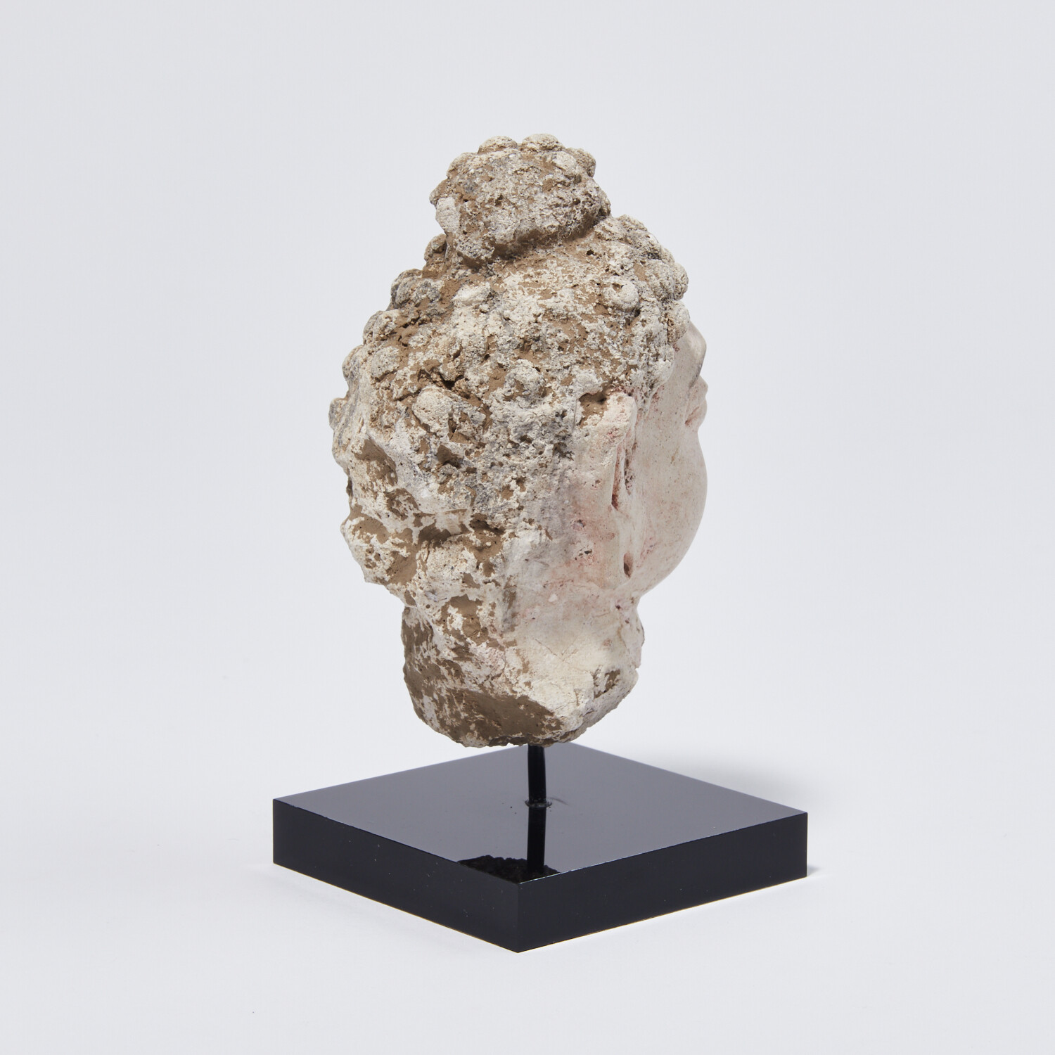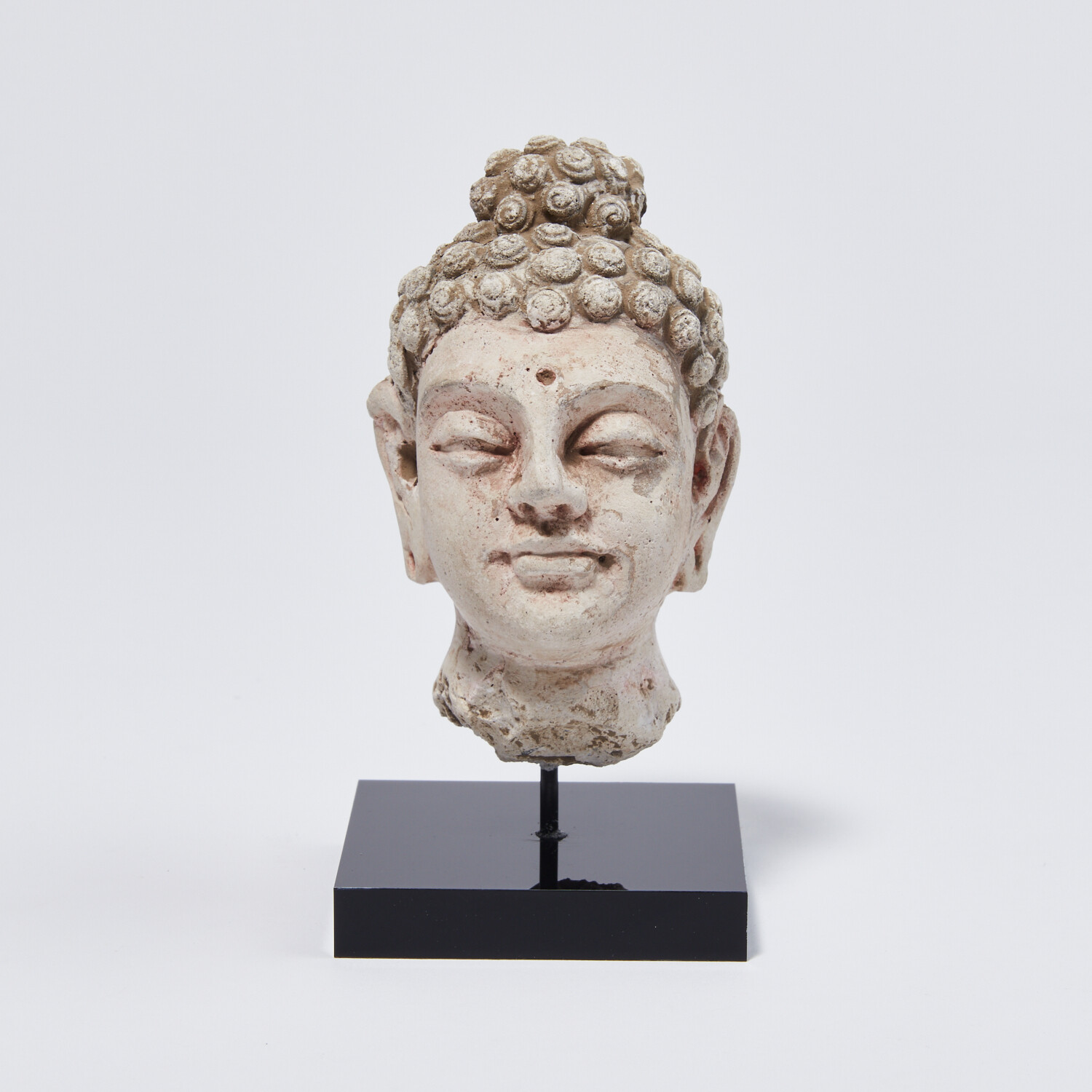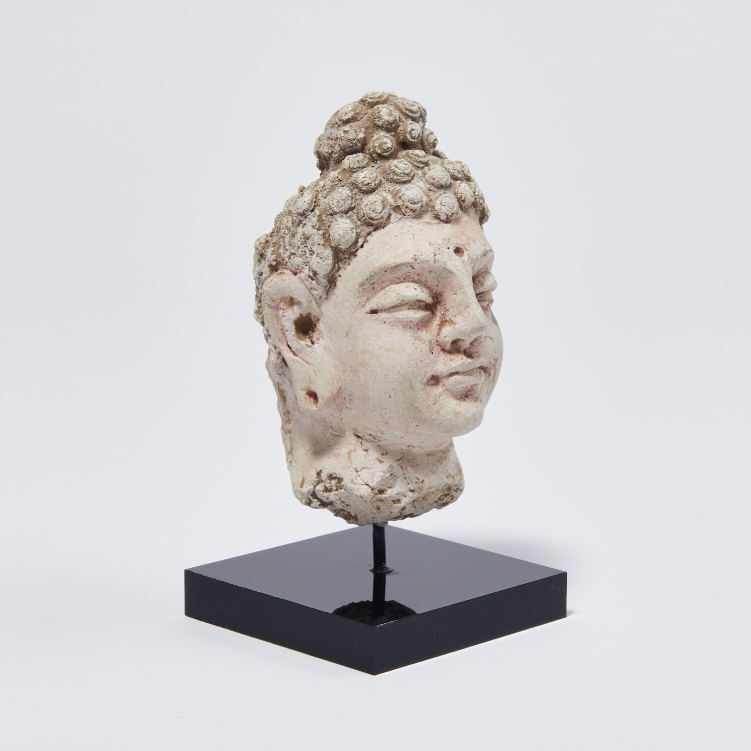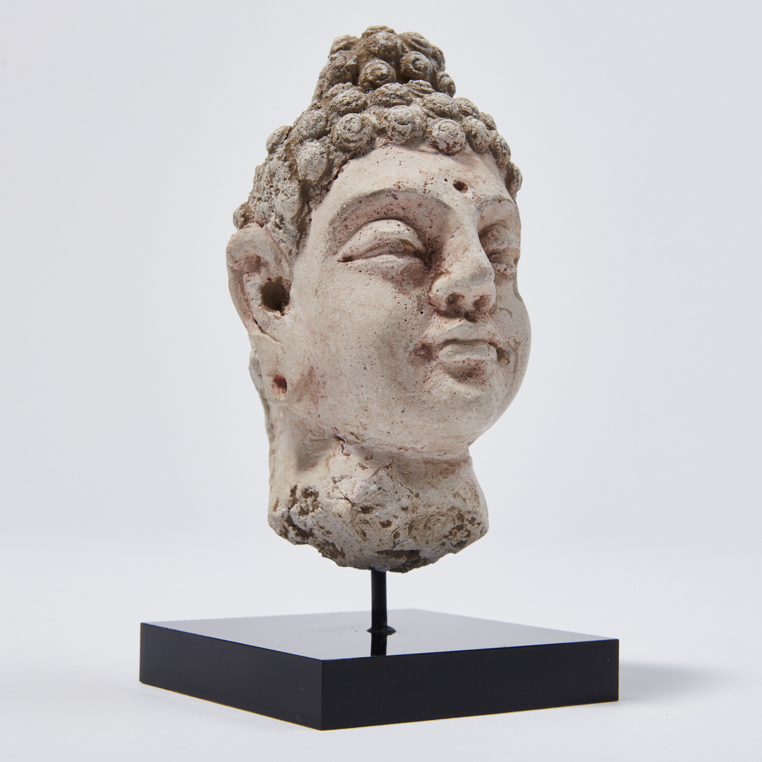 A beautiful Gandharan stucco head from the Indus Valley, ca. 4th-5th Century AD. This choice example is 4” high and portrays Buddha with elongated ears, pierced lobes, and convex Urna. He is depicted with the classic serene expression and curly coif gathered into a top knot. An absolutely beautiful example, in excellent condition, with good mineral deposits. Light traces of red paint still visible in some of the features. Mounted on stand.