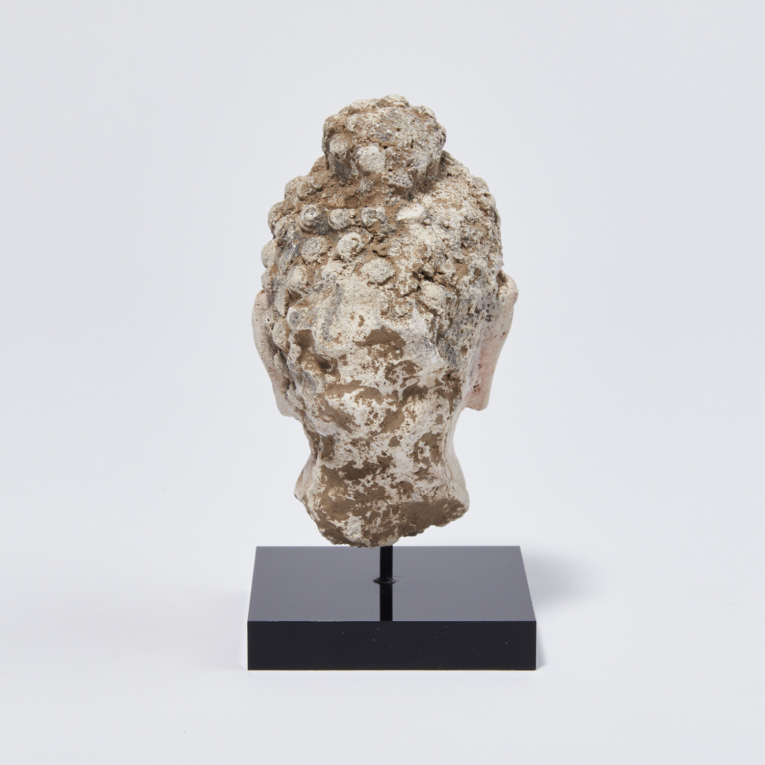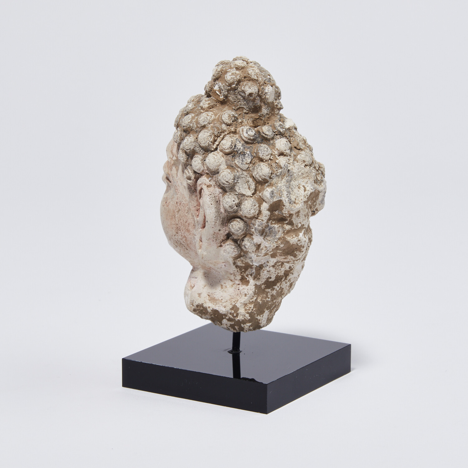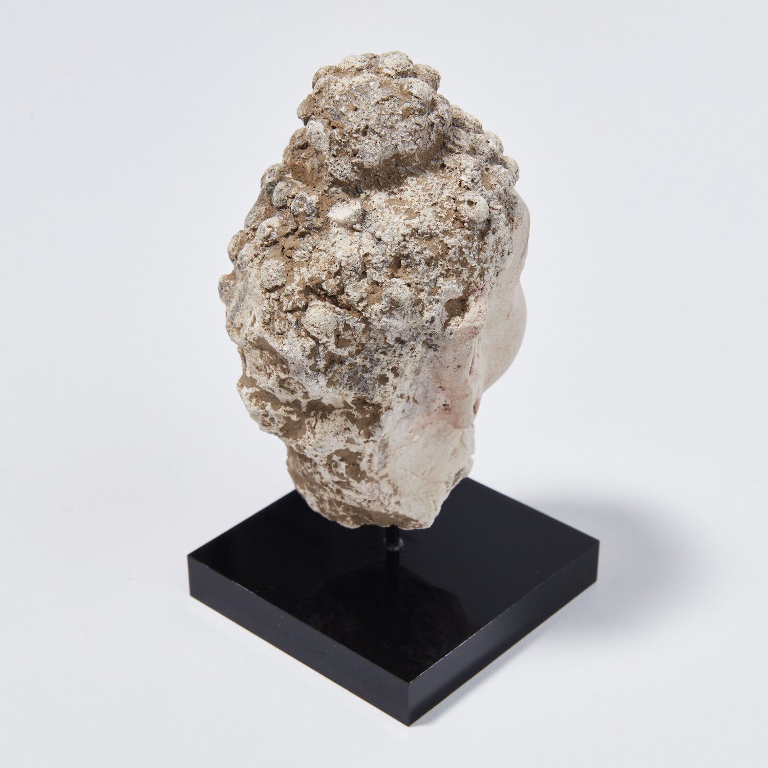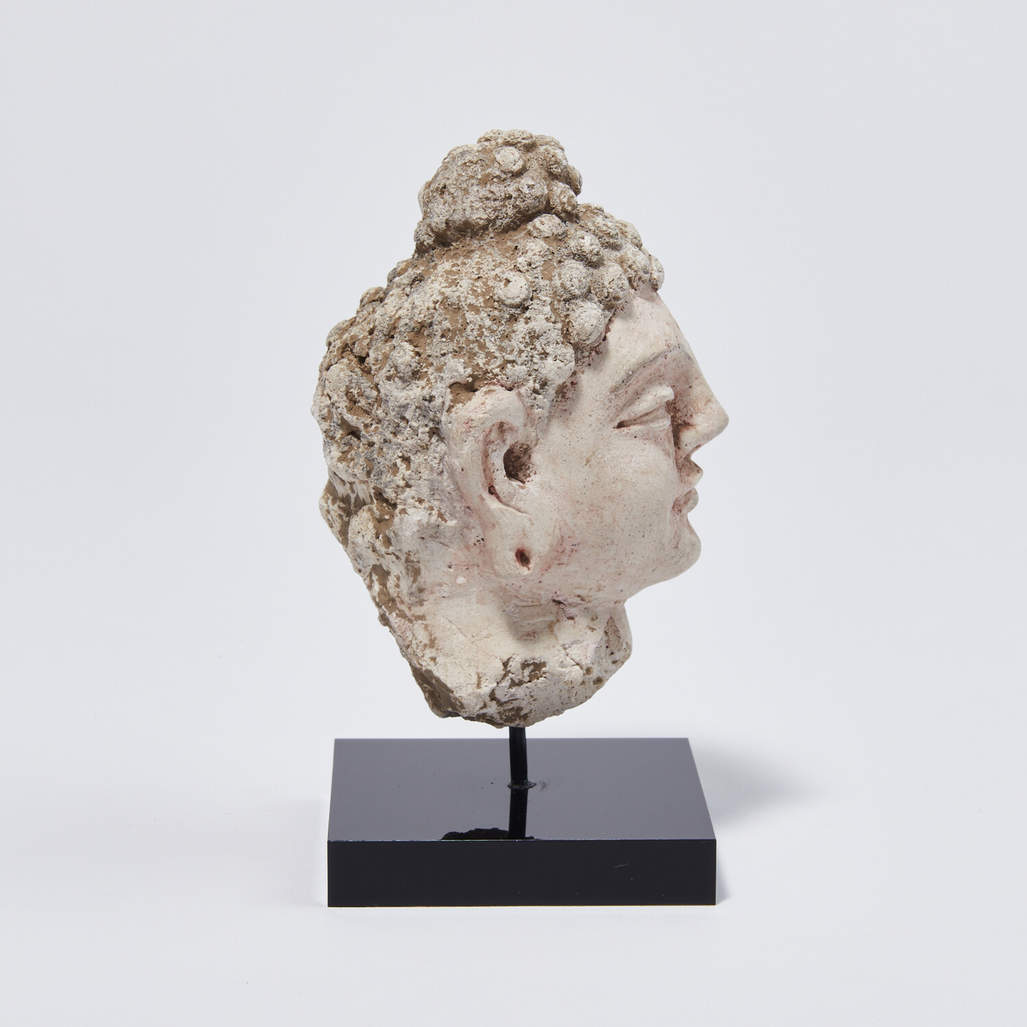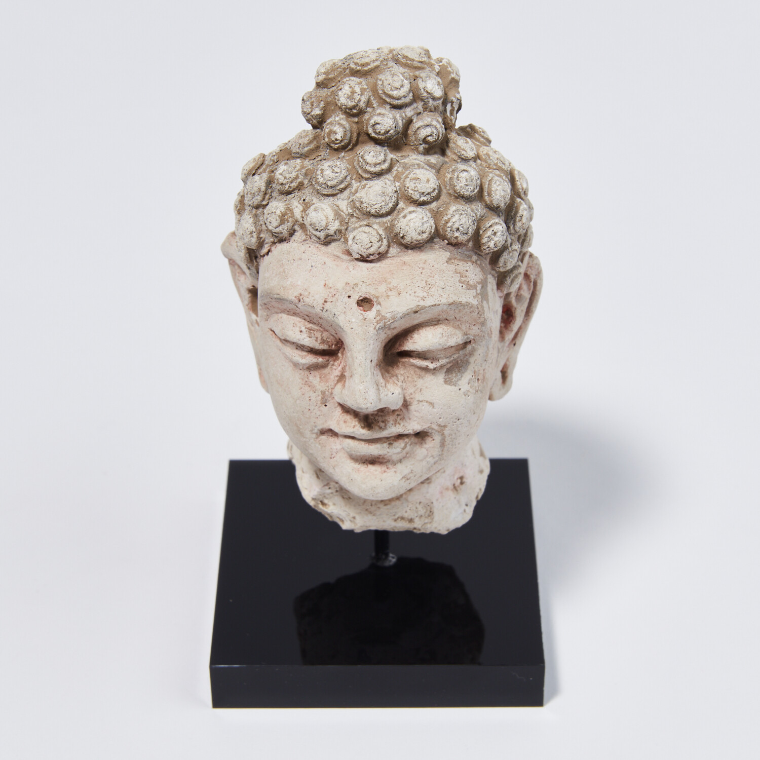 A beautiful Gandharan stucco head from the Indus Valley, ca. 4th-5th Century AD. This choice example is 4” high and portrays Buddha with elongated ears, pierced lobes, and convex Urna. He is depicted with the classic serene expression and curly coif gathered into a top knot. An absolutely beautiful example, in excellent condition, with good mineral deposits. Light traces of red paint still visible in some of the features. Mounted on stand.