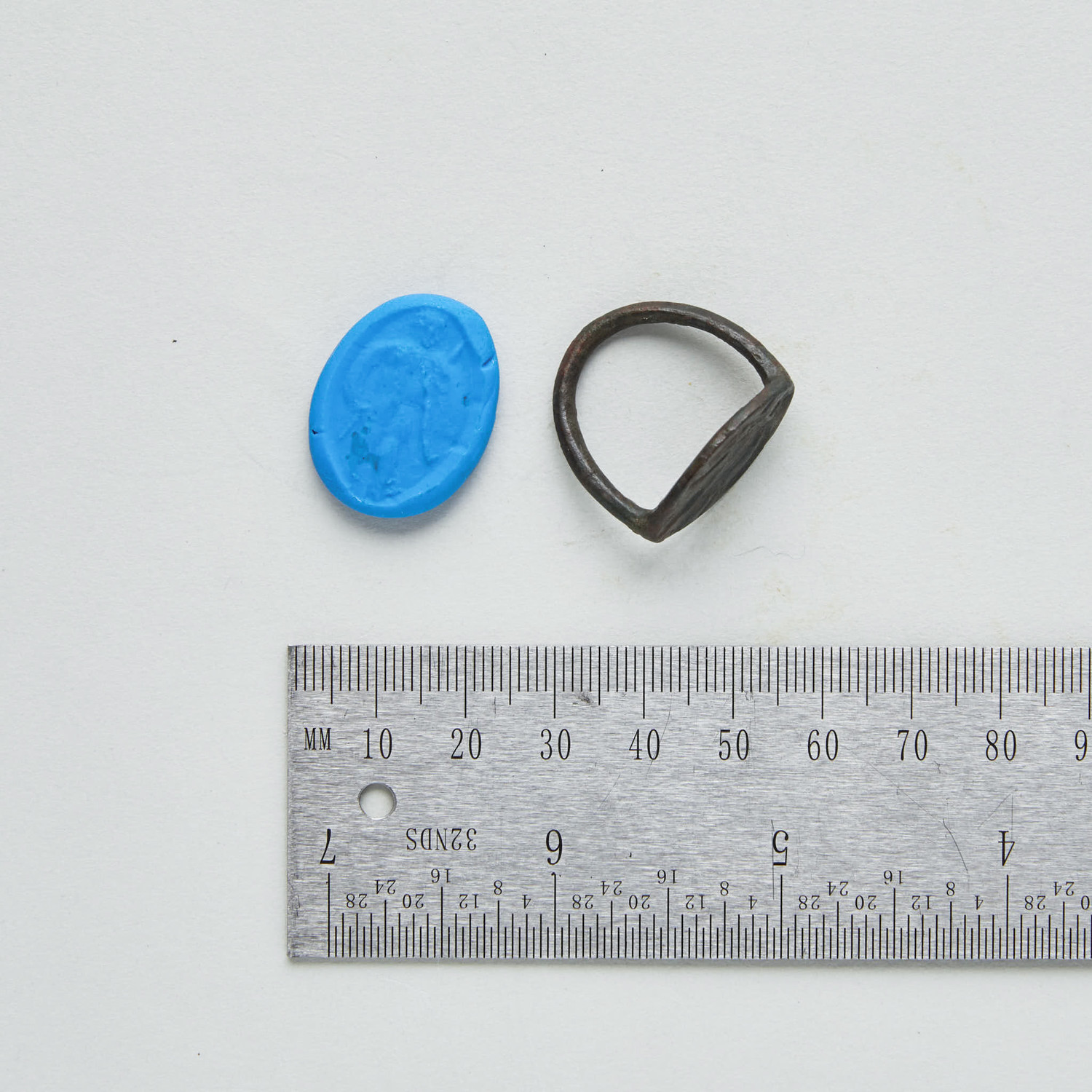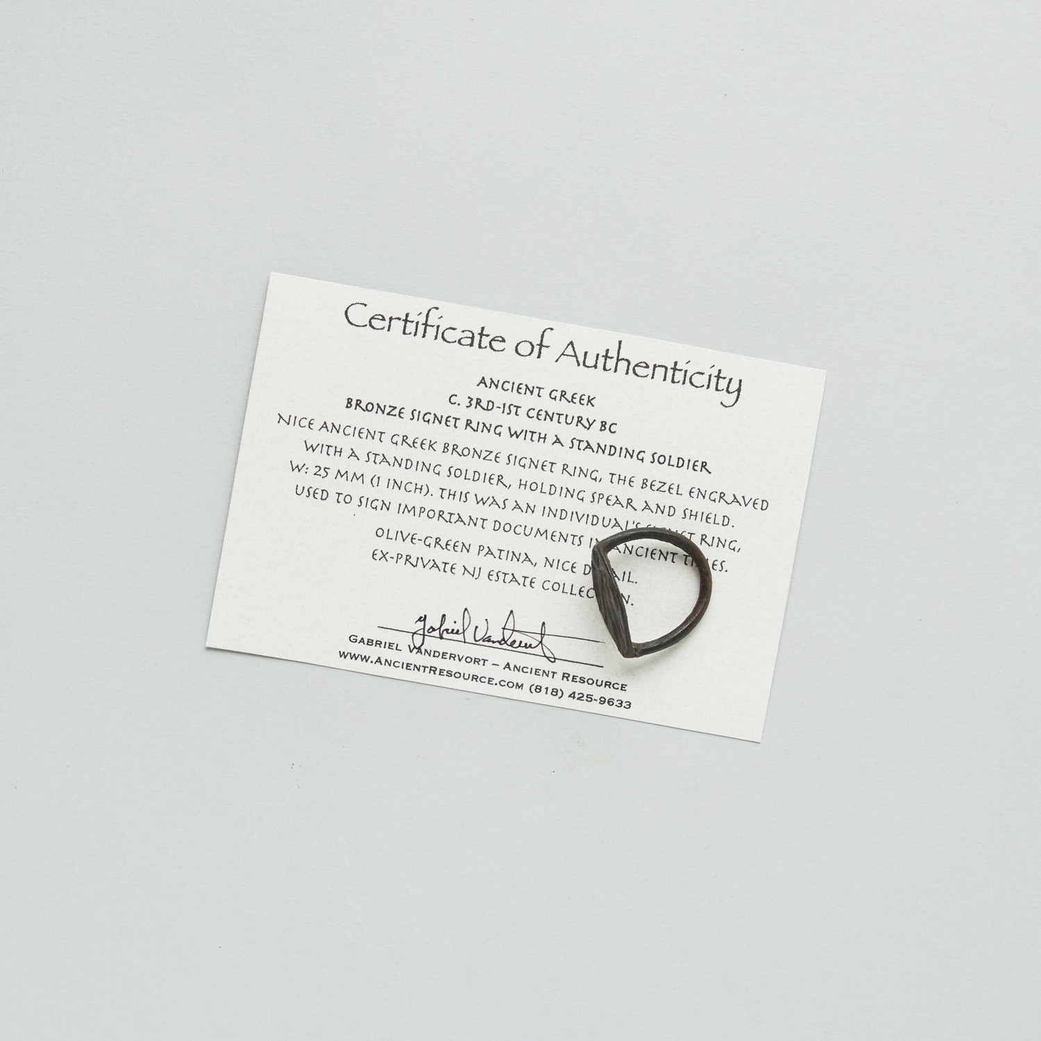 From Ancient Greece, c. 3rd-1st century BC comes this bronze signet ring, the bezel engraved with a standing soldier, holding spear and shield. This was an individual's signet ring, used to sign important documents in ancient times. Comes with clay impression. Olive-green patina, nice detail.