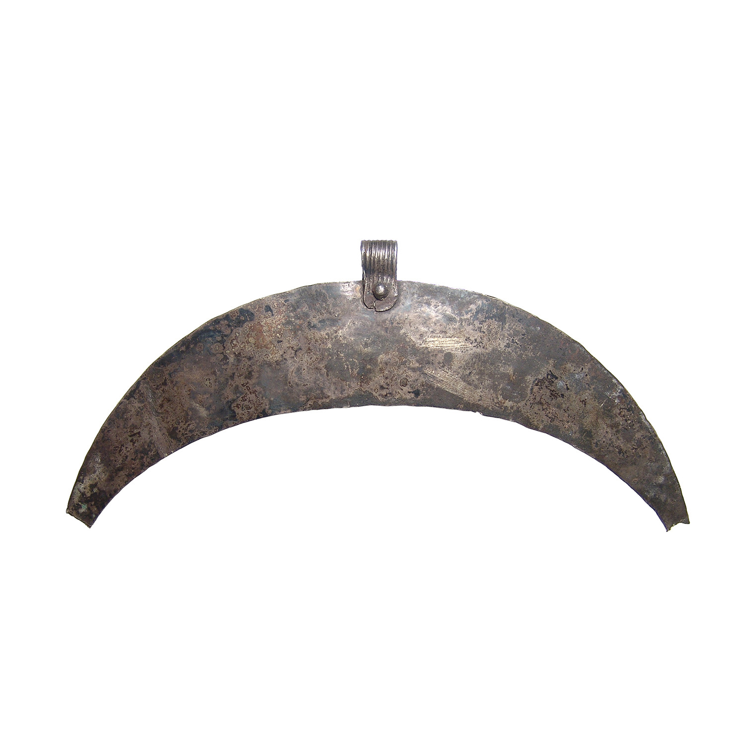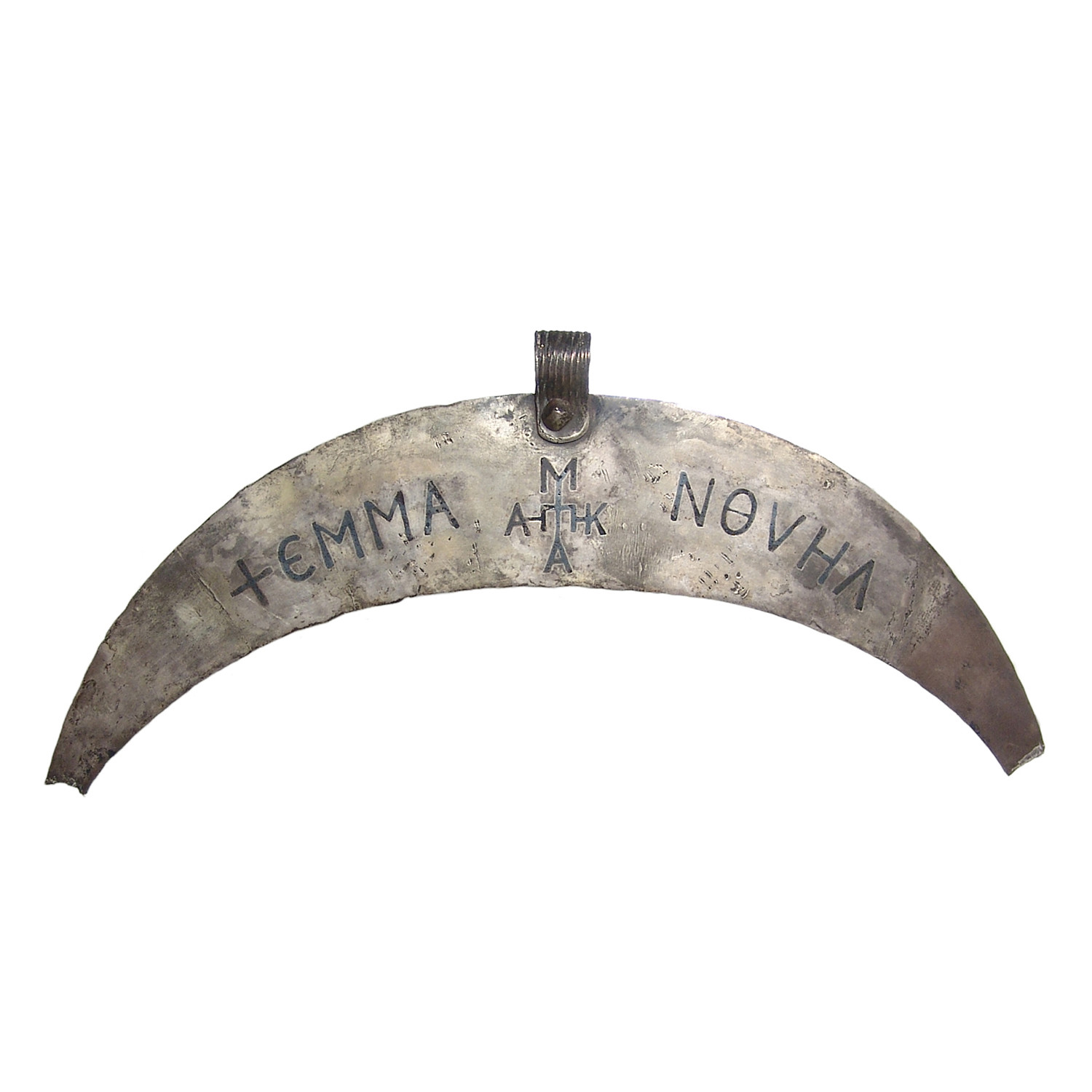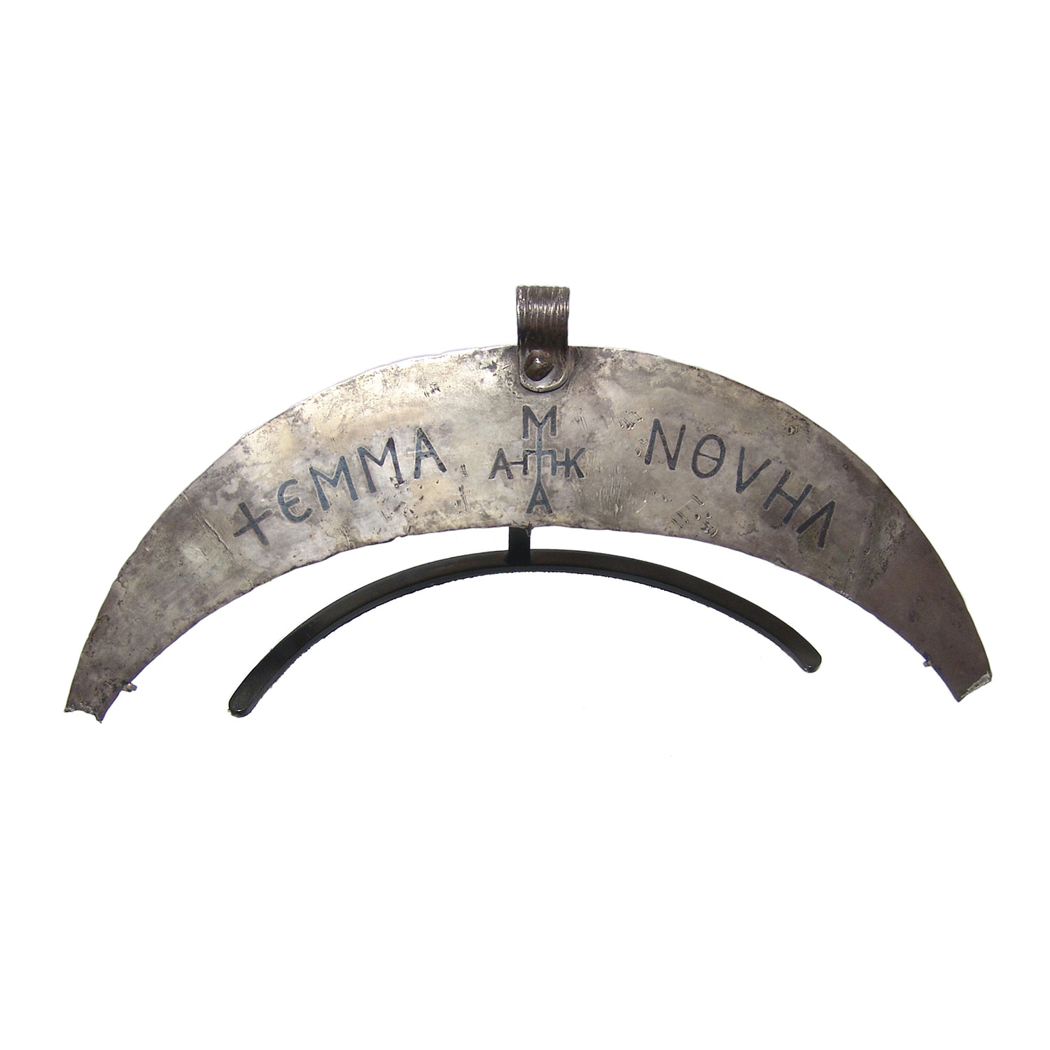 This is a Byzantine silver and niello crescent ceremonial pectoral, c. 7th - 9th Century AD, with inlaid lettering reading '+EMMA NOVHA', with a central monogram, central loop for suspension with vertical ridges. A rare and attractive piece with custom metal stand.