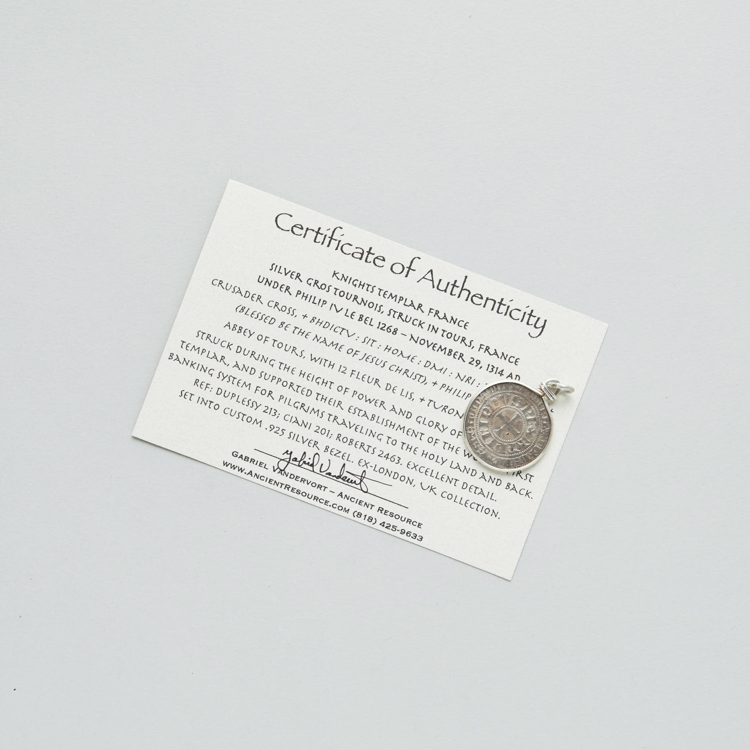 This bezeled coin is a Knights Templar France Philip IV Le Bel, minted at Tours between 1304 and 1307 AD. It features a border of twelve fleur-de-lis.