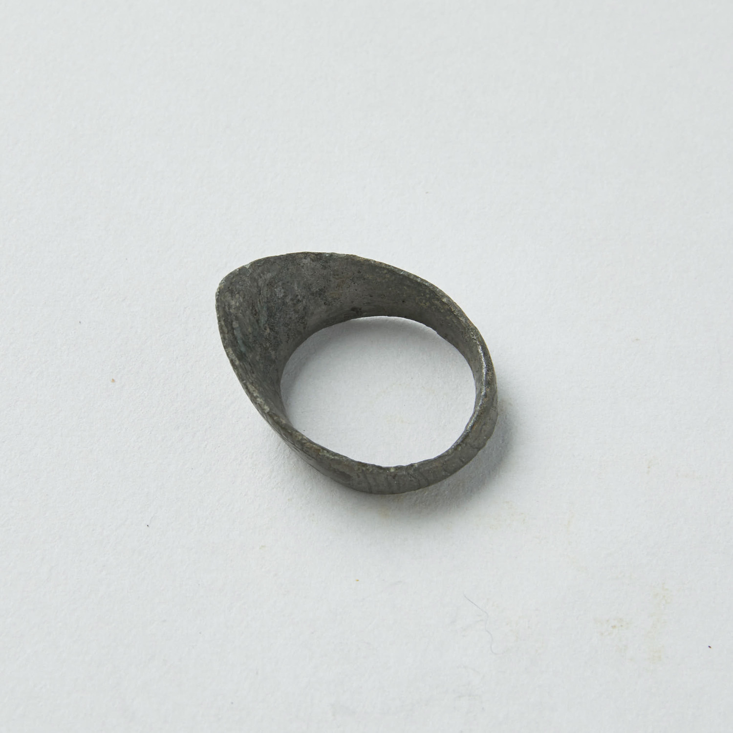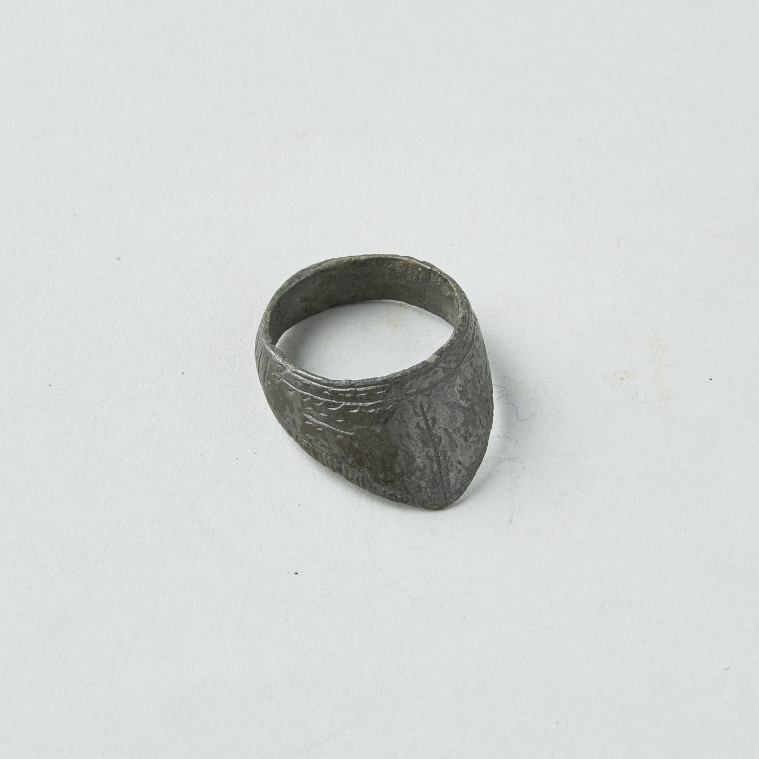 From Late Roman to Byzantine/Medieval, c. 6th-10th century AD. comes this large bronze archer's ring. Nicely incised details, imitating the visor of a Greek or Roman helmet. Nice olive-green patina.