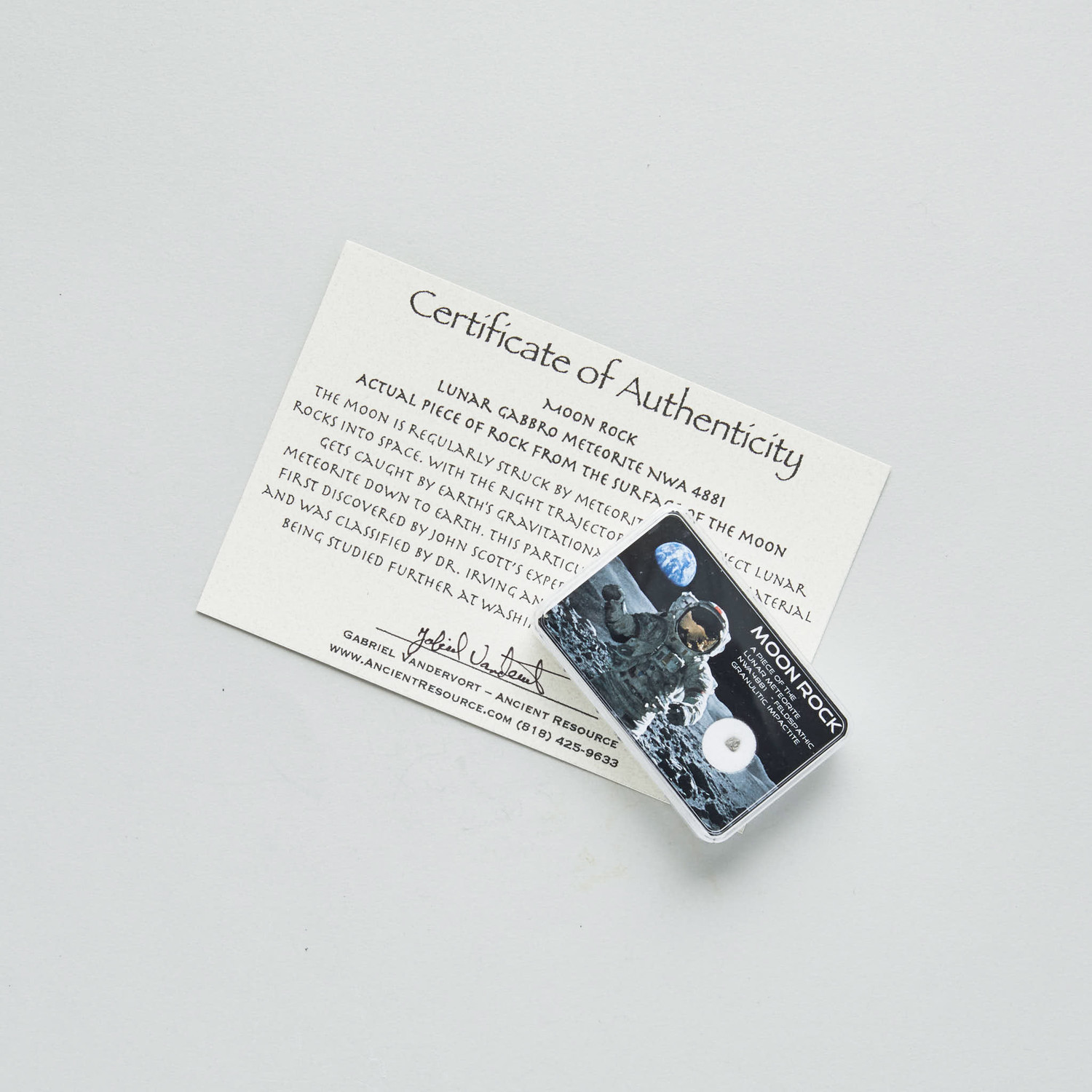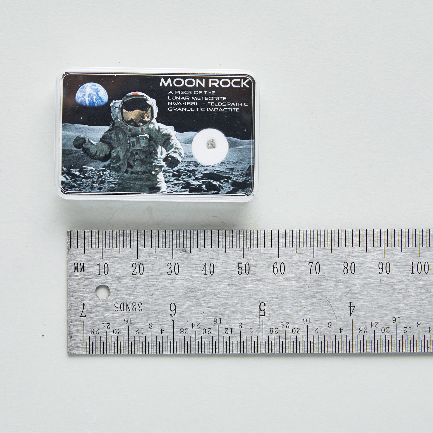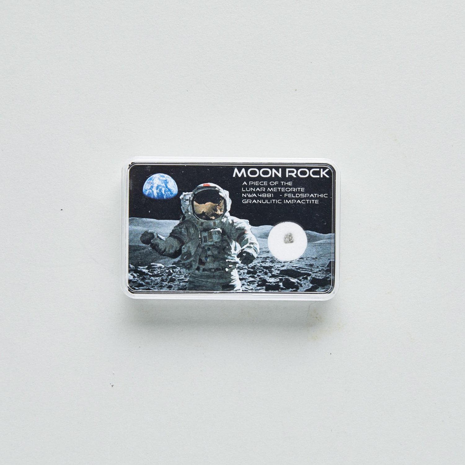 This real moon rock came from the Lunar gabbro meteorite NWA. The moon is regularly struck by meteorites which eject lunar rocks into space. With the right trajectory, some of this material gets caught by Earth's gravitational pull and falls as a meteorite down to earth. This particular lunar meteorite was first discovered by John Scott’s expedition in Antarctica in 1982, and was classified by Dr. Irving and Dr. Korotev. It is currently being studied further at Washington University, St. Louis. This specimen measures 3 mm and weighs 9 mg. Tiny but significant!