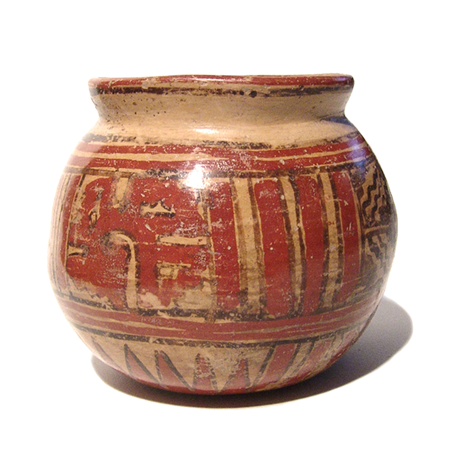 From Nayarit, West Mexico, c. 900 - 1200 AD comes this gorgeous Post-Classic Nayarit polychrome jar. The rounded body is adorned with red and black geometric designs over creme slip. A well-preserved example with nicely burnished surfaces.