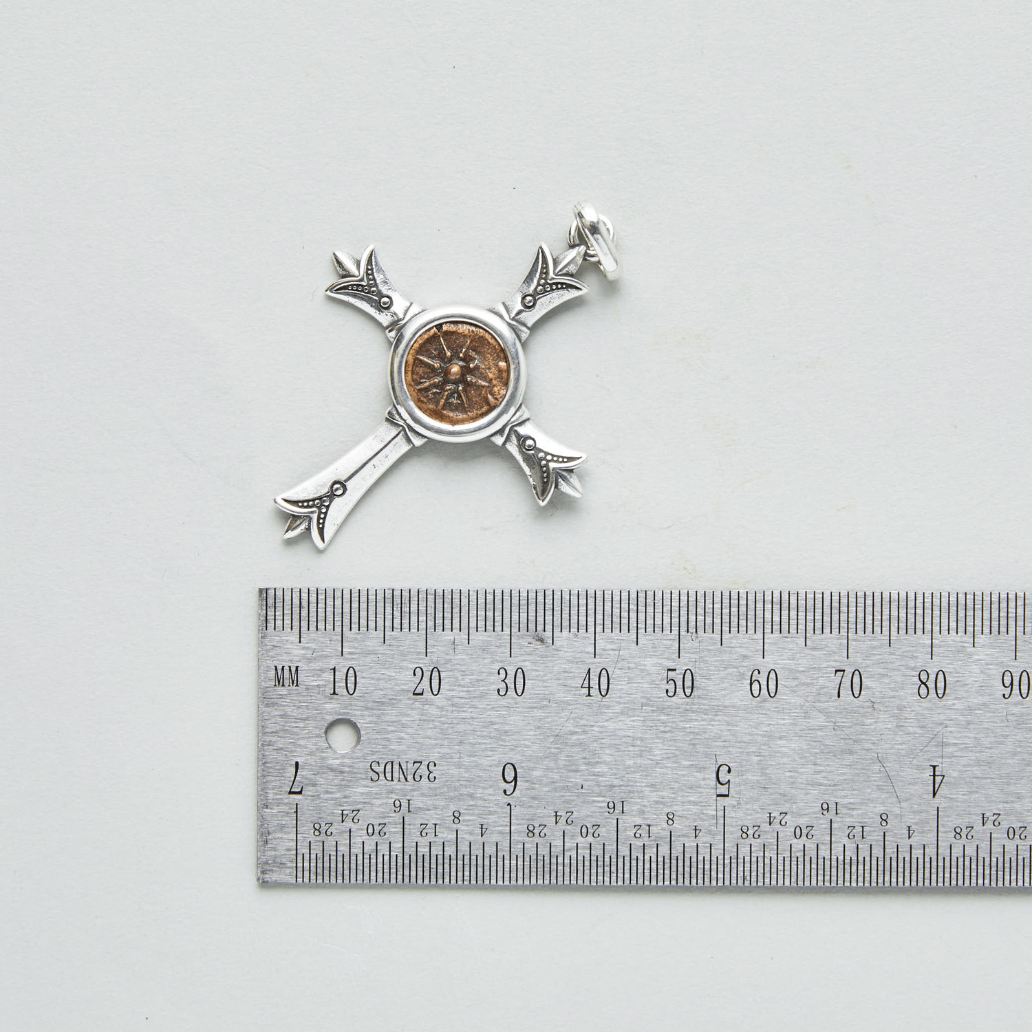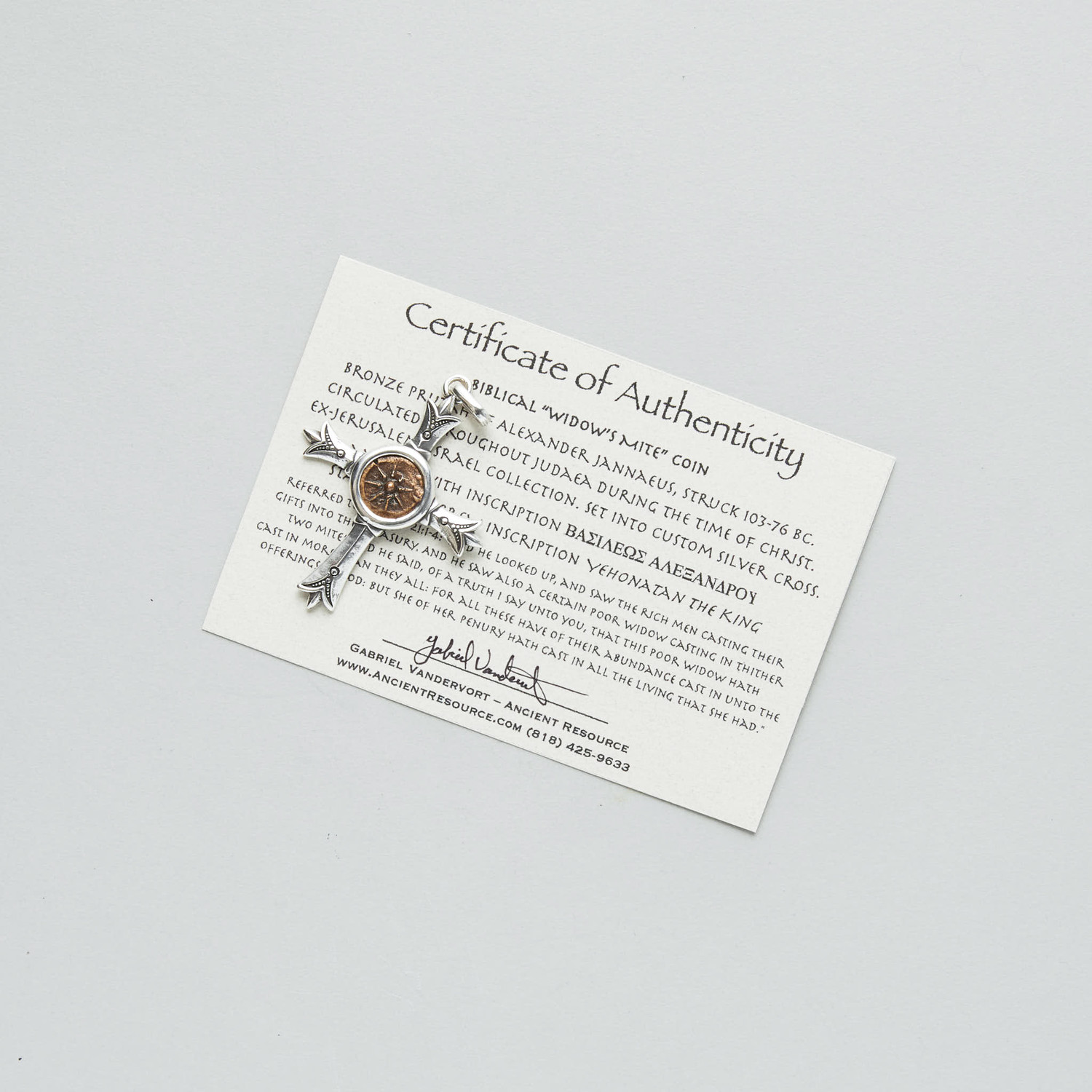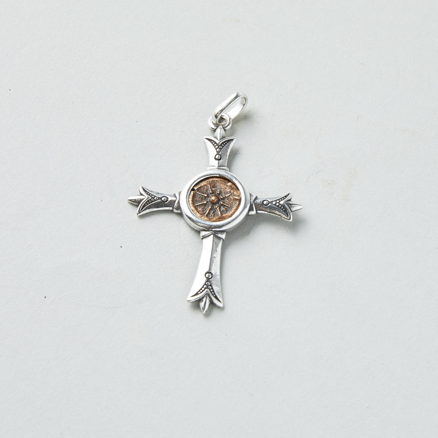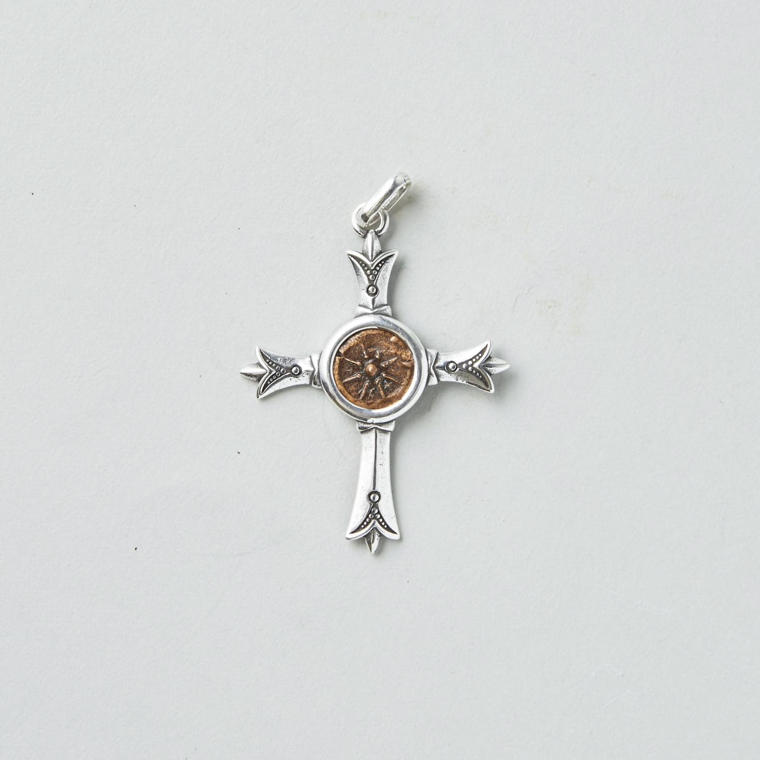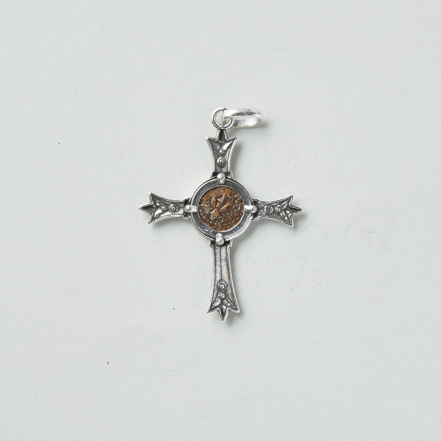 Minted during the 1st Century BC but circulated during the time of Christ. Referred-to in the Gospel of Luke 21:1-4... "And he looked up, and saw the rich men casting their gifts into the treasury. And he saw also a certain poor widow casting in thither two mites. And he said, Of a truth I say unto you, that this poor widow hath cast in more than they all: For all these have of their abundance cast in unto the offerings of God: but she of her penury hath cast in all the living that she had." Set into a stunning custom silver cross pendant.