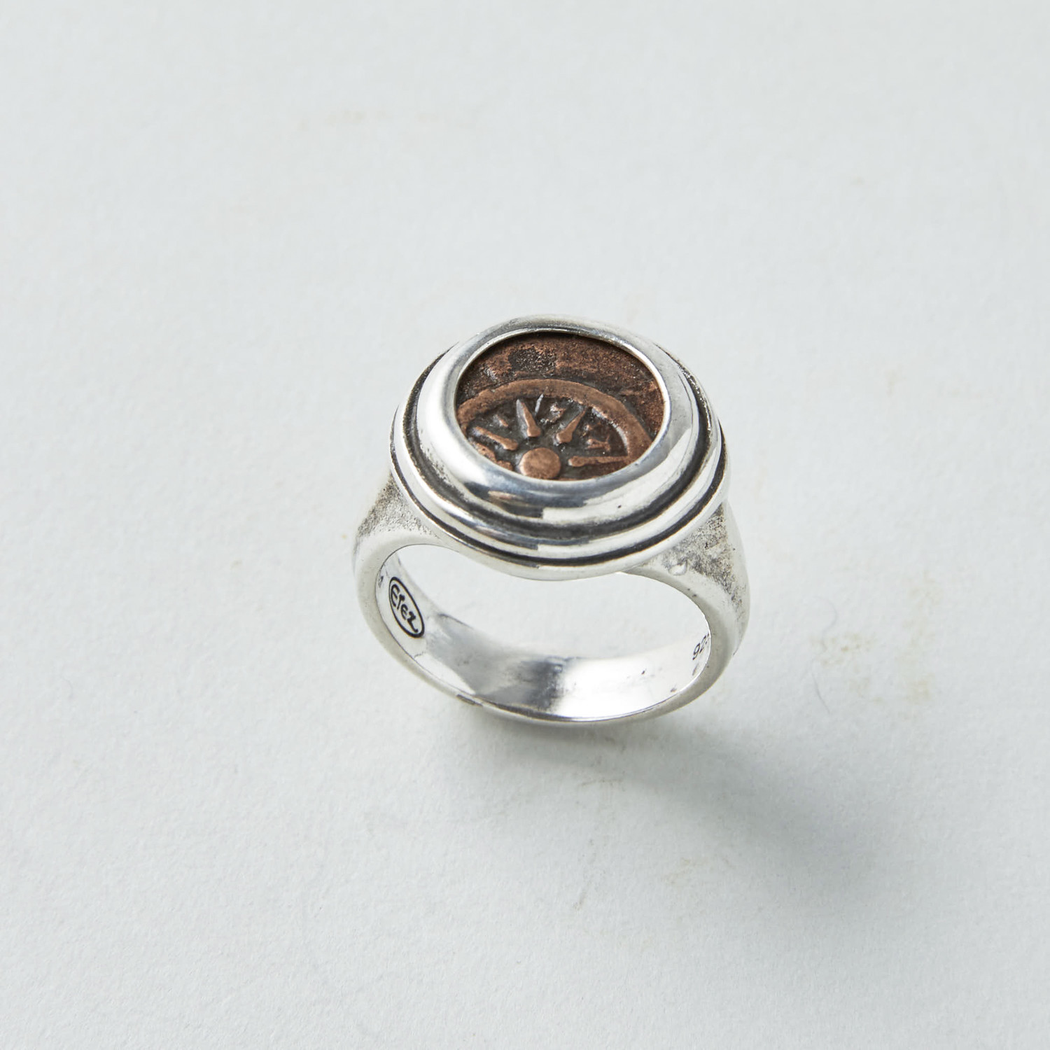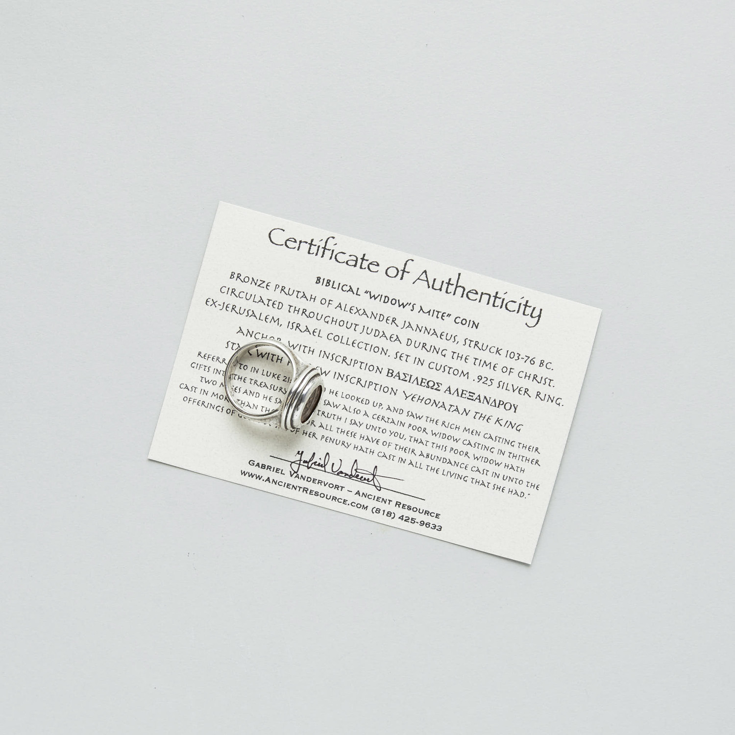 Minted during the 1st Century BC but circulated during the time of Christ. Referred-to in the Gospel of Luke 21:1-4... "And he looked up, and saw the rich men casting their gifts into the treasury. And he saw also a certain poor widow casting in thither two mites. And he said, Of a truth I say unto you, that this poor widow hath cast in more than they all: For all these have of their abundance cast in unto the offerings of God: but she of her penury hath cast in all the living that she had." Set into a stunning custom silver ring