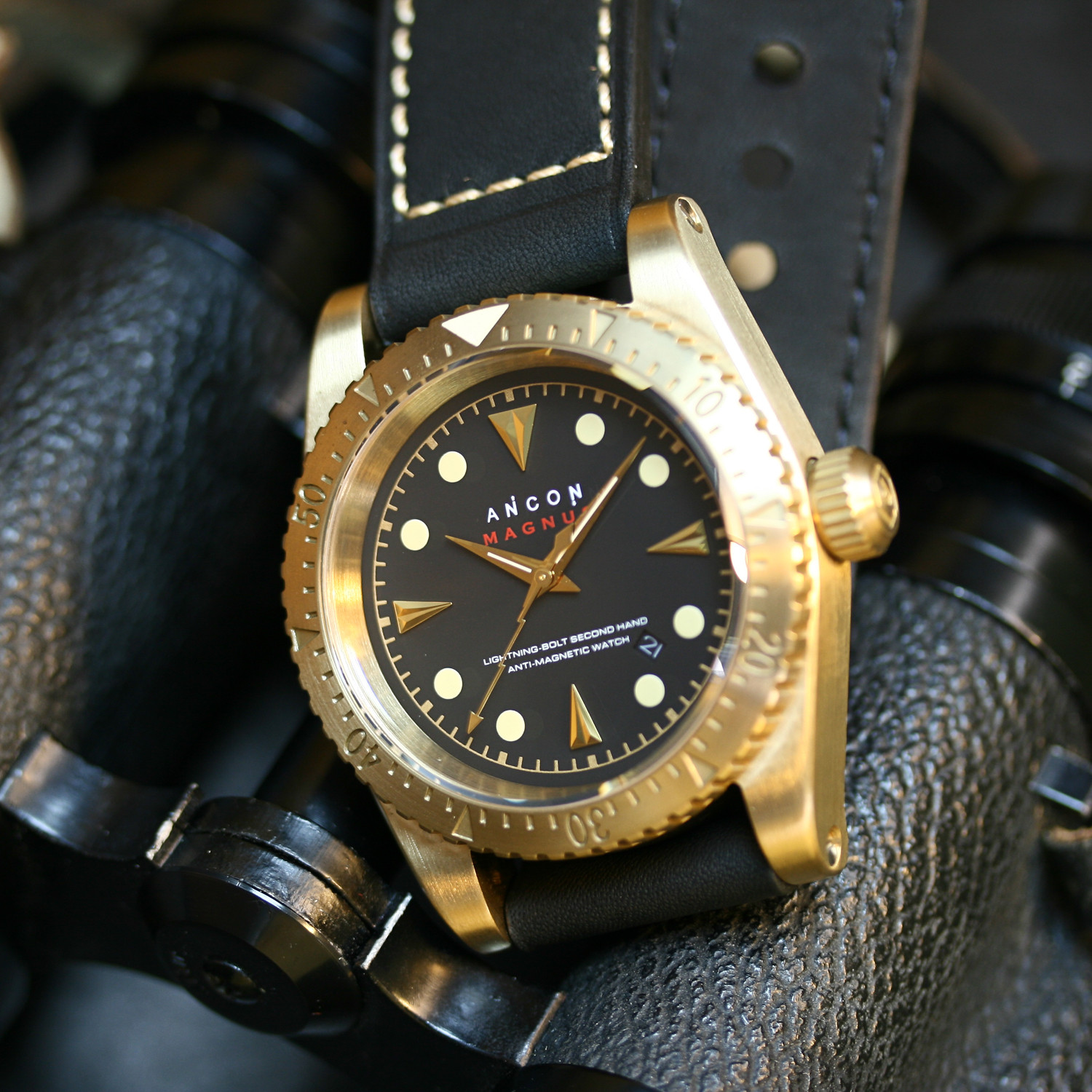Magnus is a magnificent antimagnetic watch with a lightning-bolt second hand. Its colors can only be describted as adventurer-inspired, with shades of Indiana Jones and Charles Lindbergh. In Al Bronze, it is a golden brown that, over time, will take on a rich patina that will enhance the character of the case... making each example unique and personalized
