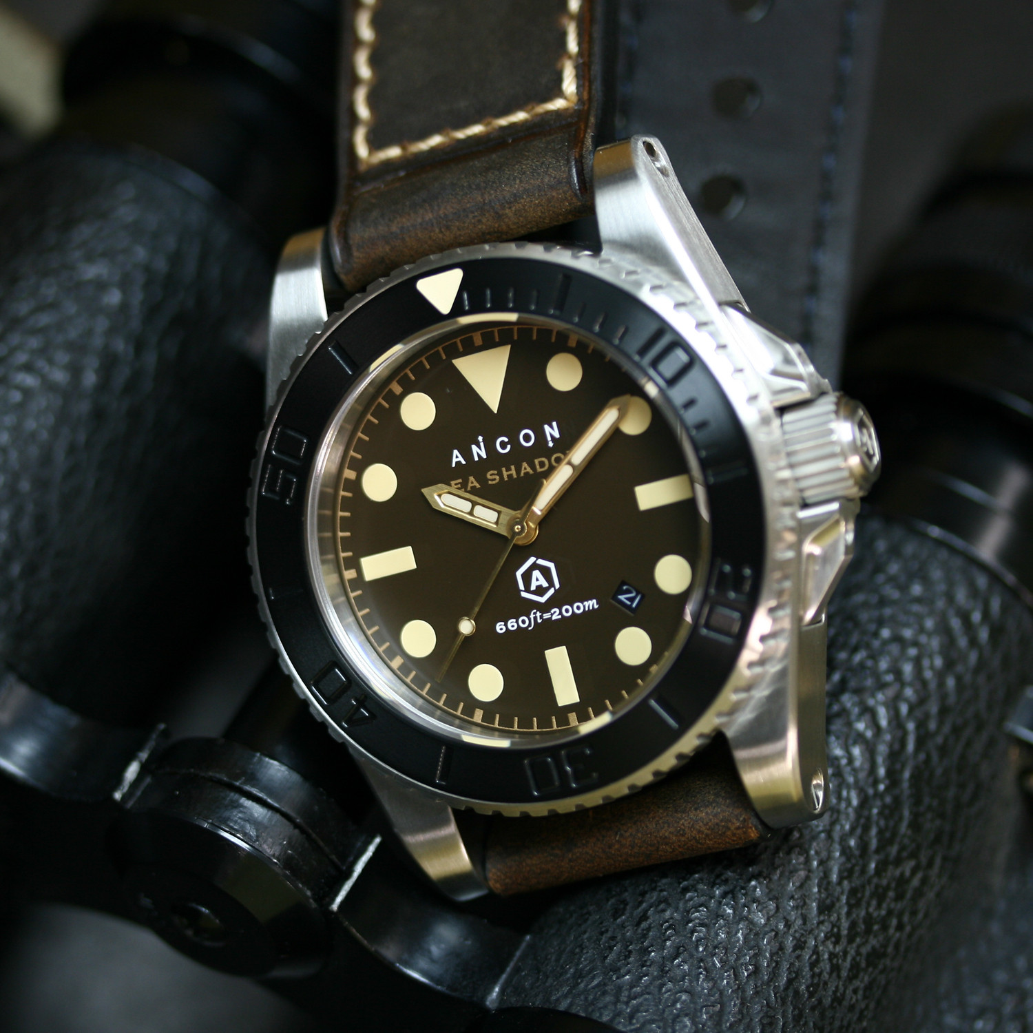 The Ancon Sea Shadow lines are inspired by the ANCON AGC-4 Amphibious Force Command Ship. To pay tribute to this magnificent warship, the Sea Shadow in dark brown includes unique characteristics, like the Miyota automatic movement chosen for its accuracy and reliability.