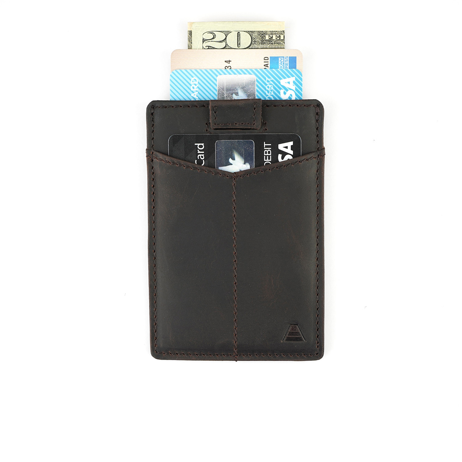 The Monarch is Andar's slimmest wallet yet. Made of full grain leather, this wallet gives you easy access to cards with its retractable pull-tab feature. It has enough room to hold a little bit of cash along with your essential cards—helping you organize and minimize what you carry.
