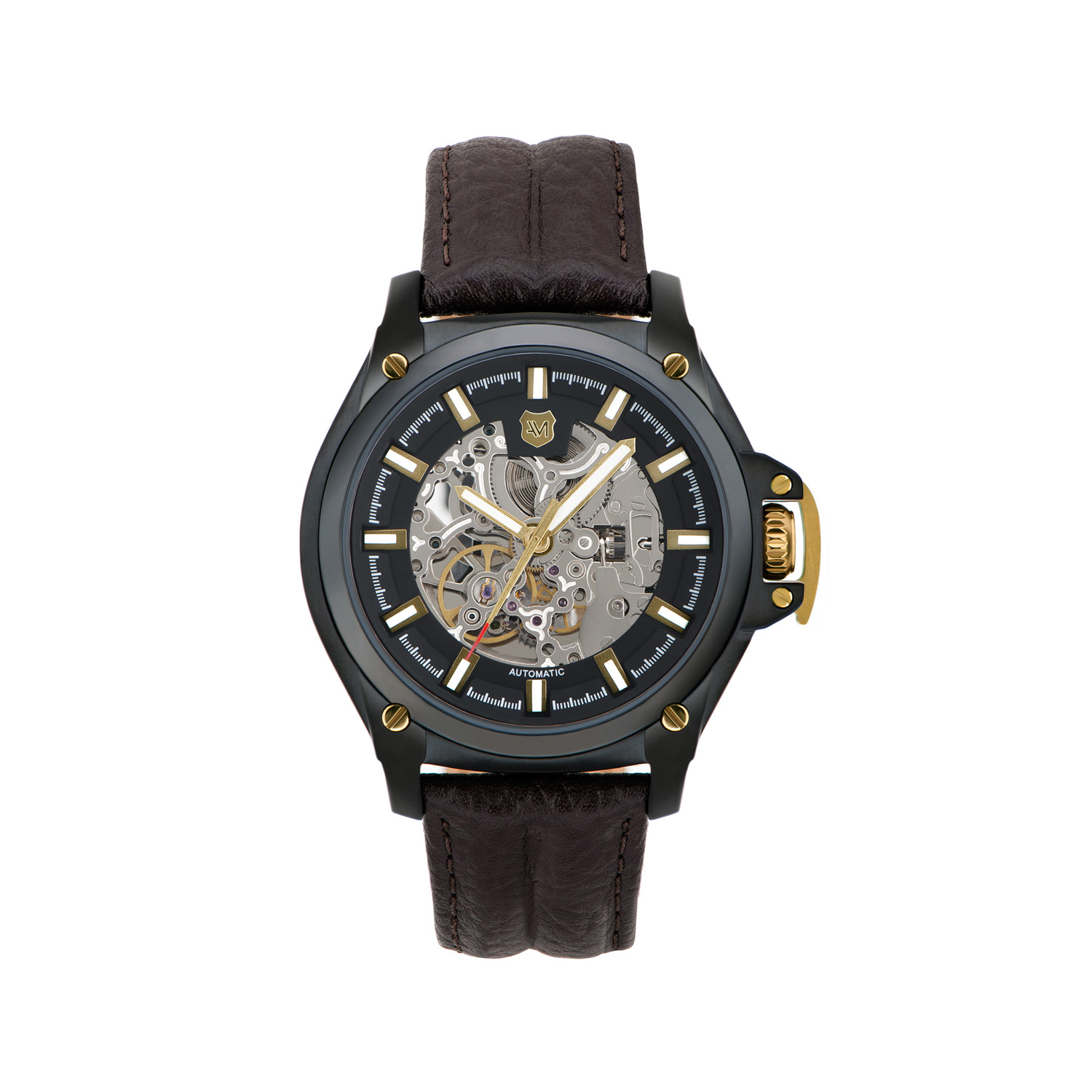 The automatic movement of this watch operates with the movement of the wrist and never needs a battery. Its luxurious brown leather strap has a buckle clasp and an exhibition skeleton movement and exhibition case back. It's even water resistance to 5ATM, or 165 feet.