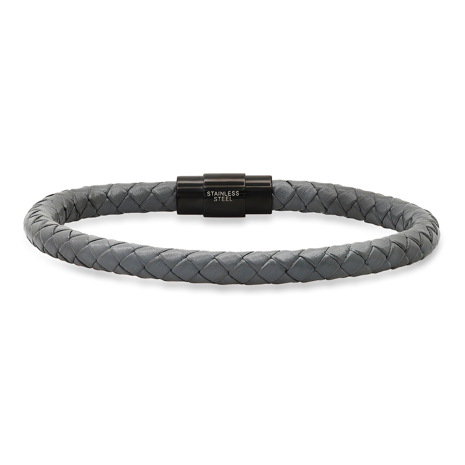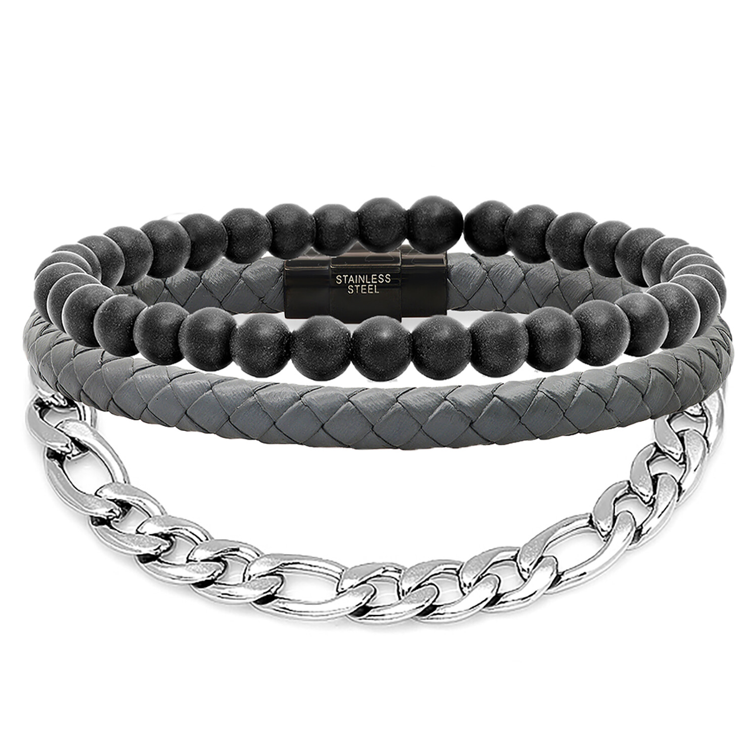 Lava + Leather + Stainless Steel Bracelets // Set of 3 // Black + Metallic