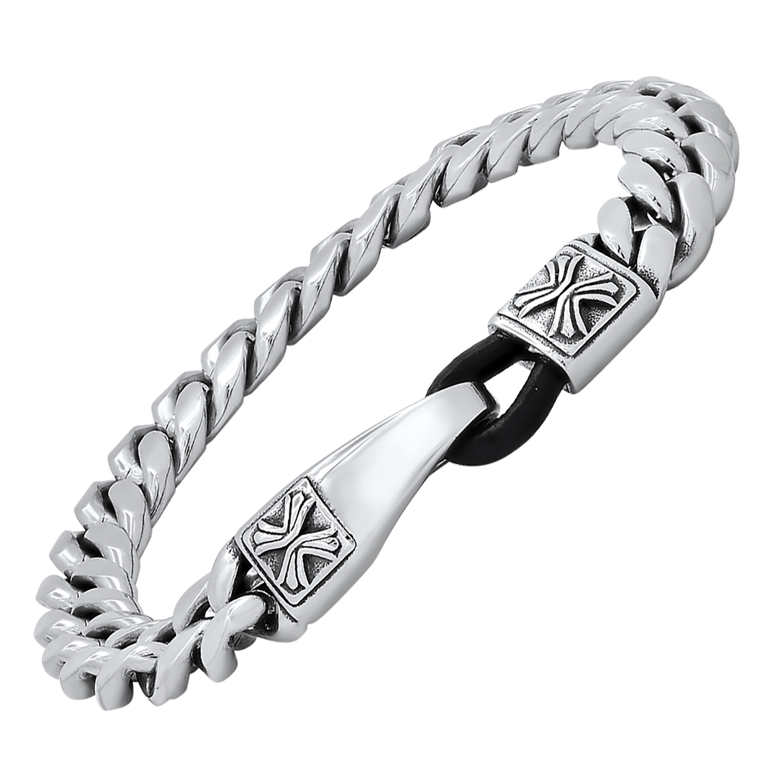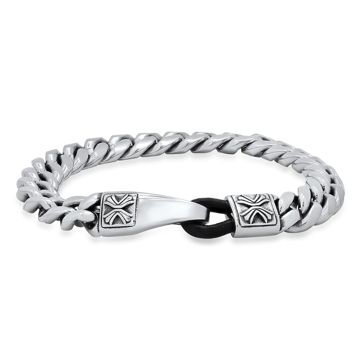 Stainless Steel Cuban Link Bracelet + Leather Clasp // Metallic