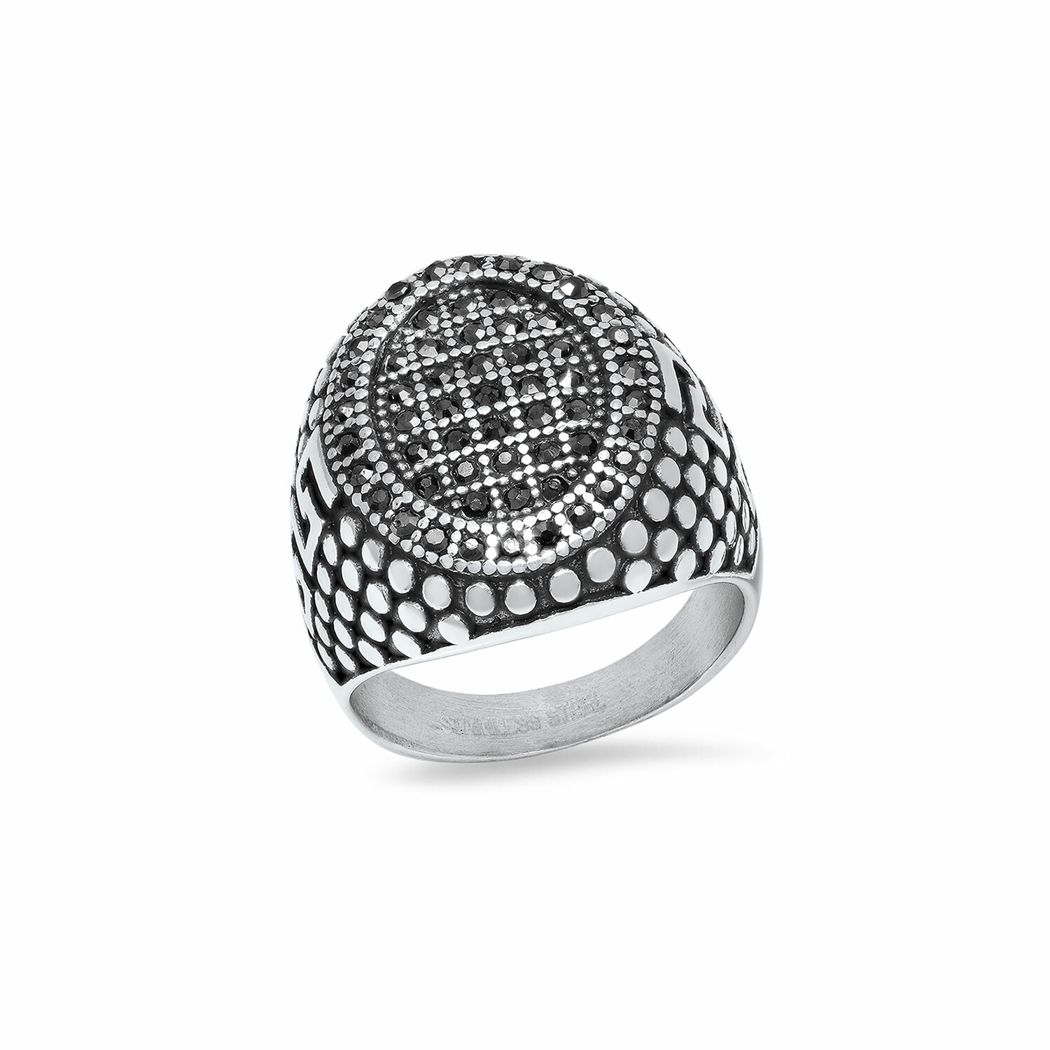 Stainless Steel + CZ Pebble + Greek Key Accented Ring // Black + Metallic