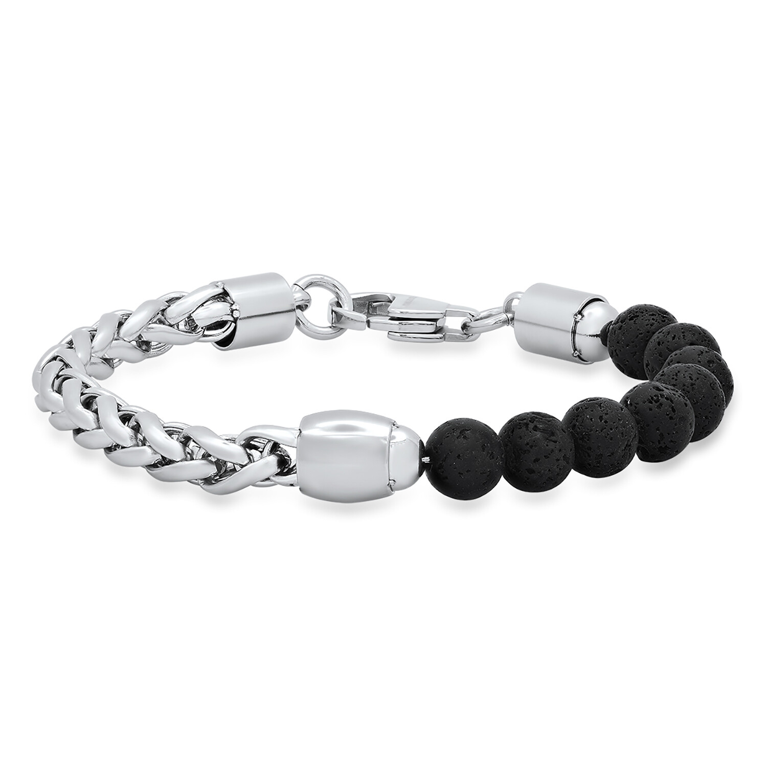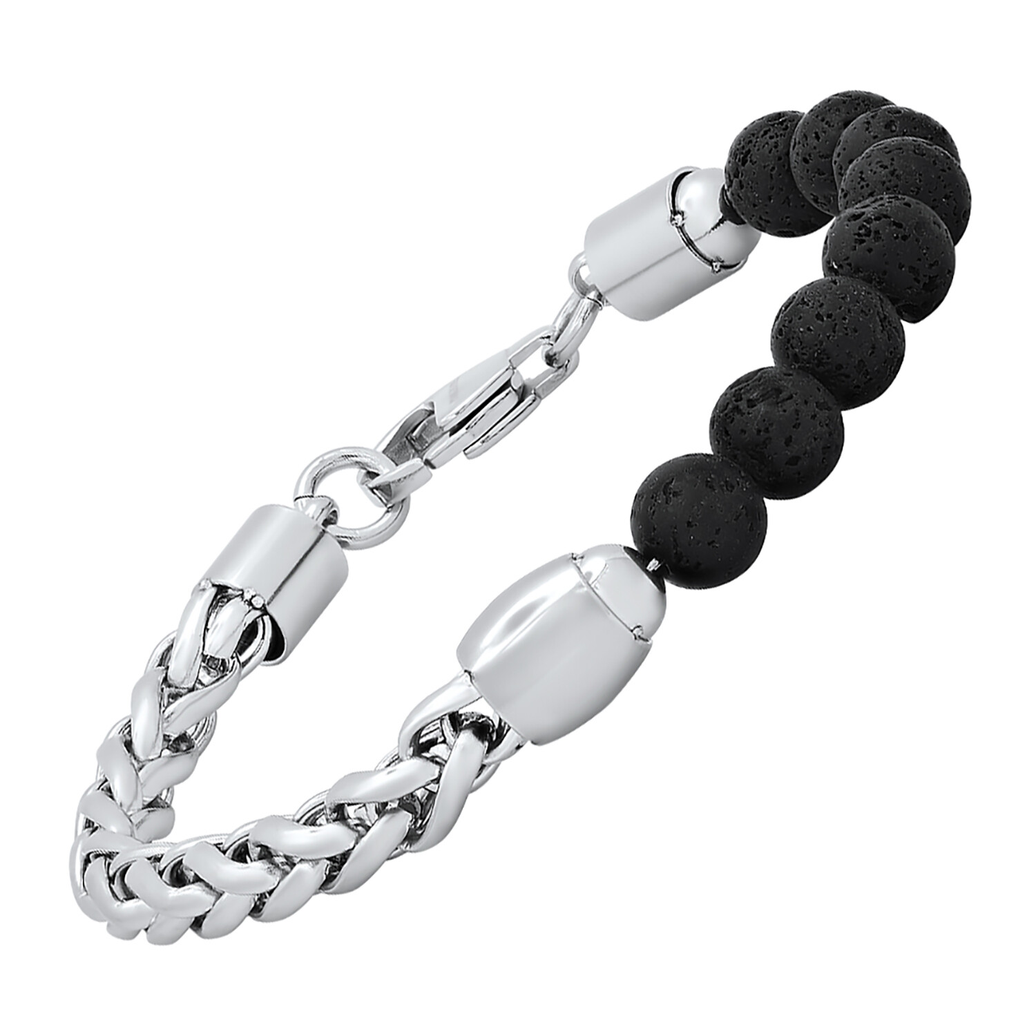 Stainless Steel Wheat Link Chain + Lava Beads Bracelet // Metallic + Black