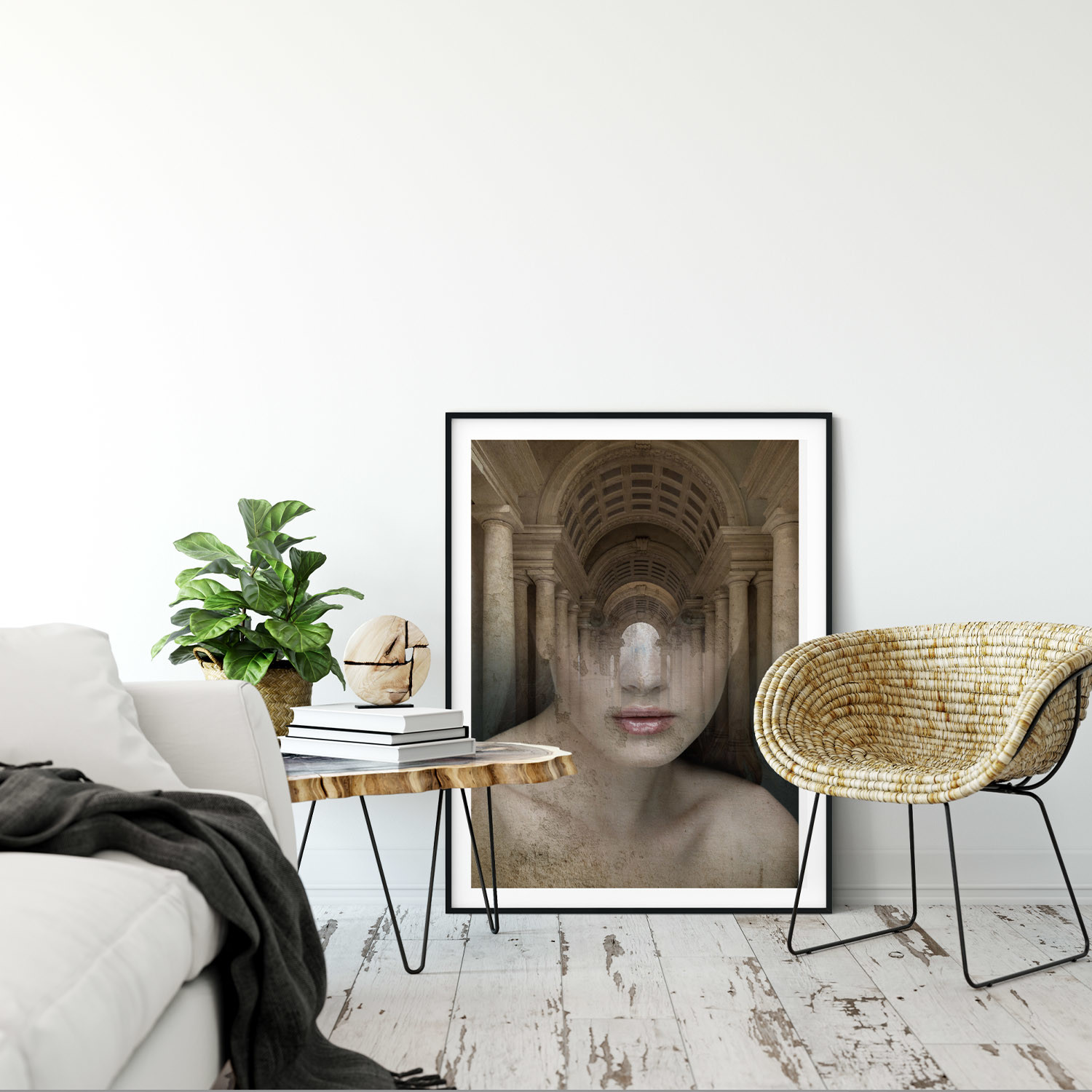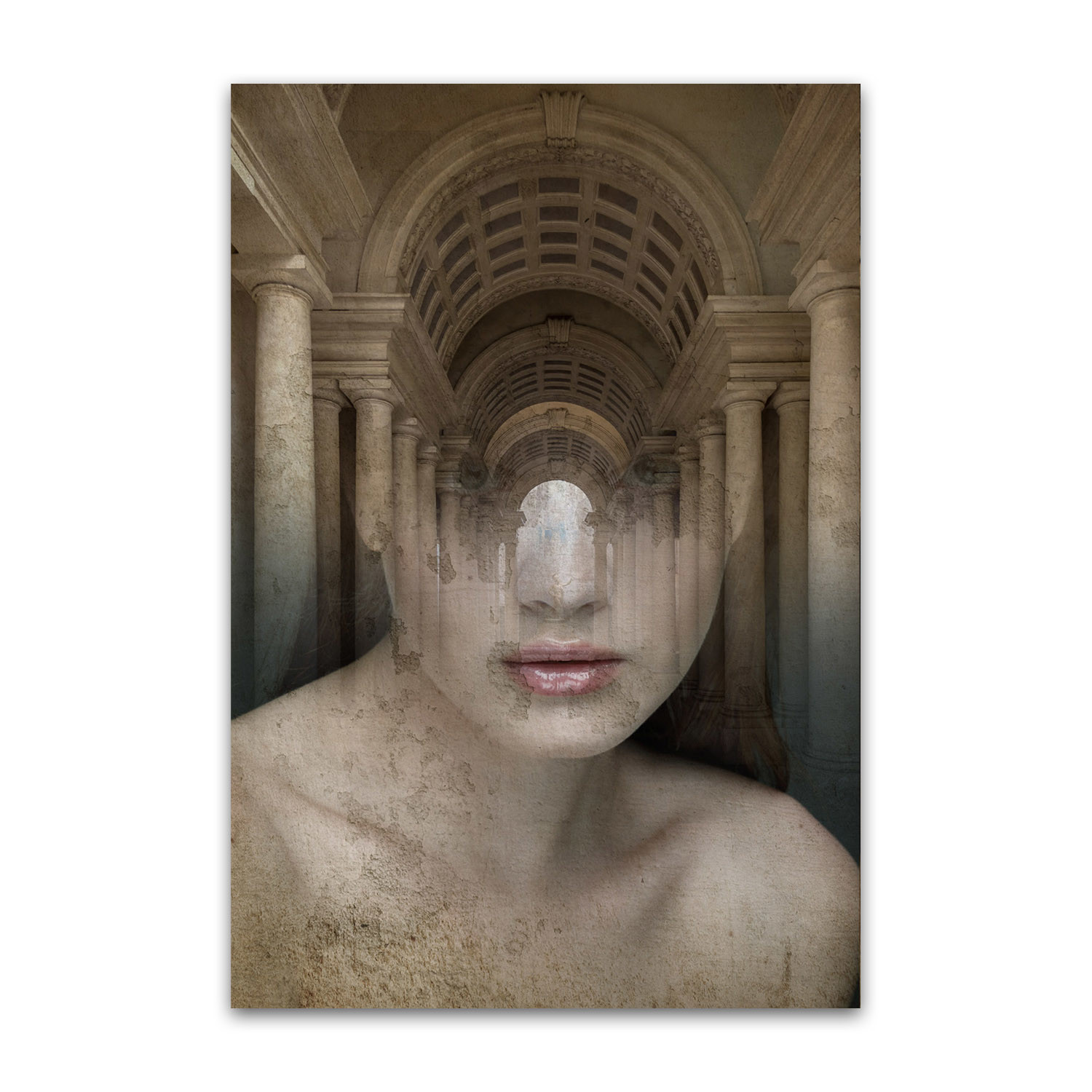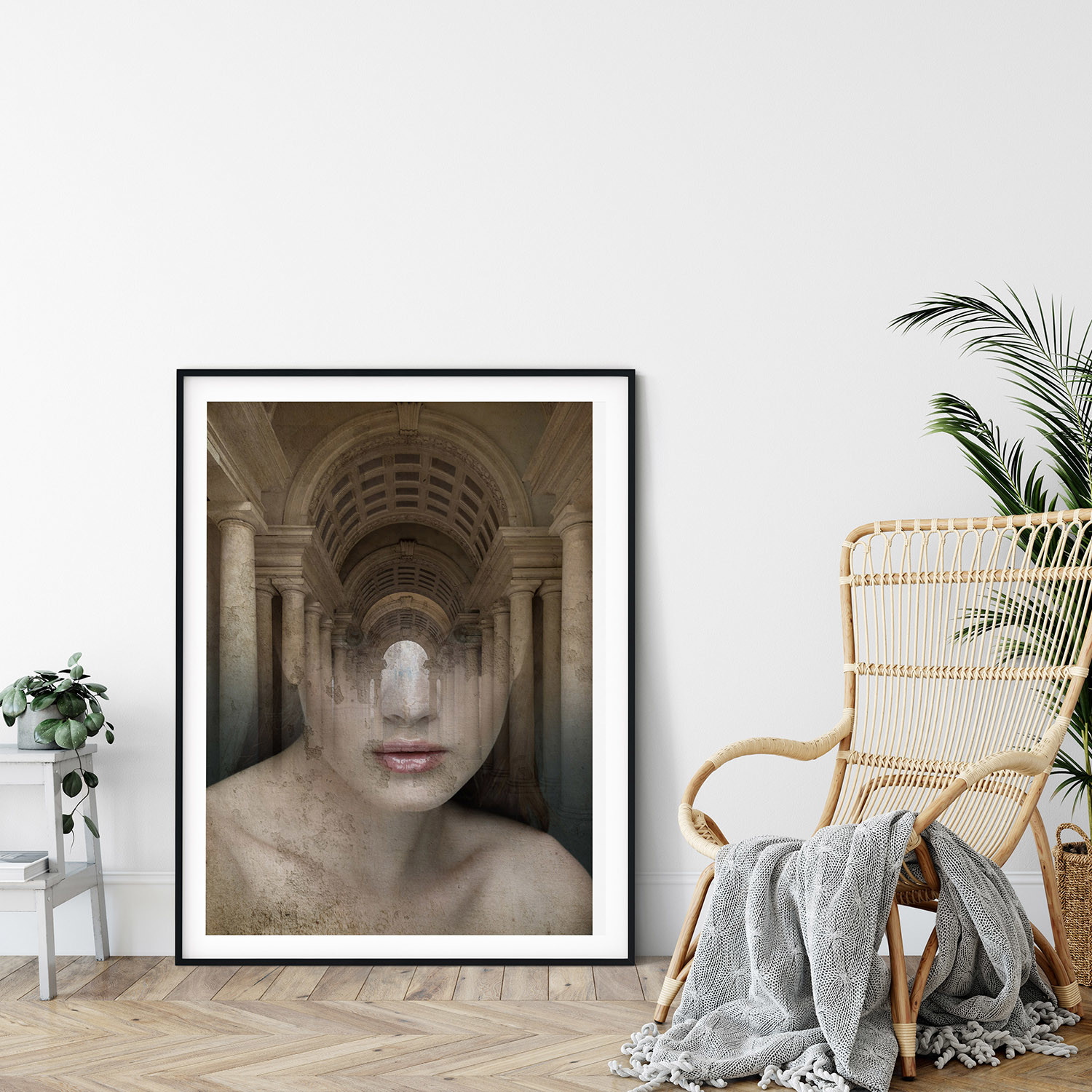 Mora's collection of prints breaks the boundary between reality and a dream state. His work dissolves the limits between two or more superimposed images, which result in human faces being mixed with landscapes, vegetation, lakes, and oceans. His collages are bold and strange, pulling together two parallel worlds to evoke a sense of thought and emotion from his audience.