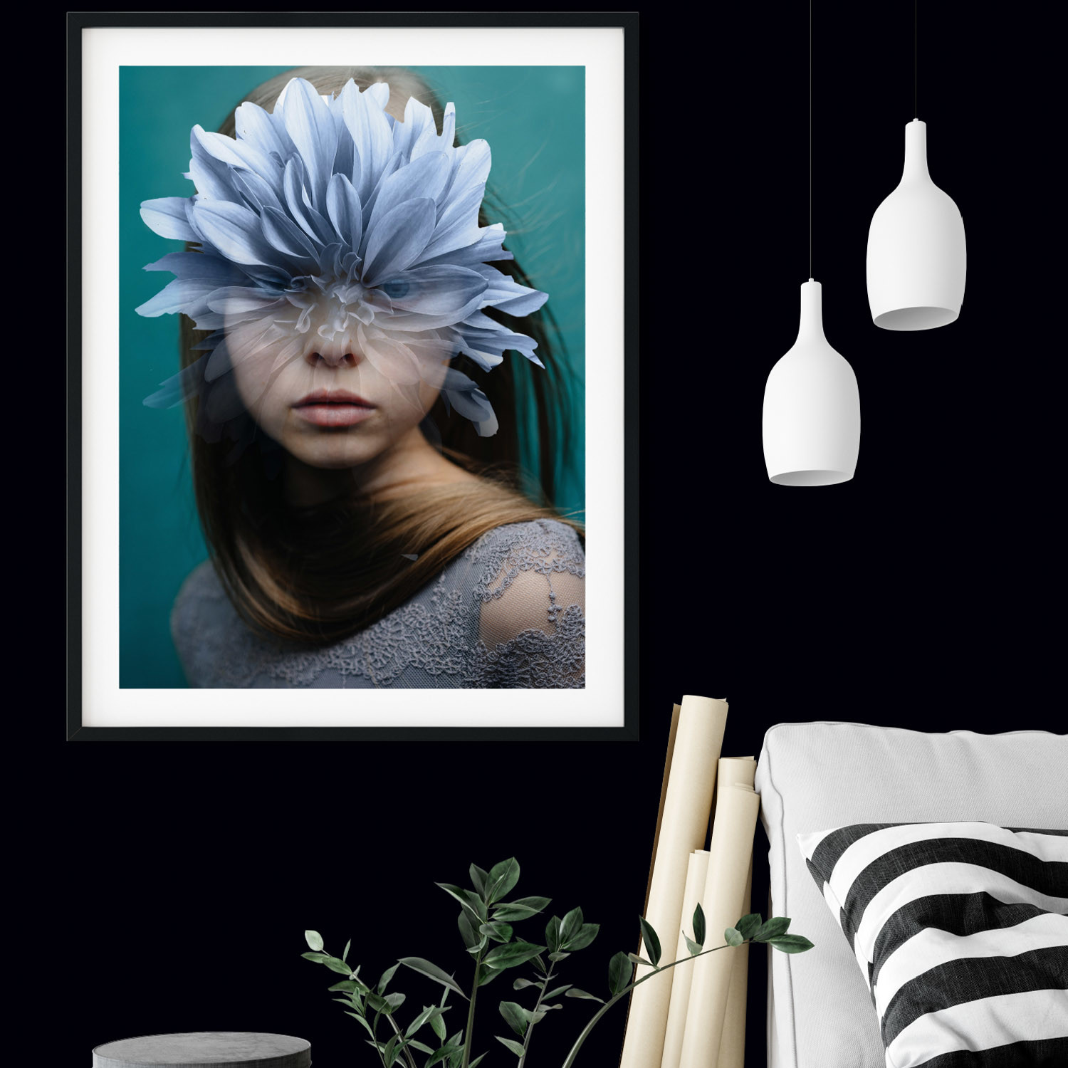 Mora's collection of prints breaks the boundary between reality and a dream state. His work dissolves the limits between two or more superimposed images, which result in human faces being mixed with landscapes, vegetation, lakes, and oceans. His collages are bold and strange, pulling together two parallel worlds to evoke a sense of thought and emotion from his audience.