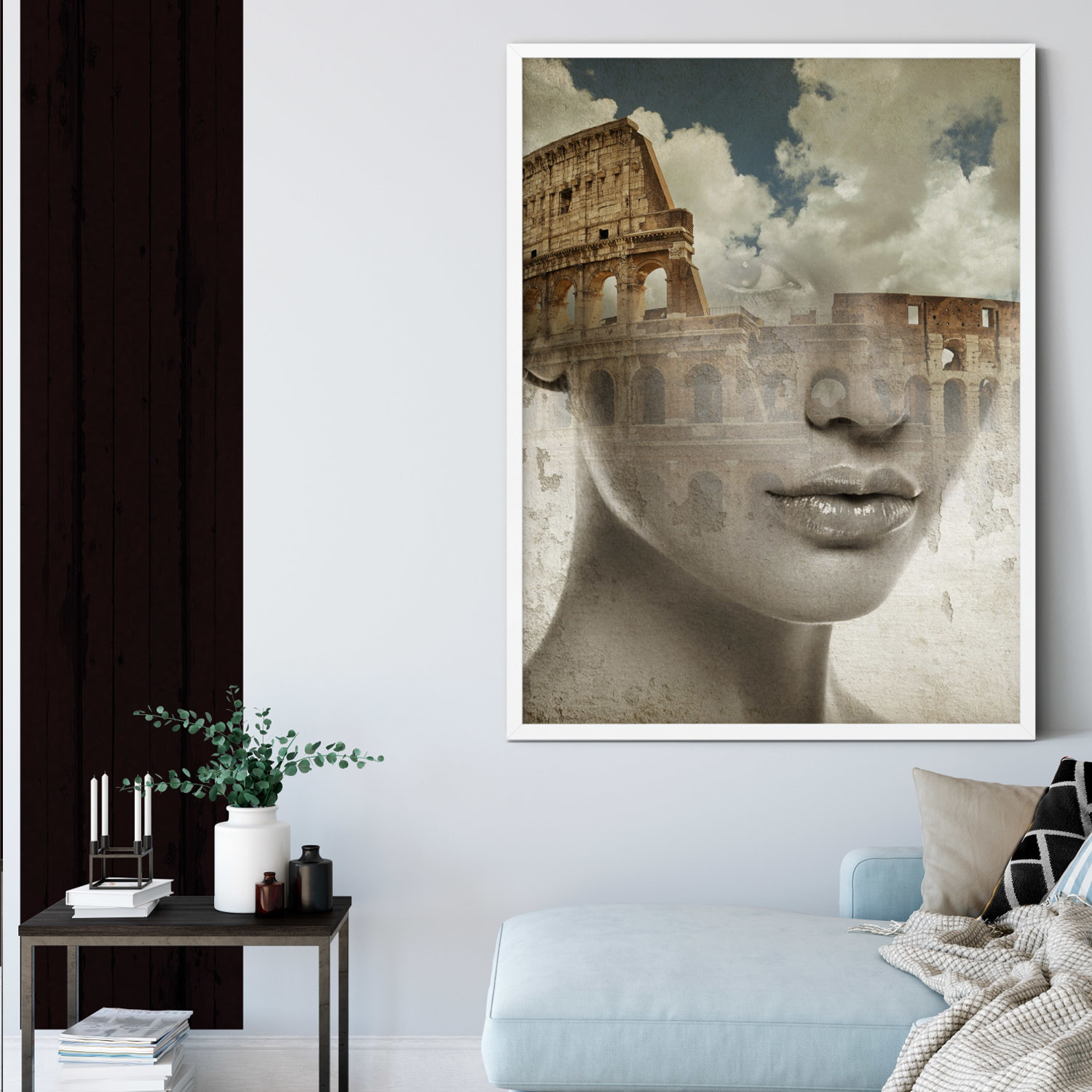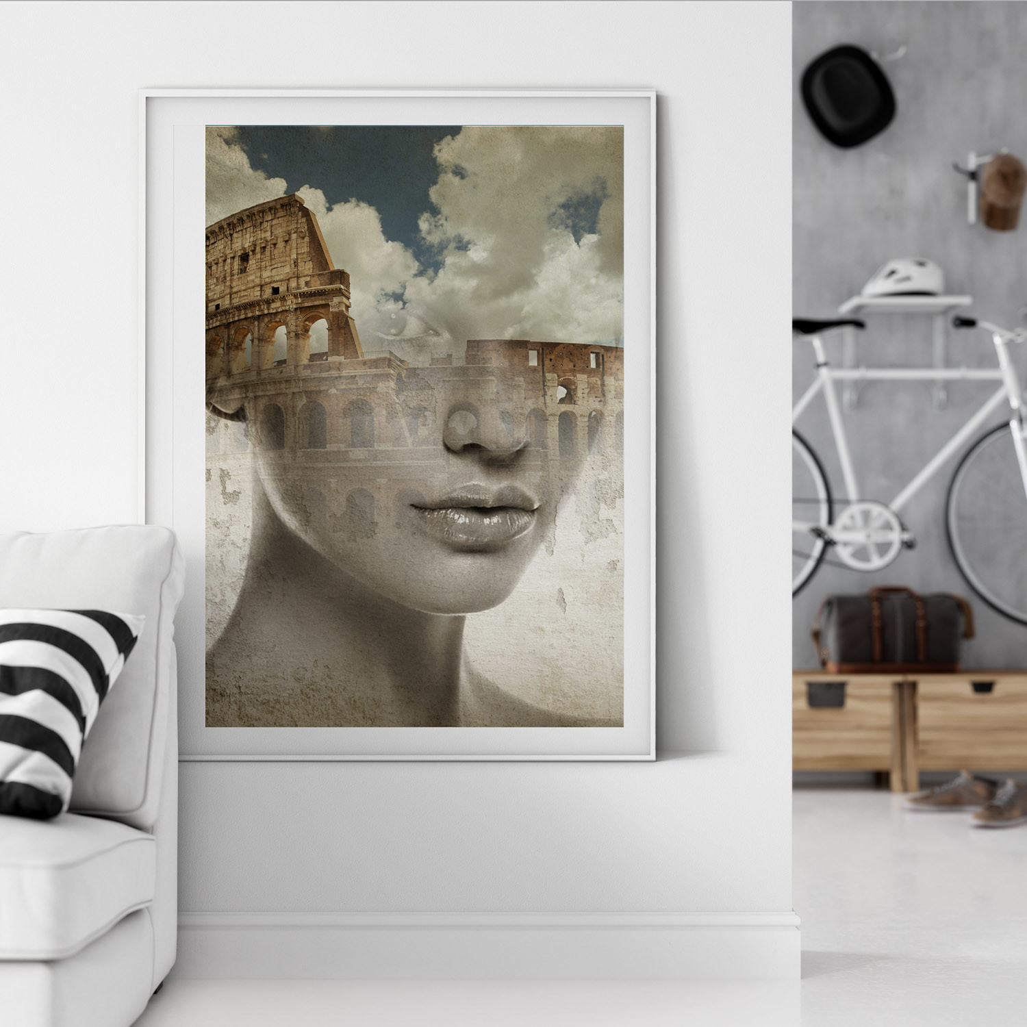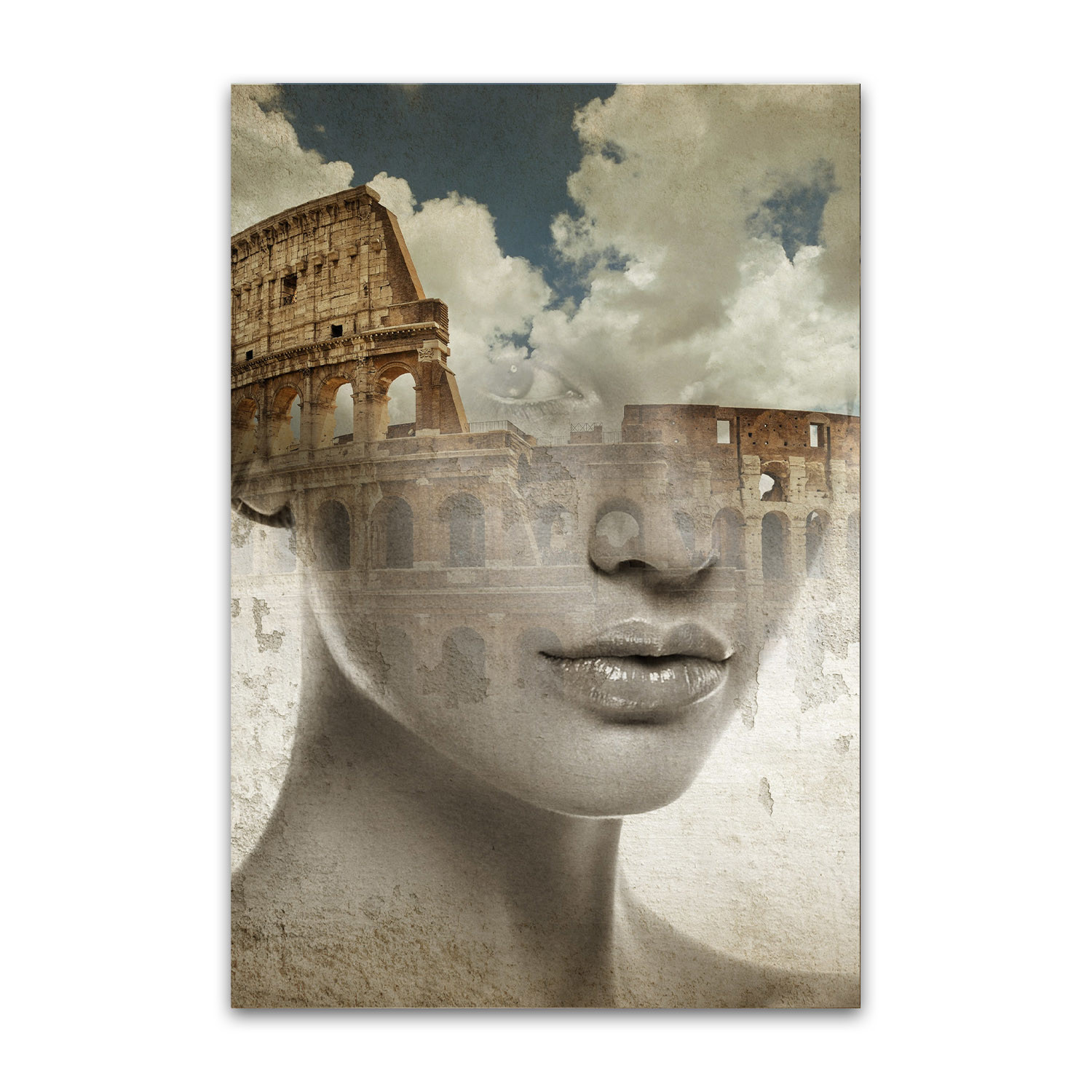 Mora's collection of prints breaks the boundary between reality and a dream state. His work dissolves the limits between two or more superimposed images, which result in human faces being mixed with landscapes, vegetation, lakes, and oceans. His collages are bold and strange, pulling together two parallel worlds to evoke a sense of thought and emotion from his audience.