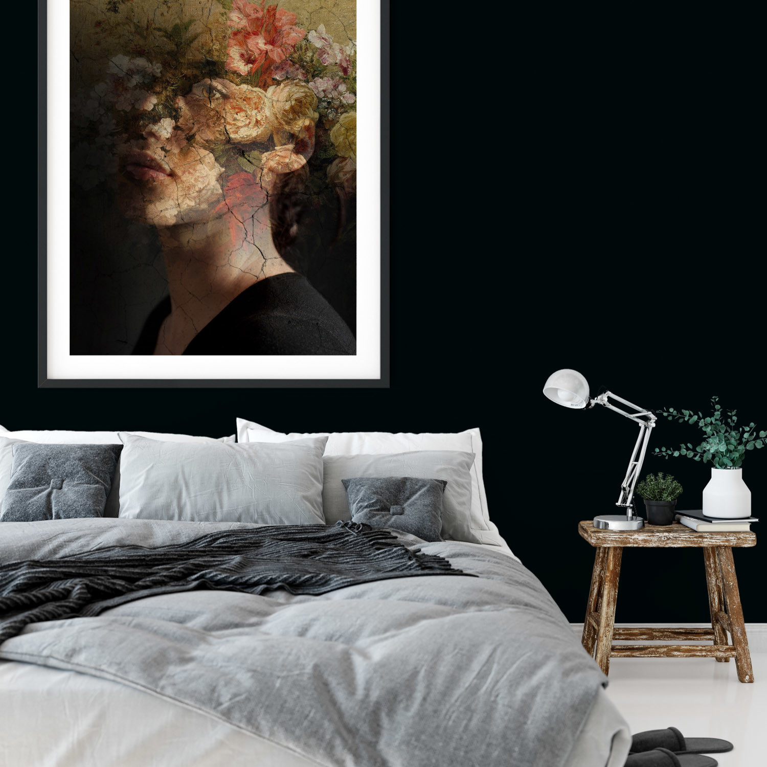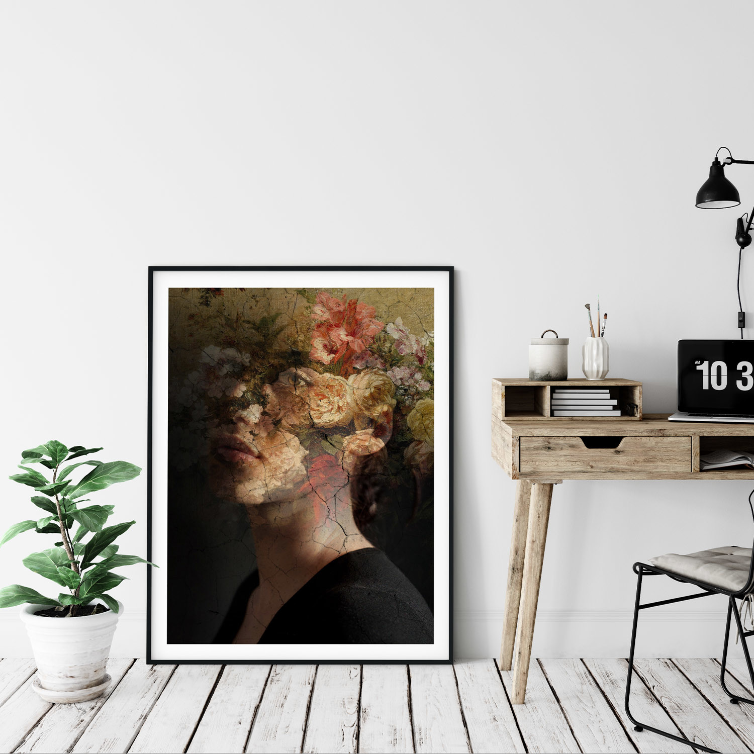 Mora's collection of prints breaks the boundary between reality and a dream state. His work dissolves the limits between two or more superimposed images, which result in human faces being mixed with landscapes, vegetation, lakes, and oceans. His collages are bold and strange, pulling together two parallel worlds to evoke a sense of thought and emotion from his audience.