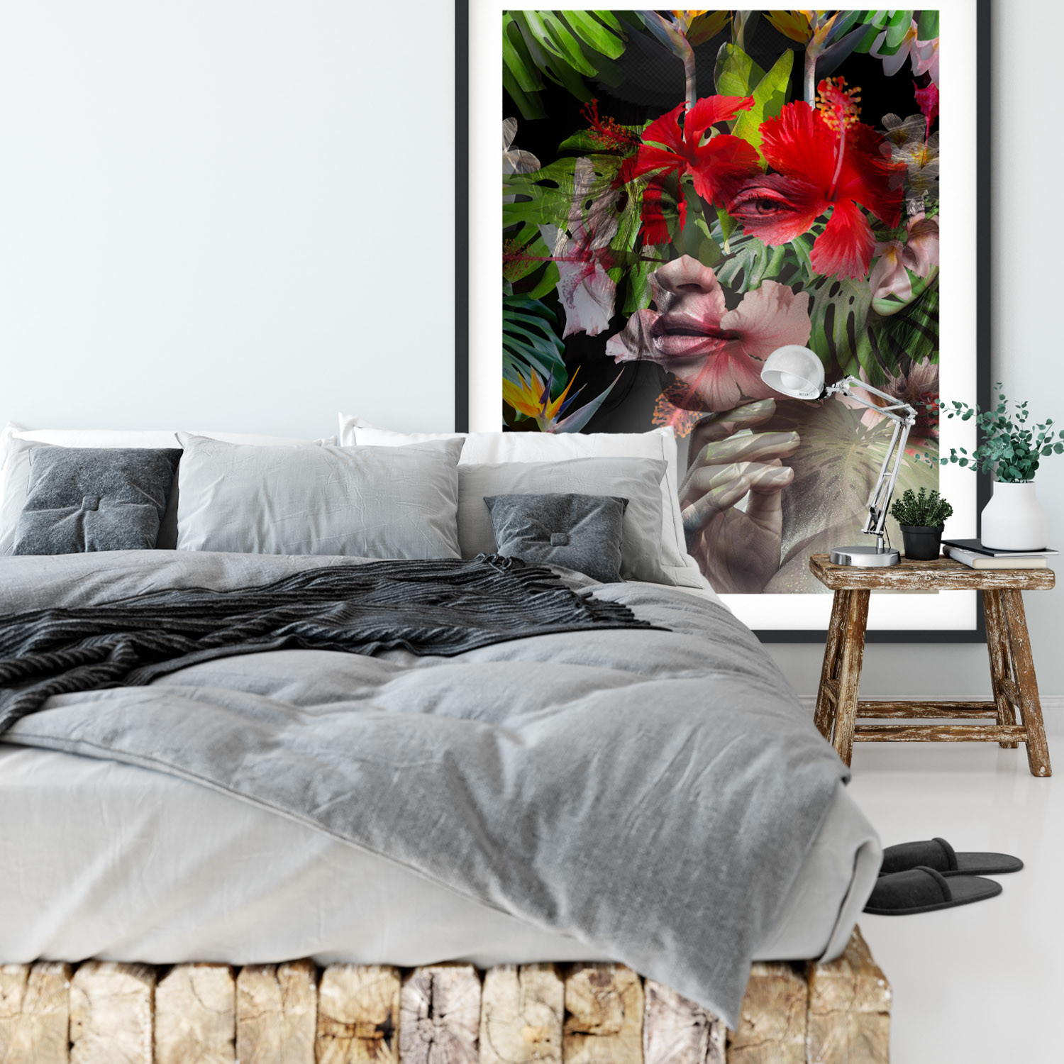 Mora's collection of prints breaks the boundary between reality and a dream state. His work dissolves the limits between two or more superimposed images, which result in human faces being mixed with landscapes, vegetation, lakes, and oceans. His collages are bold and strange, pulling together two parallel worlds to evoke a sense of thought and emotion from his audience.