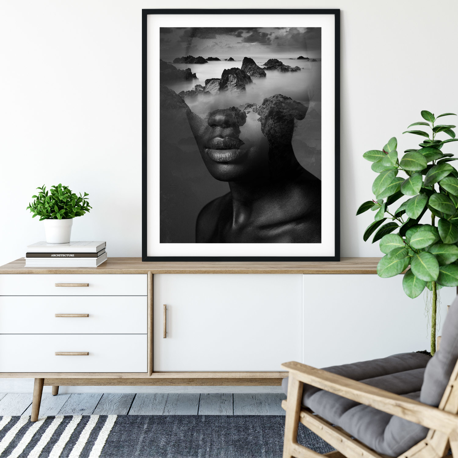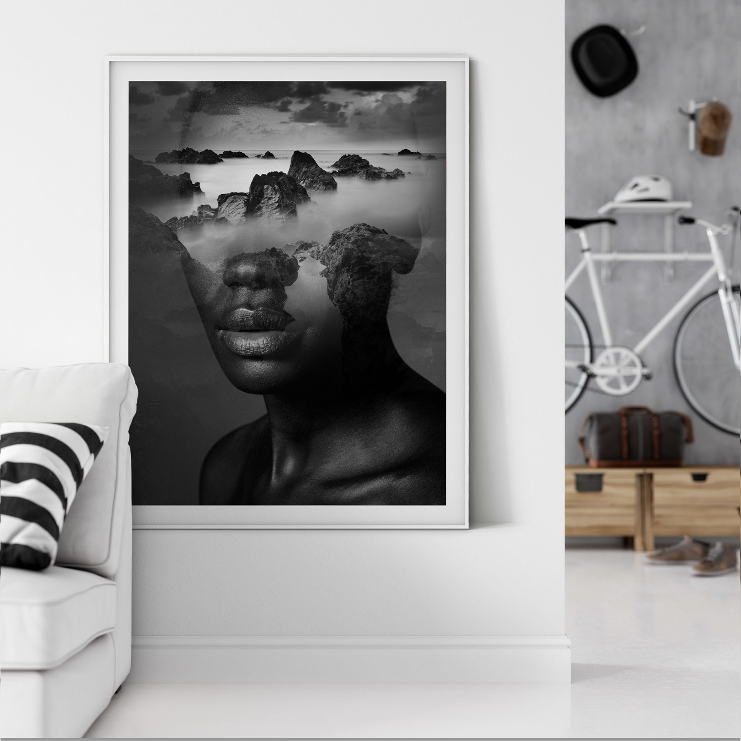 Mora's collection of prints breaks the boundary between reality and a dream state. His work dissolves the limits between two or more superimposed images, which result in human faces being mixed with landscapes, vegetation, lakes, and oceans. His collages are bold and strange, pulling together two parallel worlds to evoke a sense of thought and emotion from his audience.