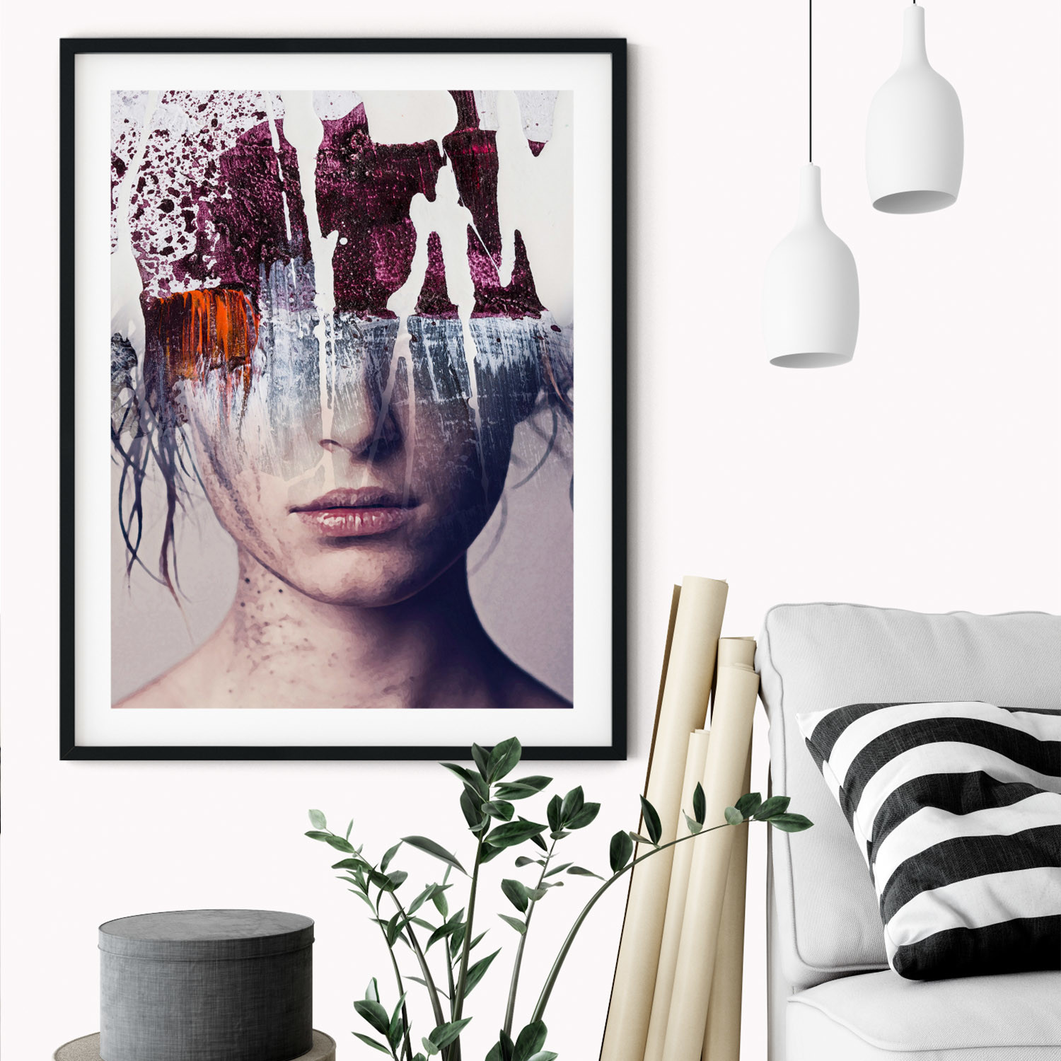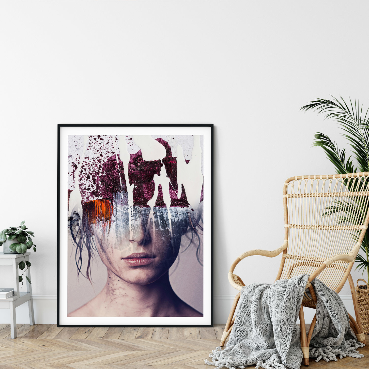 Mora's collection of prints breaks the boundary between reality and a dream state. His work dissolves the limits between two or more superimposed images, which result in human faces being mixed with landscapes, vegetation, lakes, and oceans. His collages are bold and strange, pulling together two parallel worlds to evoke a sense of thought and emotion from his audience.