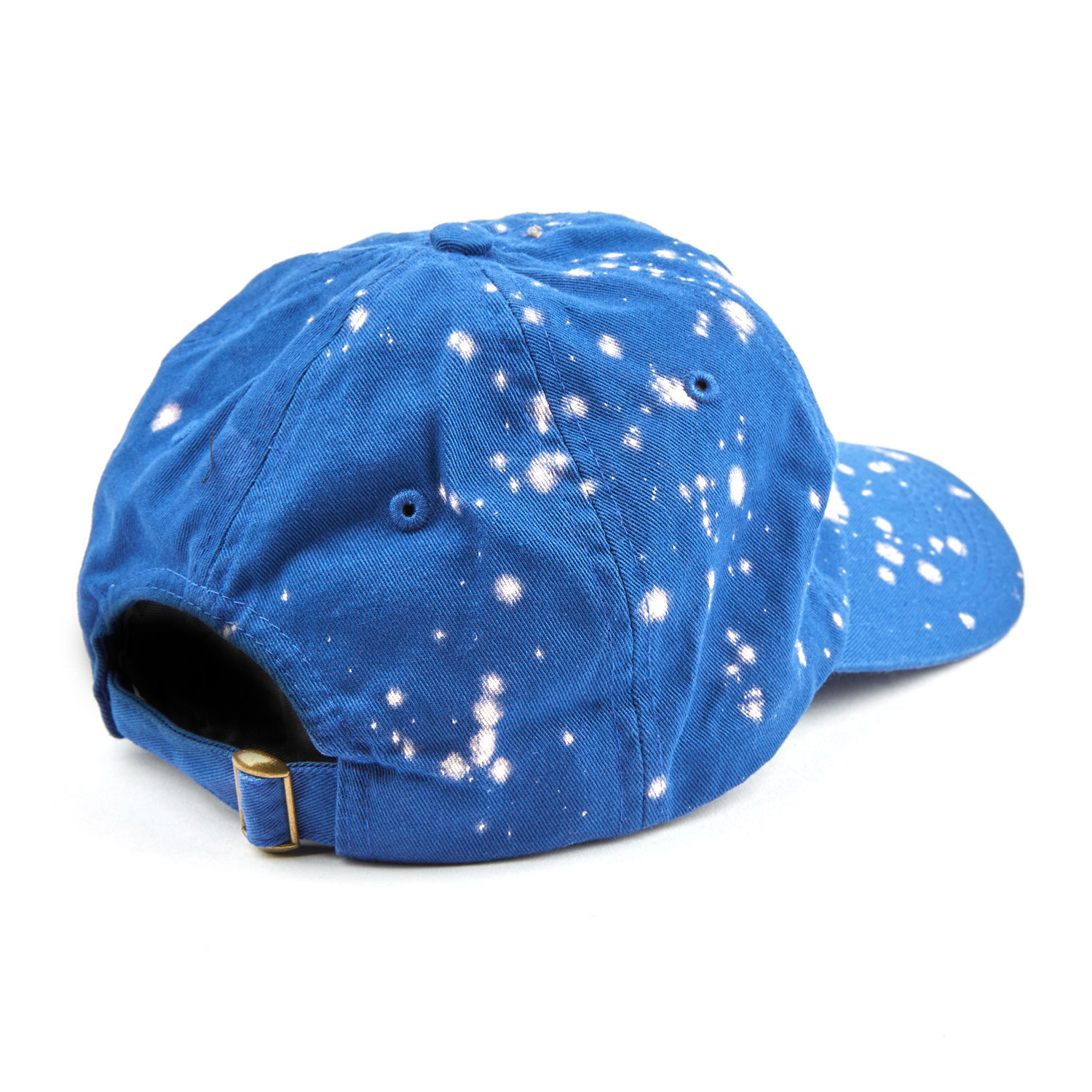 The Splatter Dad Hat has an unstructured bleached design with embroidered eyelets, a naturally curved bill, and an adjustable strapback for a more personalized fit.