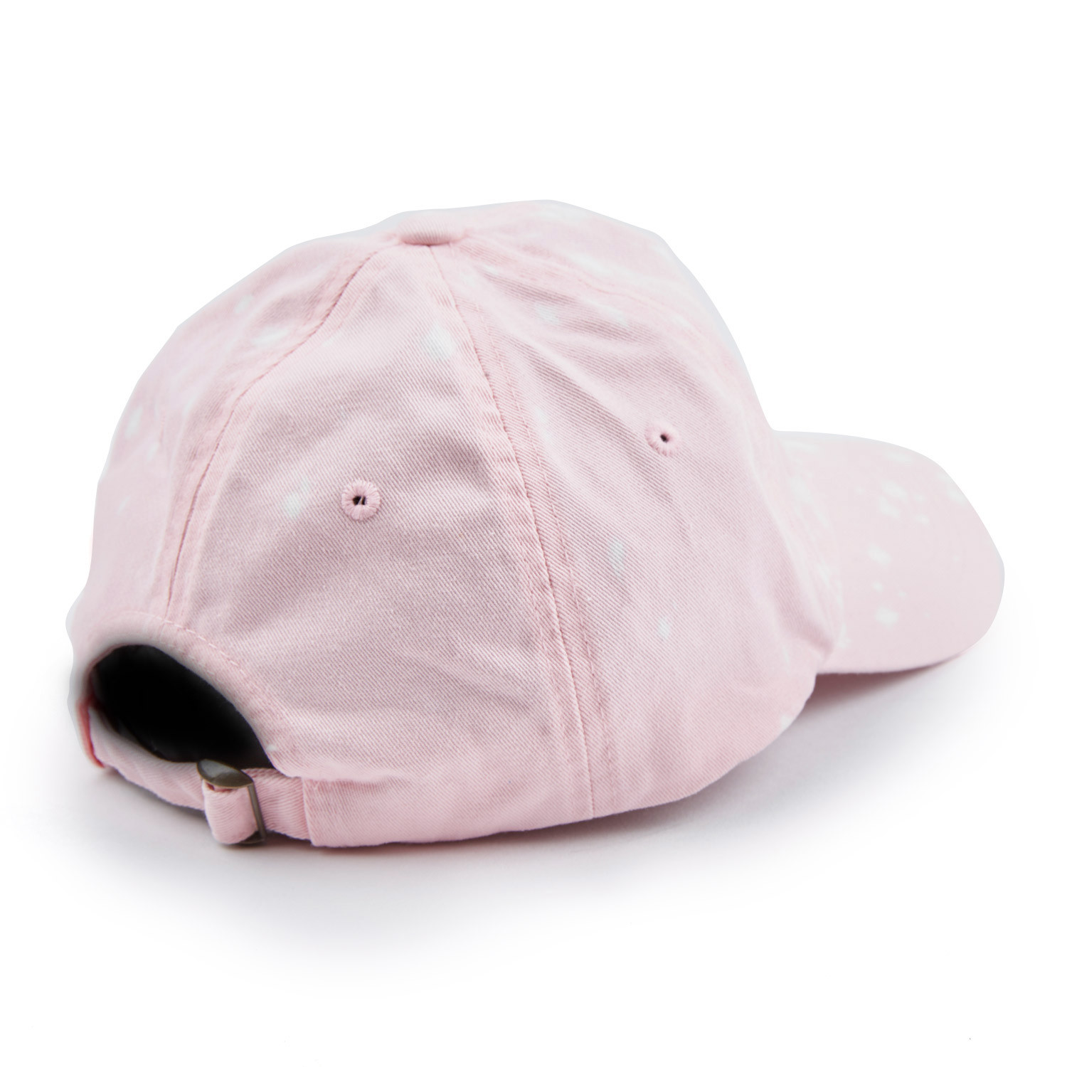 The Splatter Dad Hat has an unstructured bleached design with embroidered eyelets, a naturally curved bill, and an adjustable strapback for a more personalized fit.