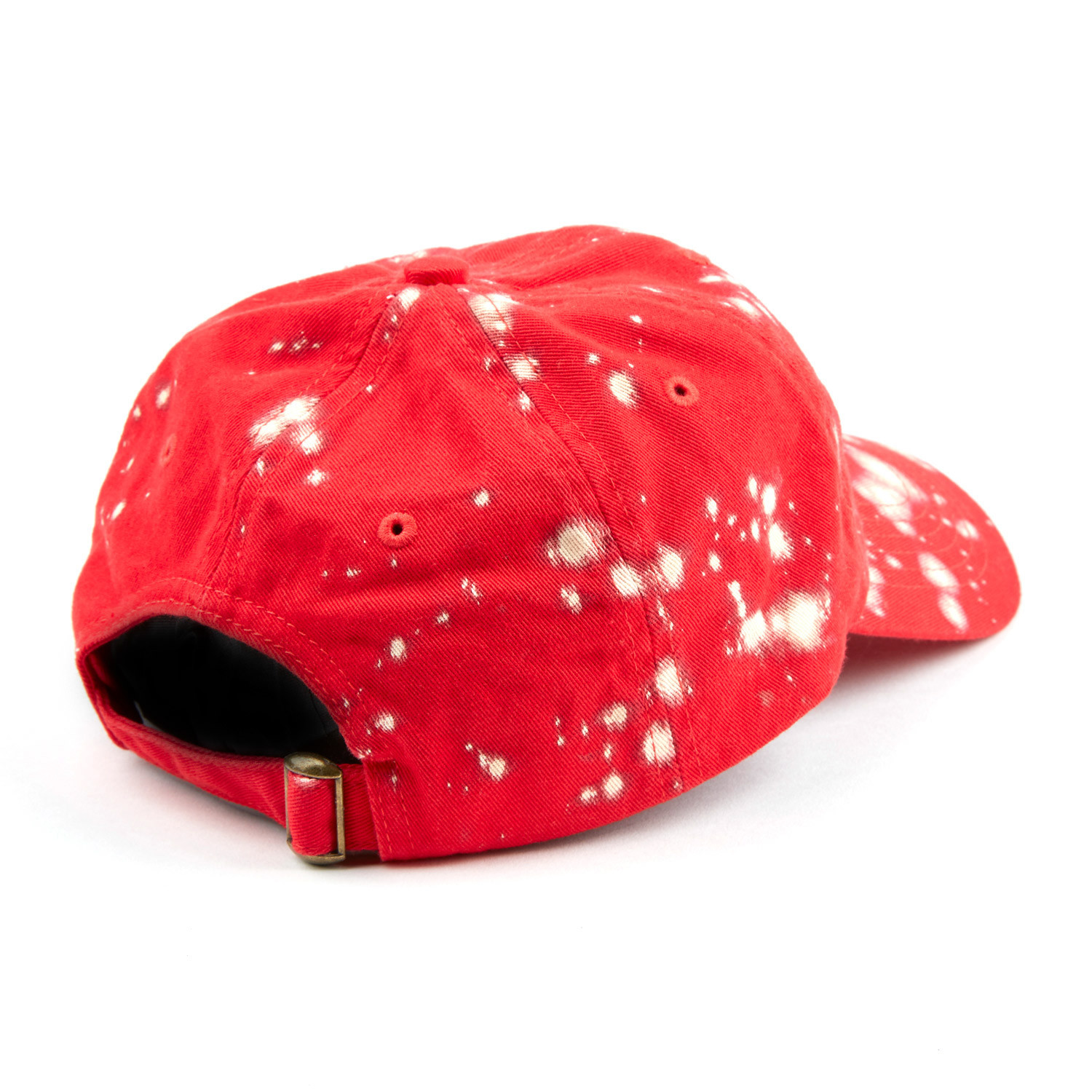 The Splatter Dad Hat has an unstructured bleached design with embroidered eyelets, a naturally curved bill, and an adjustable strapback for a more personalized fit.