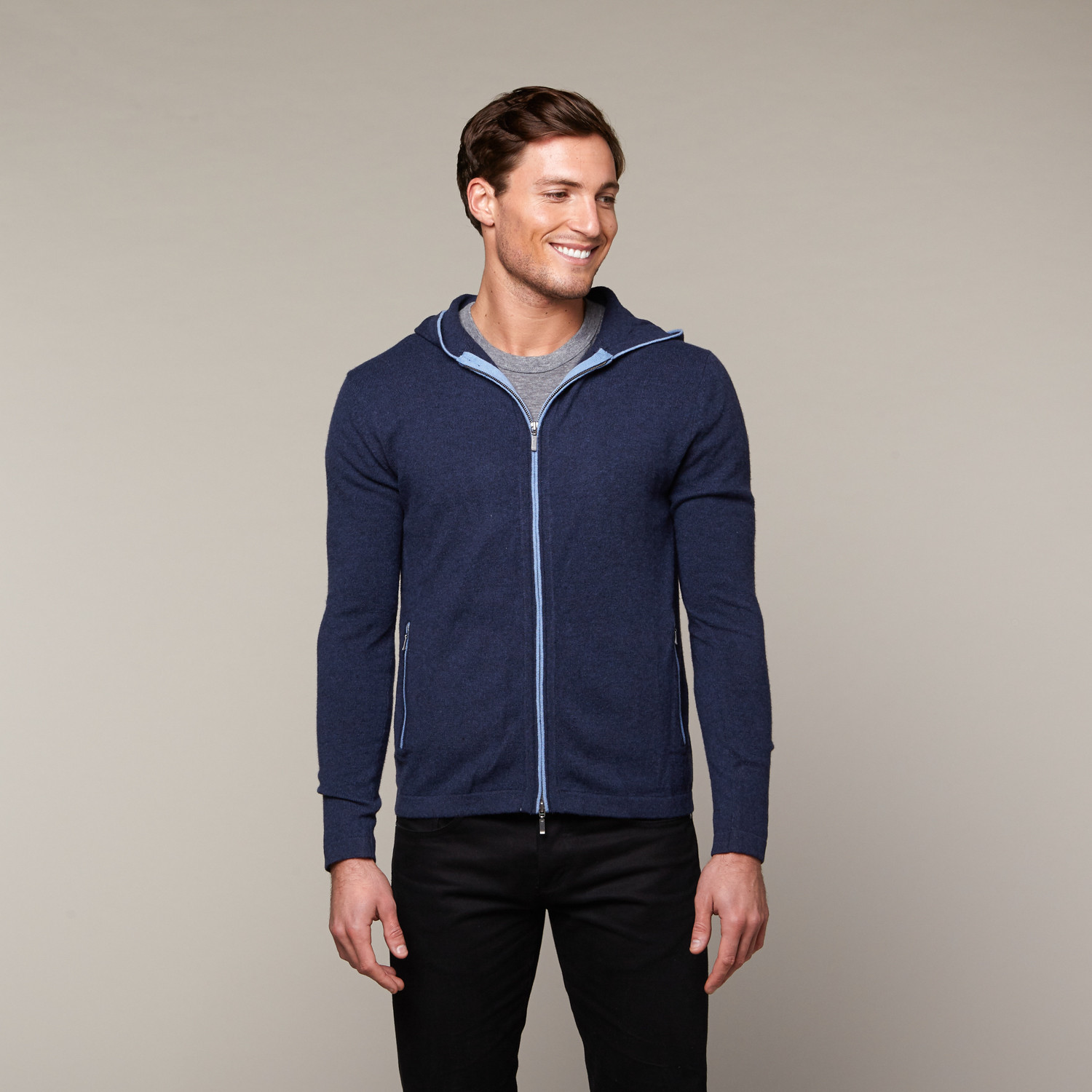 The Caruso Cashmere Hoodie is a fantastic essential to have on hand this winter. Done in cashmere with contrast piping and a zipped side pockets, it's a little laid-back and supremely versatile.