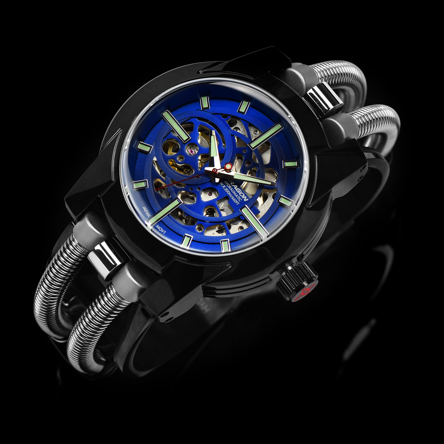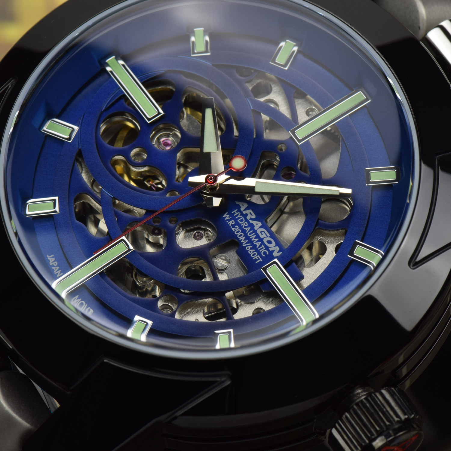 The ARAGON Hydraumatic 46 Skeleton Automatic Limited Edition features a Japanese automatic movement, skeleton dial, and a motorcycle inspired cuff bracelet. The hours are marked with Superluminova markers, and the watch is water resistant up to 660 feet.