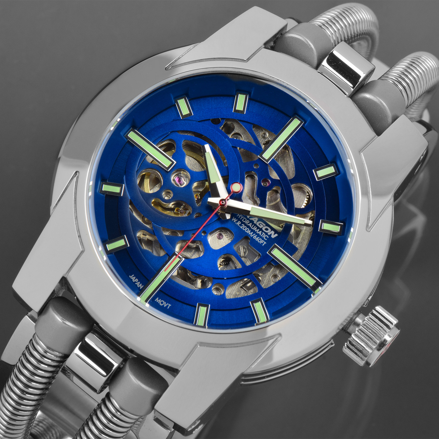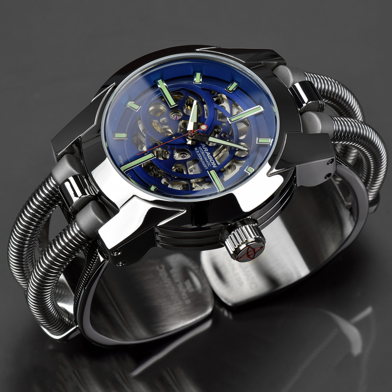 The ARAGON Hydraumatic 46 Skeleton Automatic Limited Edition features a Japanese automatic movement, skeleton dial, and a motorcycle inspired cuff bracelet. The hours are marked with Superluminova markers, and the watch is water resistant up to 660 feet.