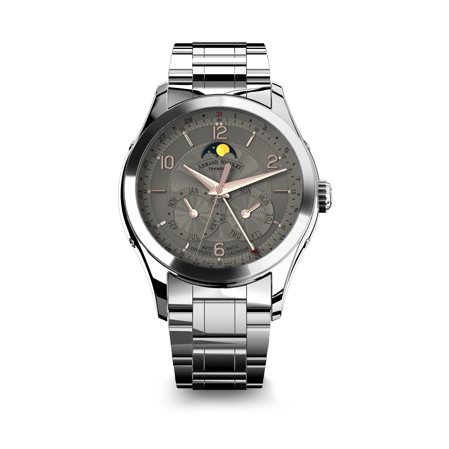 The Armand Nicolet M02 Automatic is the star of a sophisticated and timeless line. The goal was to create a collection that wows the public with a look that integrates the present day trends of the market for a bigger face. It's a beautiful classic that features increased readability thanks to the bigger outlook. The original concept that a few years ago inspired the first version of this family hasn't changed, but the Maison this time has focused particularly on comfort. In order to make the watch as comfortable as possible on a man's wrist the weight has been reduced and also time-telling is now easier, thanks to a revisited dial where Arabic numbers are displayed alternatively to indexes. The crown is decorated with Armand Nicolet's logo.