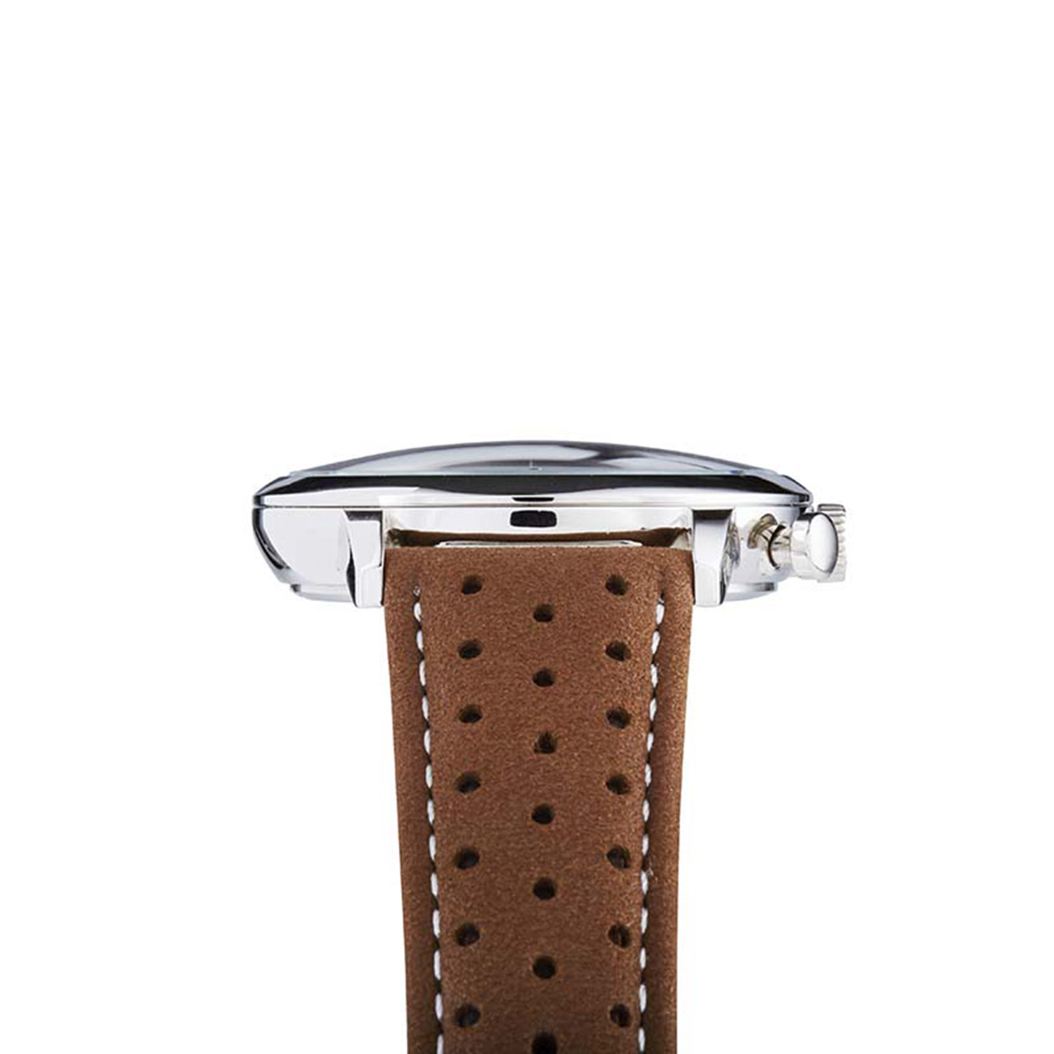 Eye-catching yet resilient, the Le Mans Collection pays homage to the height of auto racing in the mid 20th century. Courageous and dignified, this 2-dial chronograph features a domed mineral crystal, Miyota OS00 Chronograph movement, and a slim stainless steel case. The back of the case is etched with a vintage wheel rim and the contrast-stitched, perforated suede strap beautifully echoes the leather interiors of racing cars of the past.