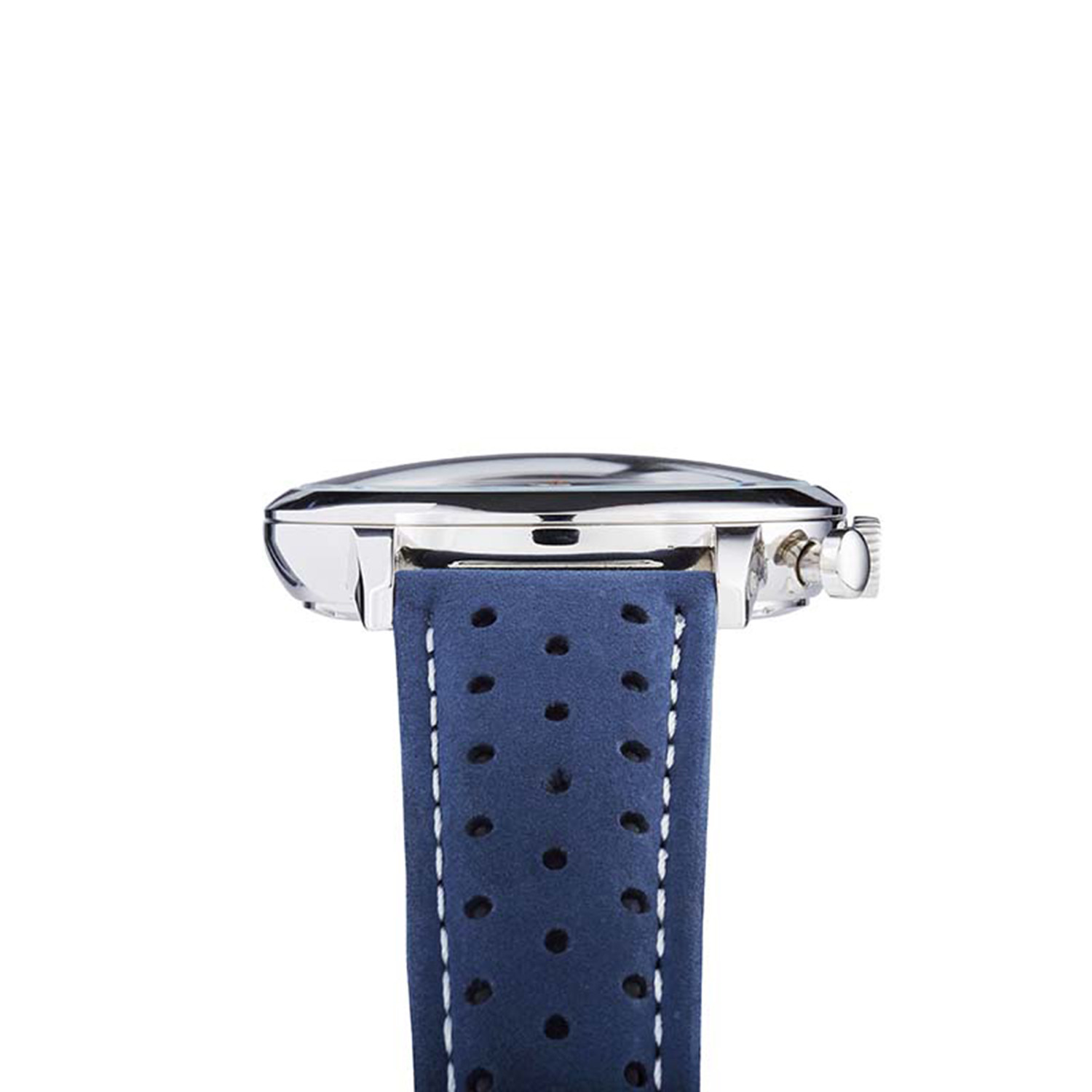 Eye-catching yet resilient, the Le Mans Collection pays homage to the height of auto racing in the mid 20th century. Courageous and dignified, this 2-dial chronograph features a domed mineral crystal, Miyota OS00 Chronograph movement, and a slim stainless steel case. The back of the case is etched with a vintage wheel rim and the contrast-stitched, perforated suede strap beautifully echoes the leather interiors of racing cars of the past.