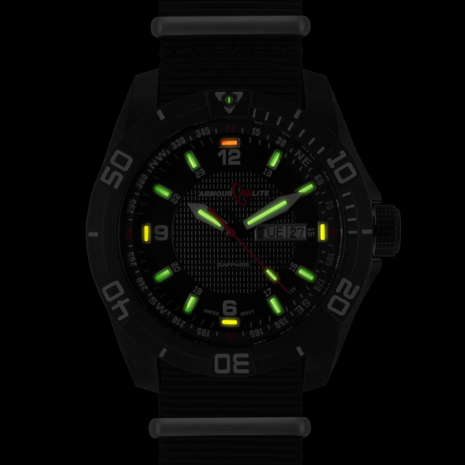 This Armourlite Navigator Series Quartz AL1001 watch features a Swiss Ronda 507 quartz movement, anti-reflective scratch-resistant sapphire crystal and an impressive 45 month battery. It comes with a comfortable Nitrile Butadiene Rubber (NBR) black band and lights up with green, orange, and yellow tritium markers.