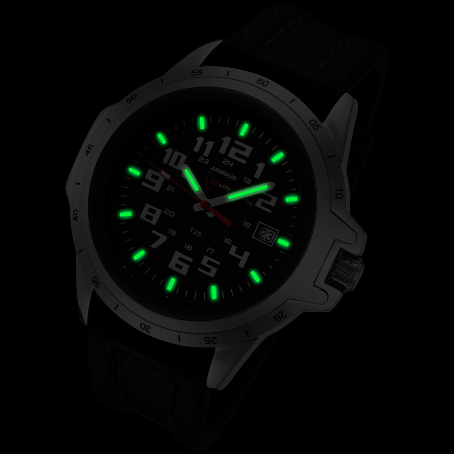 This Armourlite Professional Series Chronograph is a tactical timepiece with a quartz movement, trillium gas tube illumination and incredible shatterproof durability. The stainless steel body sits on a leather band that adds tough luxury to this look, which translates to the everyday with ease.