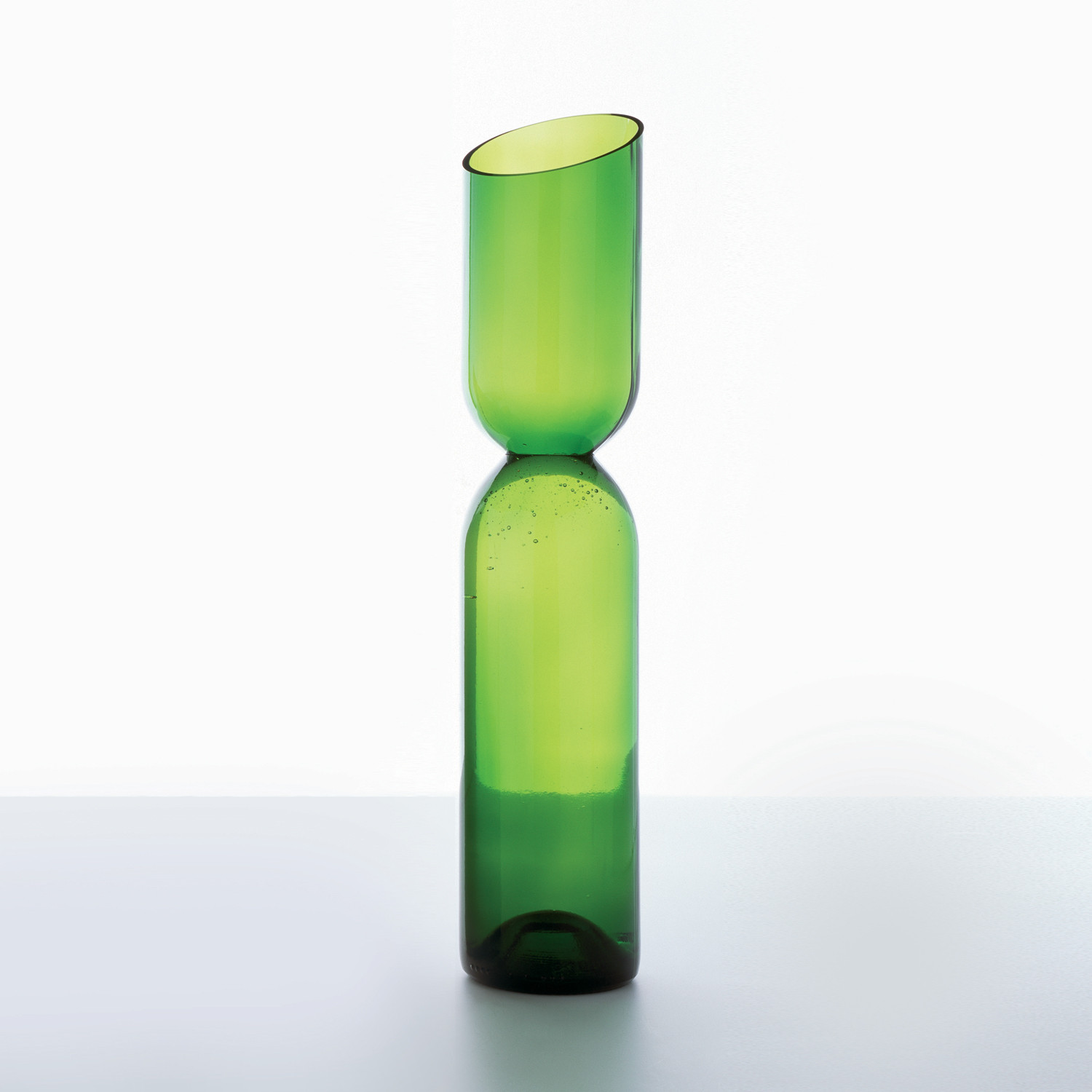 Since its launch, the tranSglass series has become one of Artecnica’s best-sellers. With its recycled origins and sleek, fluid design, this Transglass Double Vase conveys a positive attitude towards the environment, combining old-world craftsmanship, recycled wine bottles, and sophisticated design. The tranSglass series is included in the permanent collection of MoMa New York, but each piece sent to you will be its own unique one-of-a-kind piece. Each color is pre-sorted in shades of green, clear and brown by the artisans for your surprise and enjoyment.