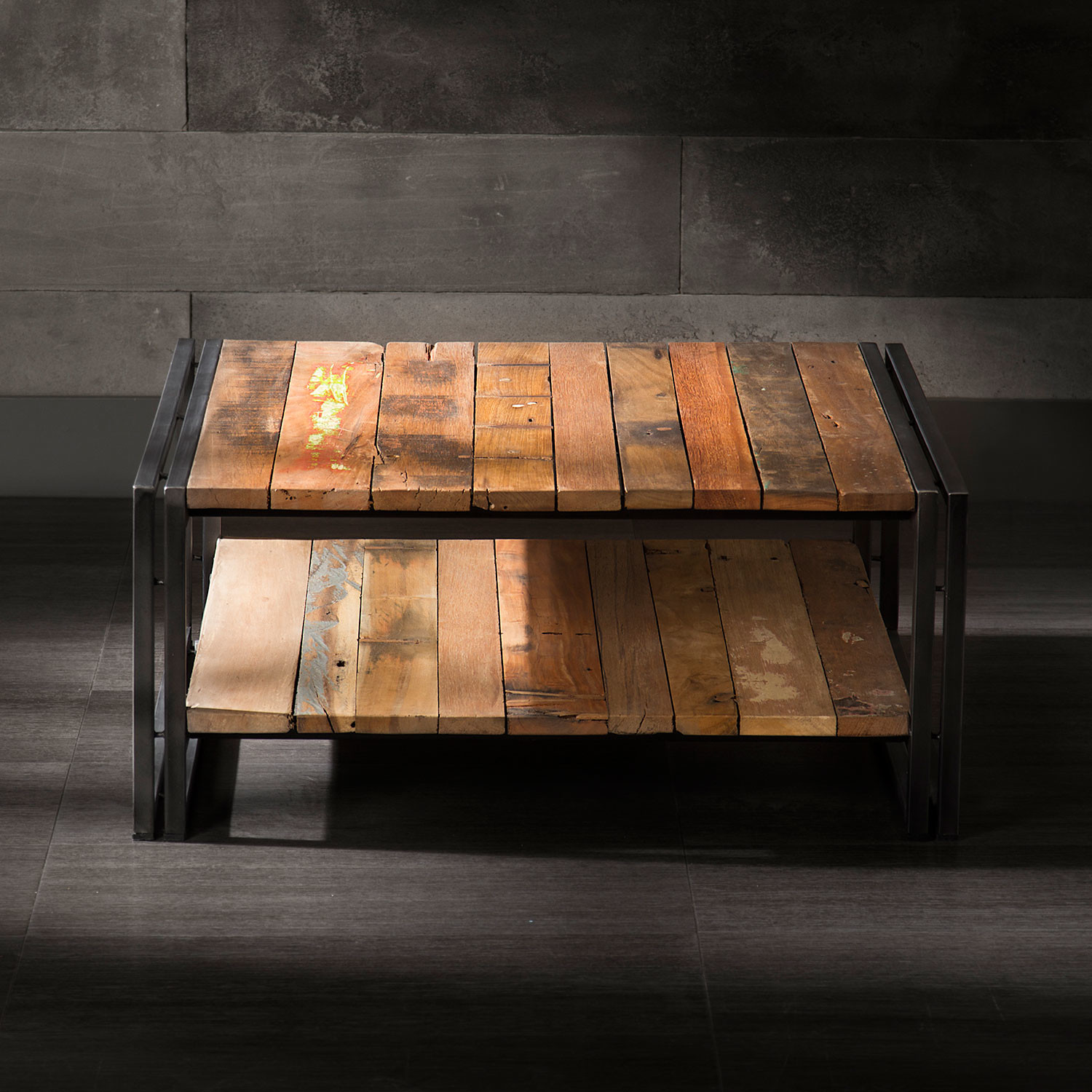 The tabletop and shelf of this unique coffee table are meticulously hand assembled with pieces of durable wood once used in the construction of old fishing boats that worked the Strait of Malacca. The vibrant, pastel colored recycled wood of this coffee table jumps out next to its sleek black metal legs.