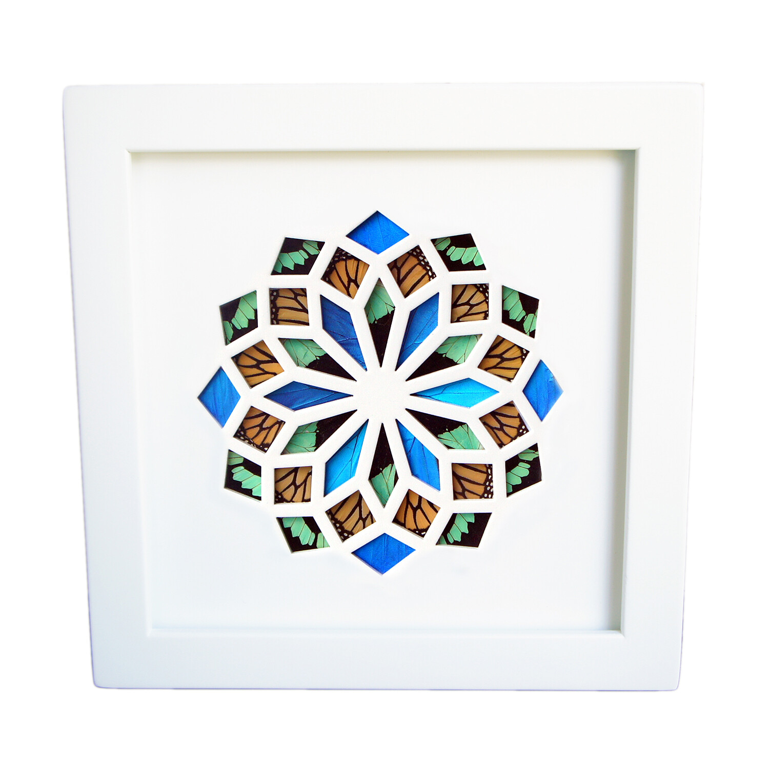 Real butterfly wings are given new life through this stunning butterfly wing kaleidoscope display. Each piece is proudly handcrafted in Salt Lake, Utah where the butterfly wings are delicately hand cut and permanently secured within the kaleidoscope window frame. Each wing has its own unique color pigment, shimmer, and slight flaws, allowing you to rediscover the beauty of nature in a new way. This display can hang on a wall or stand on a shelf to serve as a one of a kind accent piece sure to spark plenty of conversations.