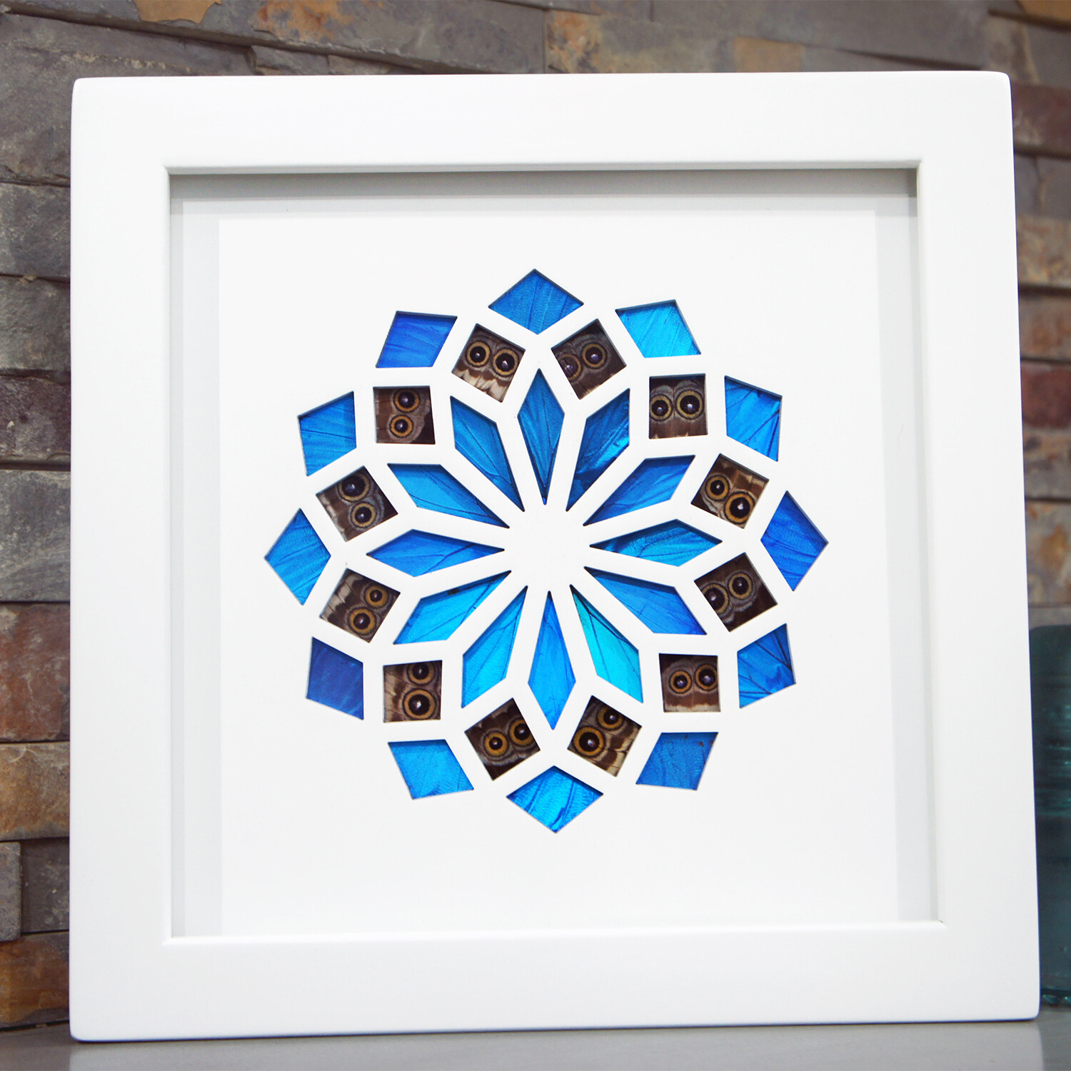 Real butterfly wings are given new life through this stunning butterfly wing kaleidoscope display. Each piece is proudly handcrafted in Salt Lake, Utah where the butterfly wings are delicately hand cut and permanently secured within the kaleidoscope window frame. Each wing has its own unique color pigment, shimmer, and slight flaws, allowing you to rediscover the beauty of nature in a new way. This display can hang on a wall or stand on a shelf to serve as a one of a kind accent piece sure to spark plenty of conversations.