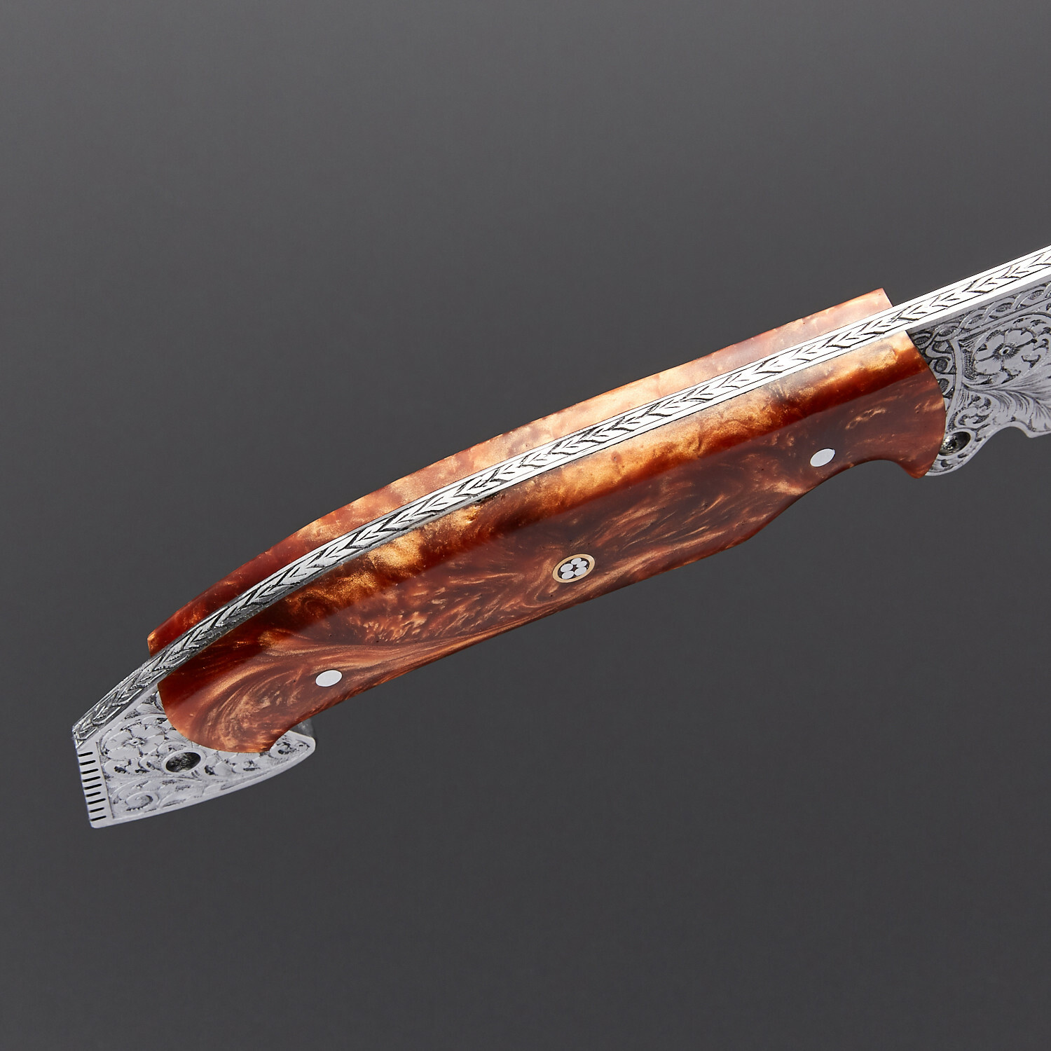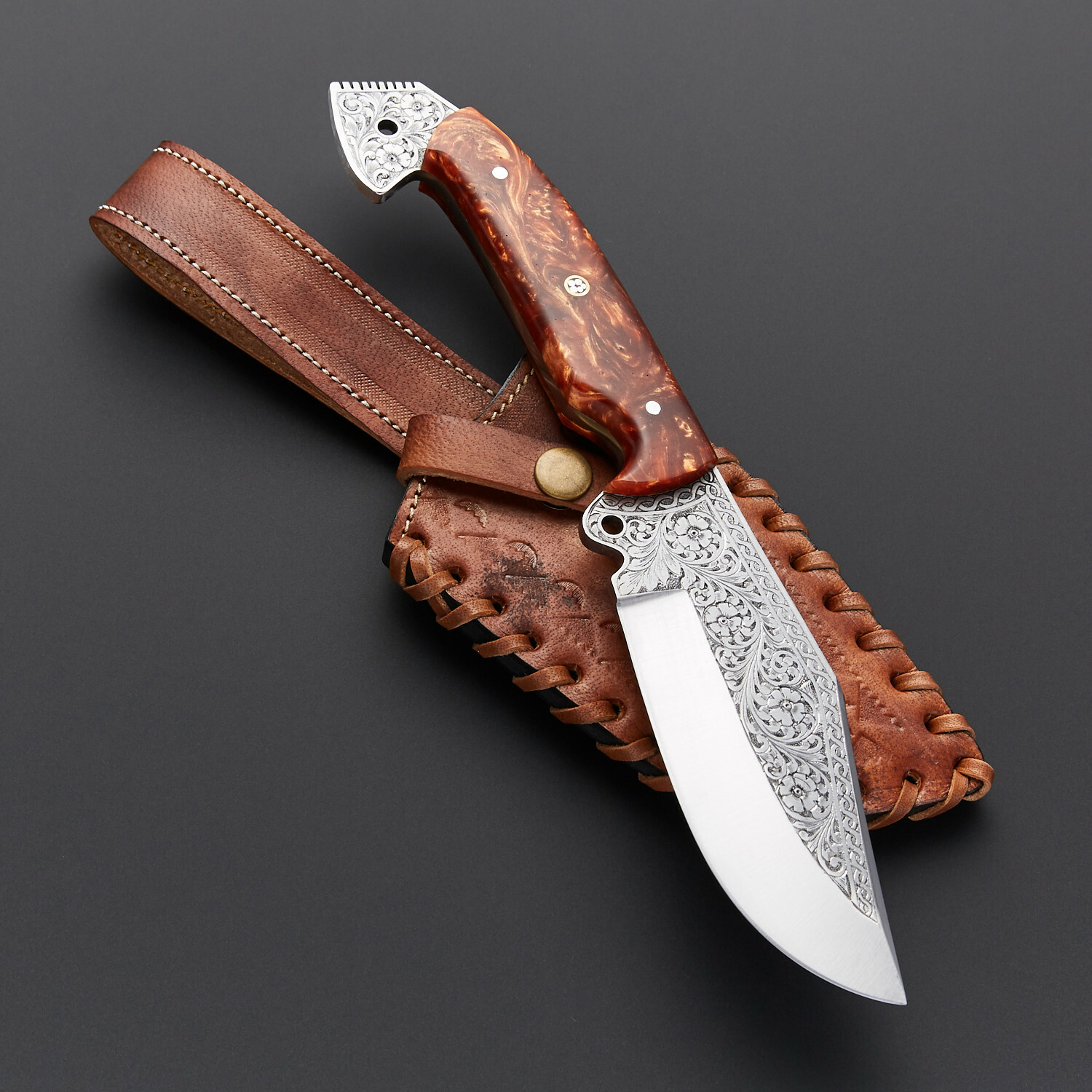This is your right hand on the hunt, on the job, or on the go. This knife is tough as nails, and gorgeous to boot. The beautiful knife comes with a razor sharp cutting edge and a leather sheath.