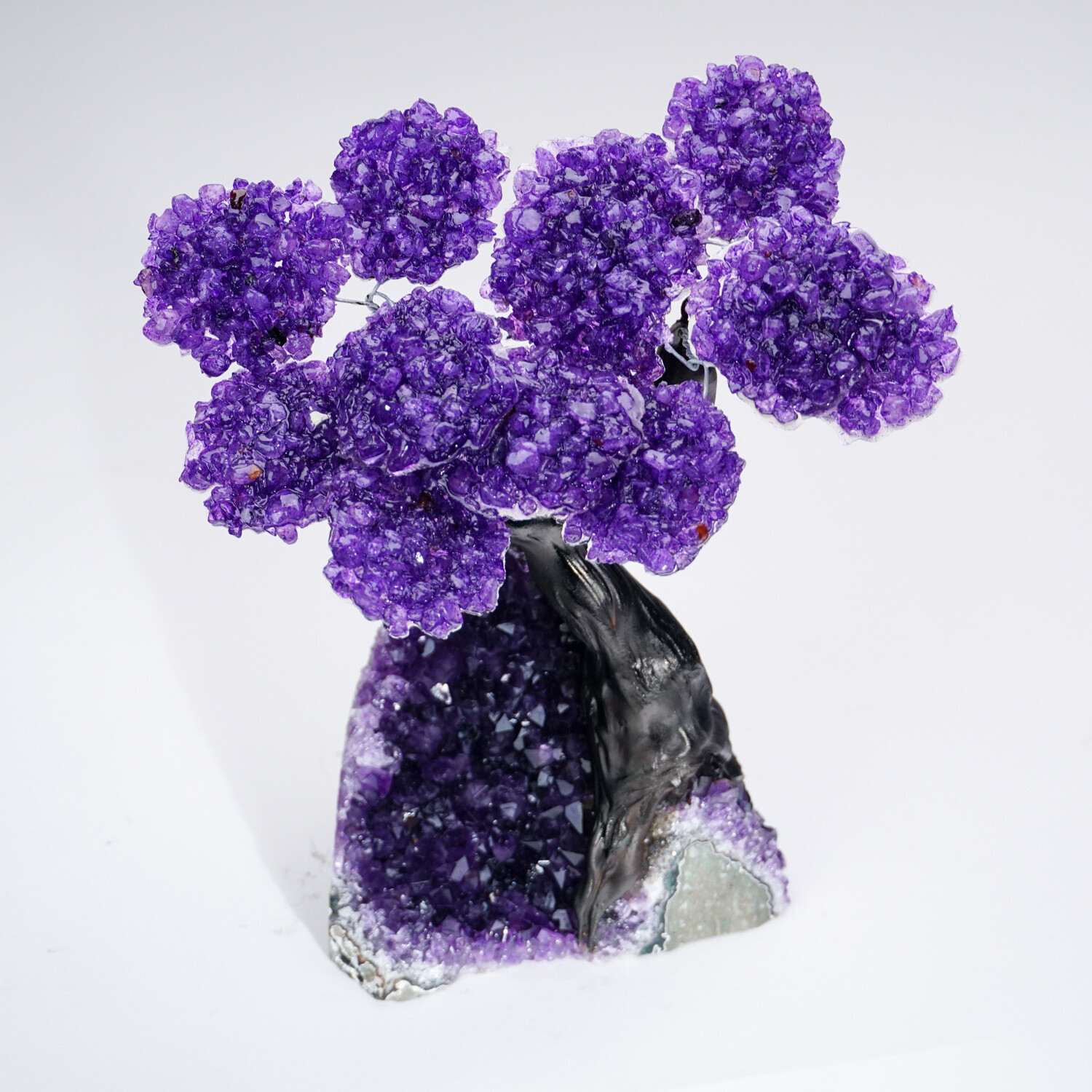 Custom genuine Amethyst clustered gemstone tree with faux tree trunk set on Amethyst crystal cluster lined matrix - handmade in Brazil "The Protection Tree" makes for a great gift and a beautiful display item in any room. Our trees are hand-made by Brazilian artisans. Each tree is individually crafted. Each base is hand selected by the artist, prior to development and construction. Each trunk is individually designed and hand painted. Amethyst is a very powerful and protective crystal. A natural stress reliever, Amethyst can encourage inner strength.