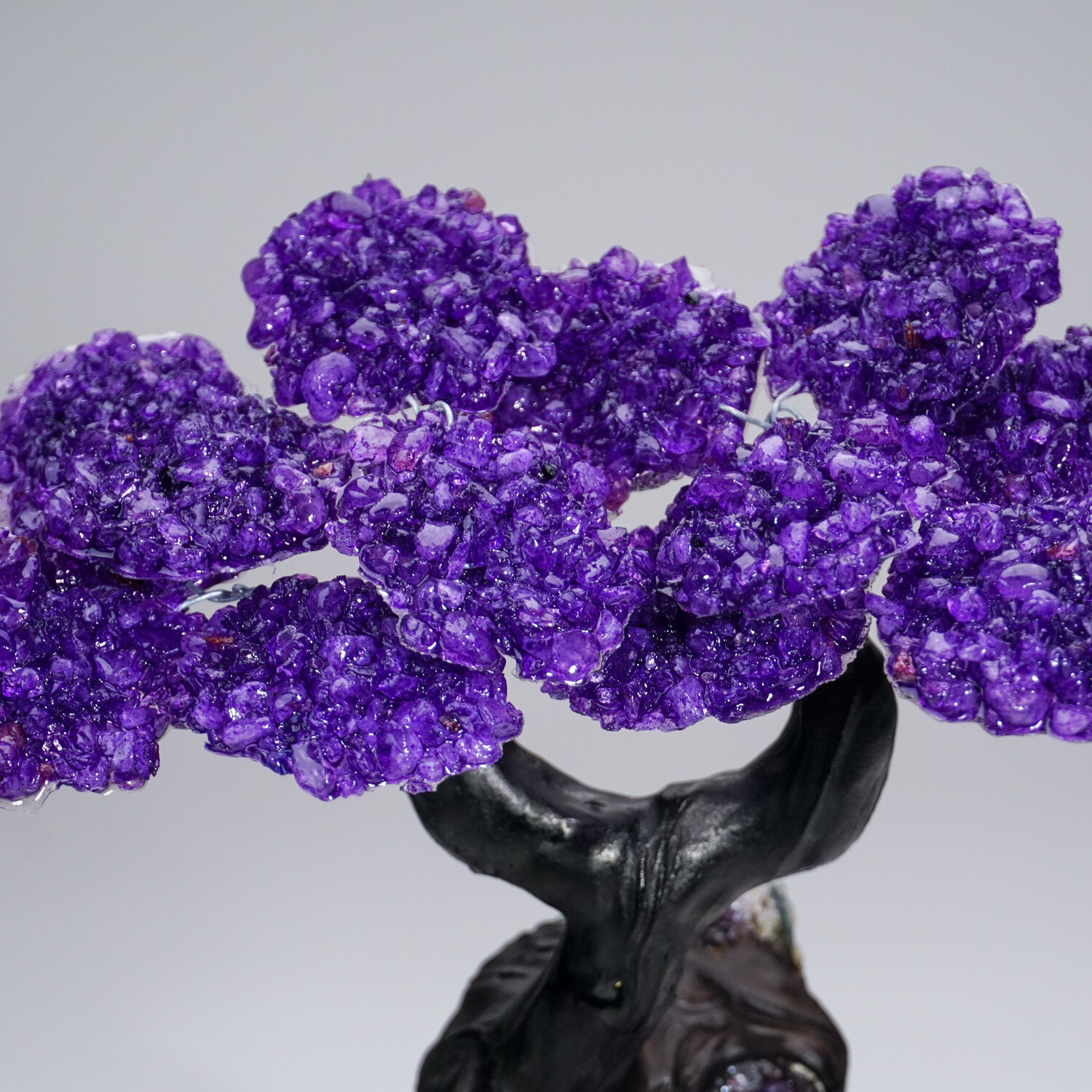 Custom genuine Amethyst clustered gemstone tree with faux tree trunk set on Amethyst crystal cluster lined matrix - handmade in Brazil "The Protection Tree" makes for a great gift and a beautiful display item in any room. Our trees are hand-made by Brazilian artisans. Each tree is individually crafted. Each base is hand selected by the artist, prior to development and construction. Each trunk is individually designed and hand painted. Amethyst is a very powerful and protective crystal. A natural stress reliever, Amethyst can encourage inner strength.