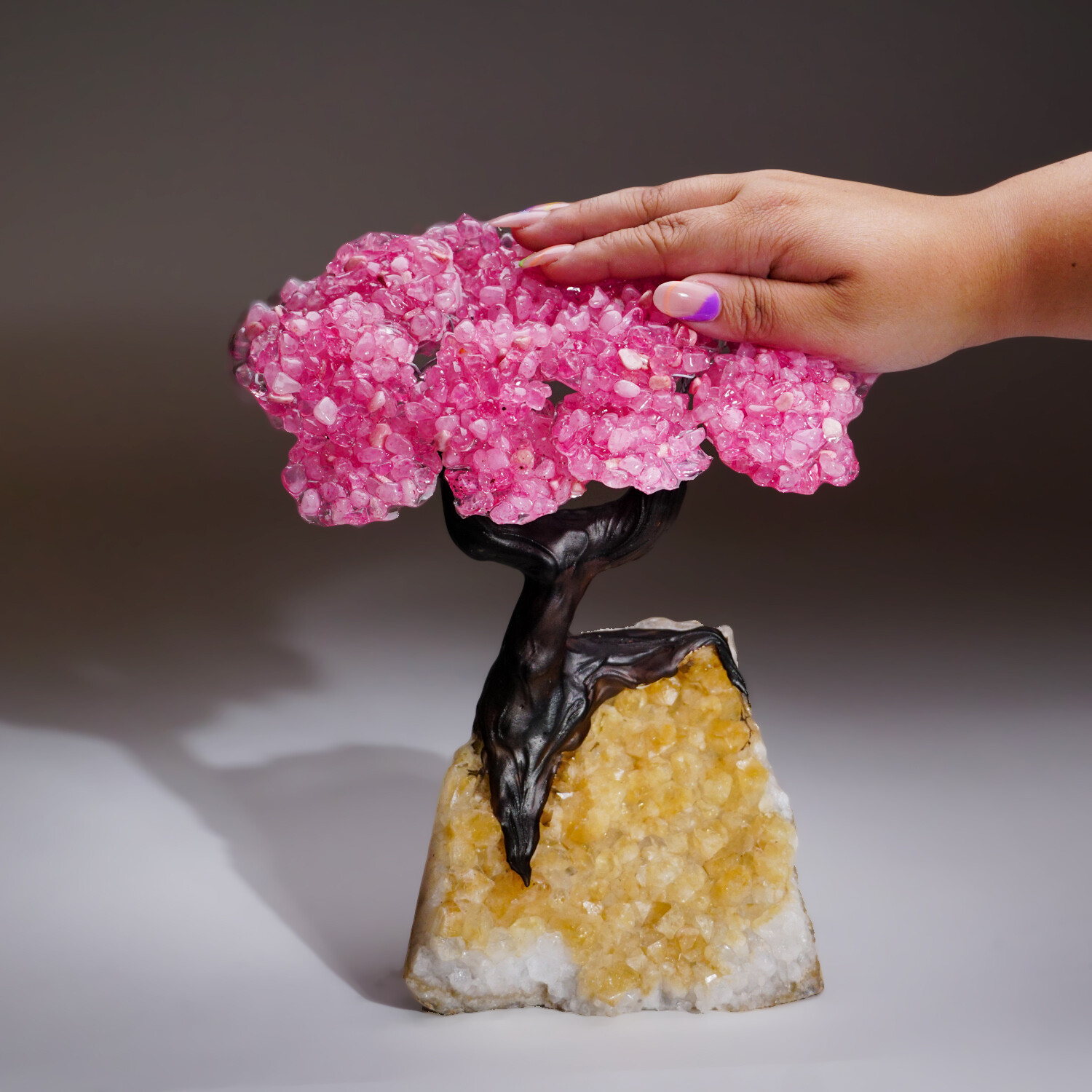 Genuine Rose Quartz clustered gemstone tree with faux tree trunk set on a large Citrine crystal clustered matrix - handmade in Brazil. “The Comfort Tree” makes for a great gift and a beautiful display item in any room. With its Rose Quartz leaves, “The Comfort Tree” increases emotional balance and self-love. When found with a Citrine matrix, this gemstone tree calms anger and stimulates self-esteem.
