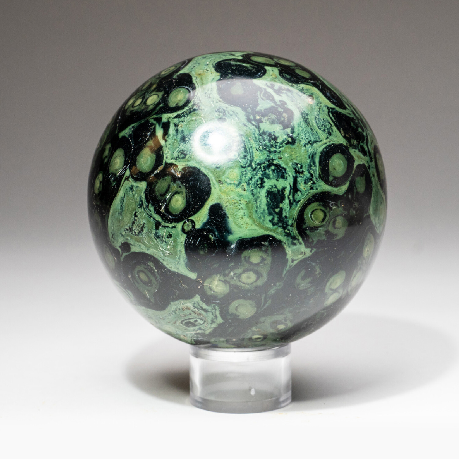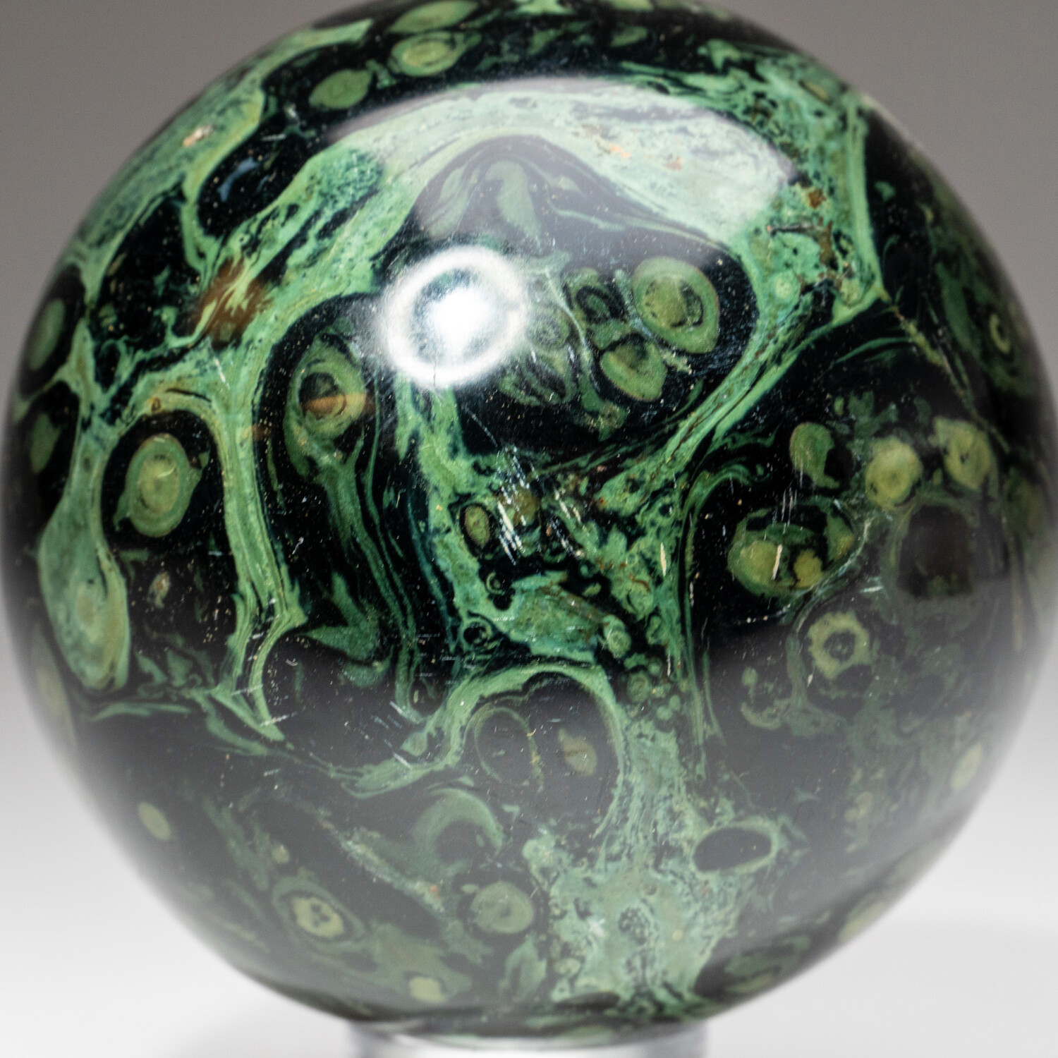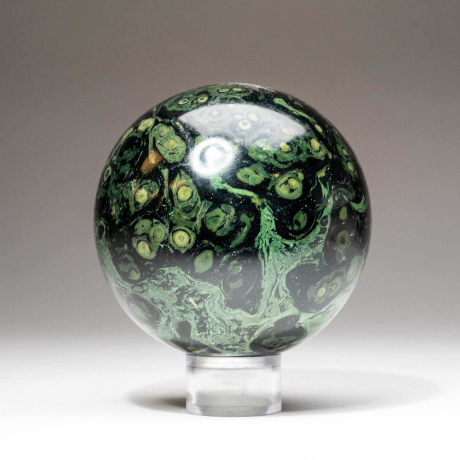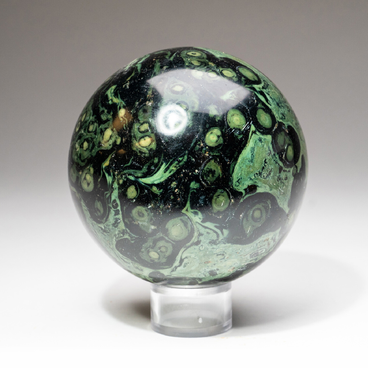 This beautiful Kambab Jasper sphere is hand polished from a solid piece of Kambaba. Kambaba Jasper is also sometimes known as Crocodile Jasper or Kambaba Stone. Kambaba Jasper, a form of orbicular jasper, is also known as Stromatolite Jasper, and contains some of the oldest forms of life beautifully fossilized. It also has an excellent shine, with vibrant color and a unique spherical pattern.