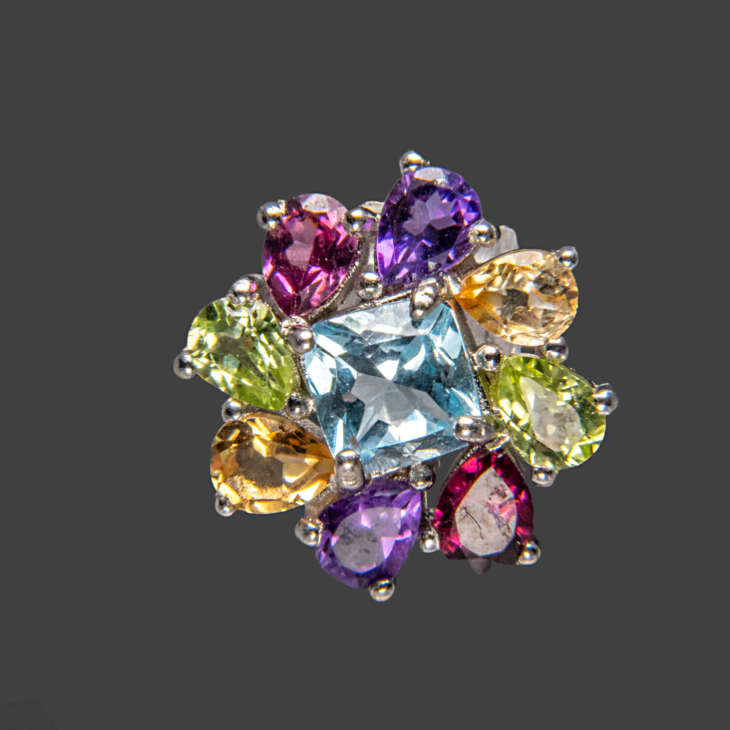 Beautiful high quality 10x15mm multi gemstones in sterling silver earrings adorned with a vibrant mix of amethyst, citrine, peridot, and topaz. The colorful gemstones come together in a radiant design that adds elegance, sparkle, and a playful touch to any jewelry collection.